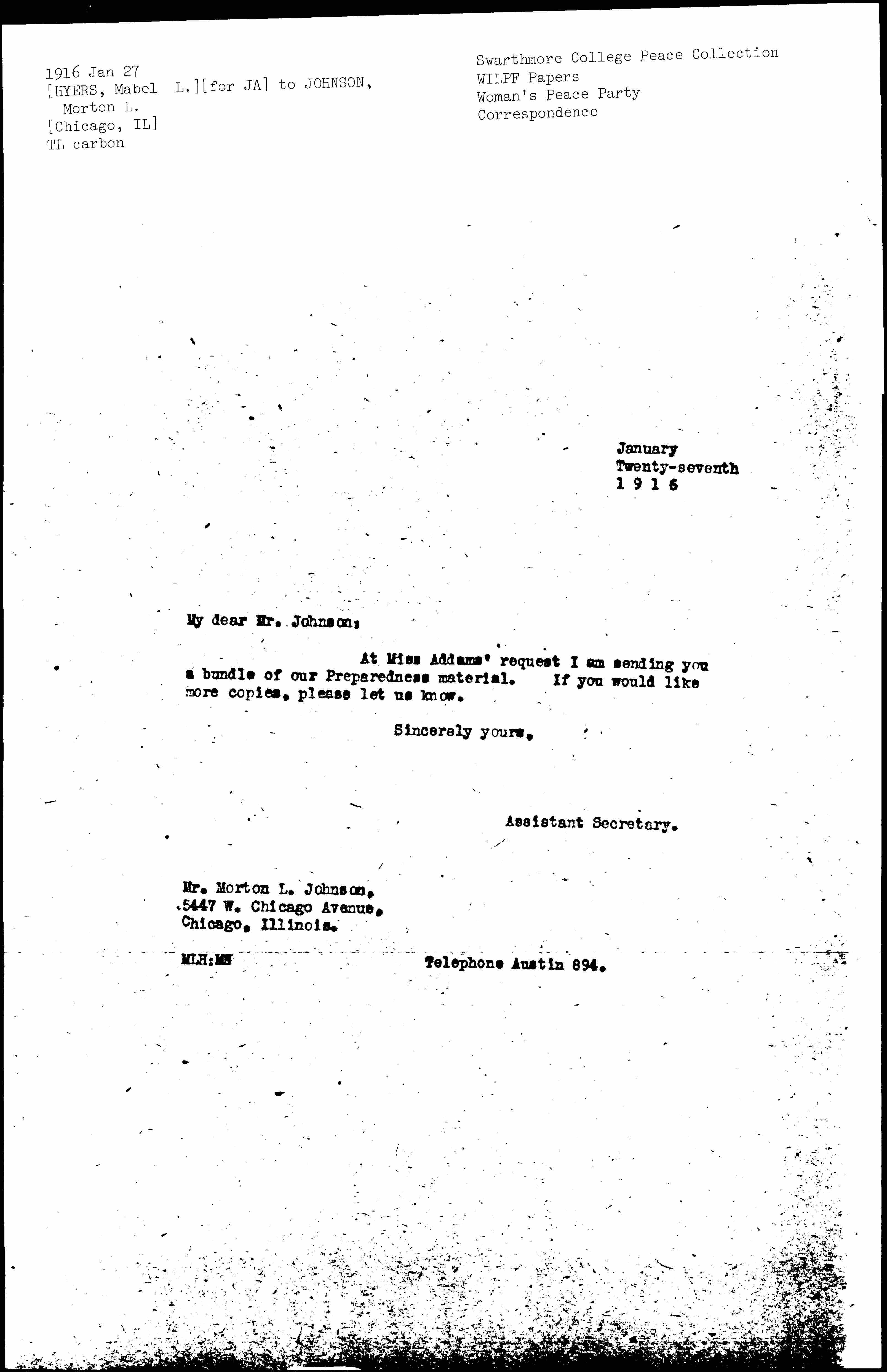 At Miss Addams' request I am sending you a bundle of our Preparedness material. If you would like more copies, please let us know.