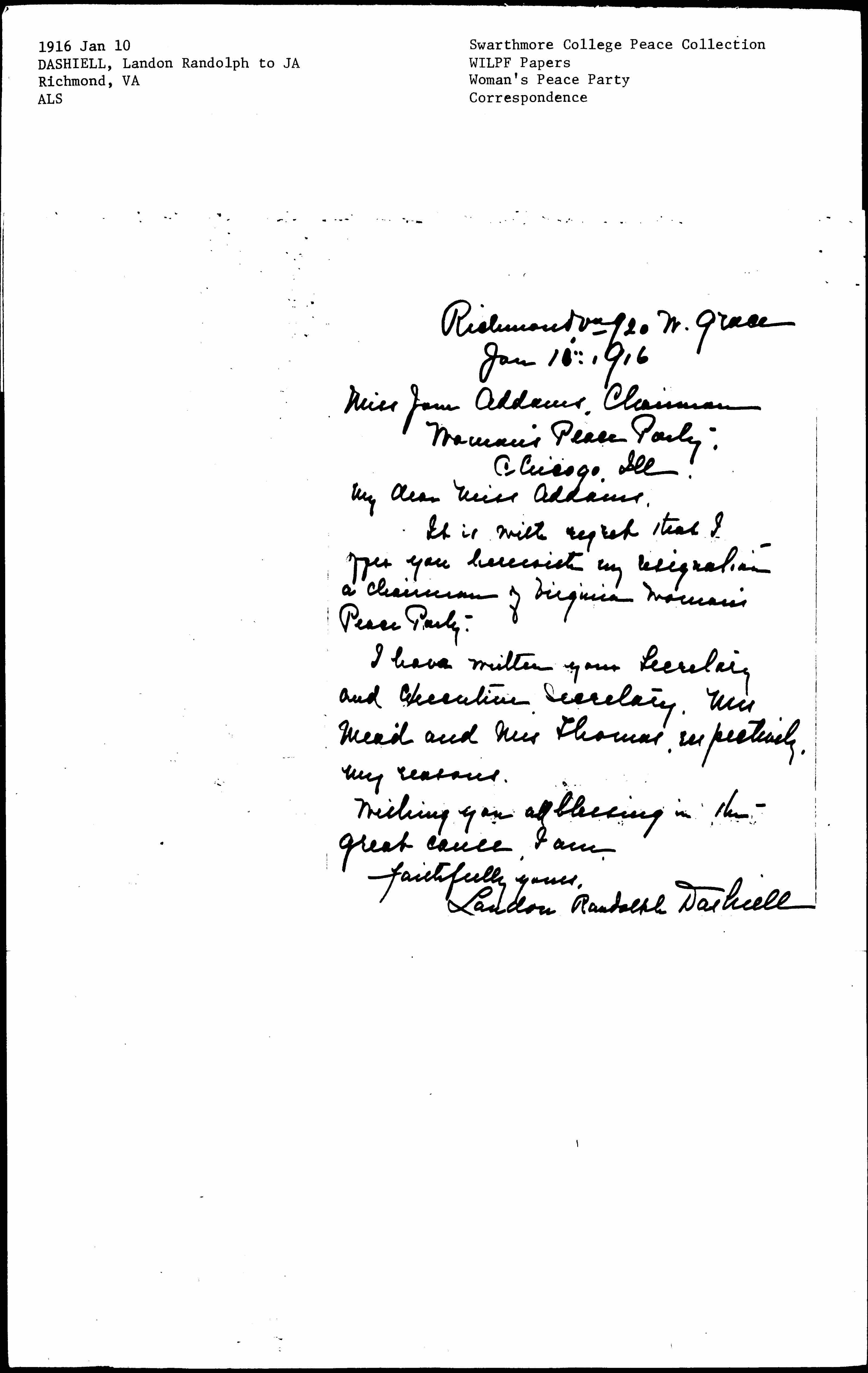 It is with regret that I offer you herewith my resignation [as] chairman of Virginia Woman's Peace Party.