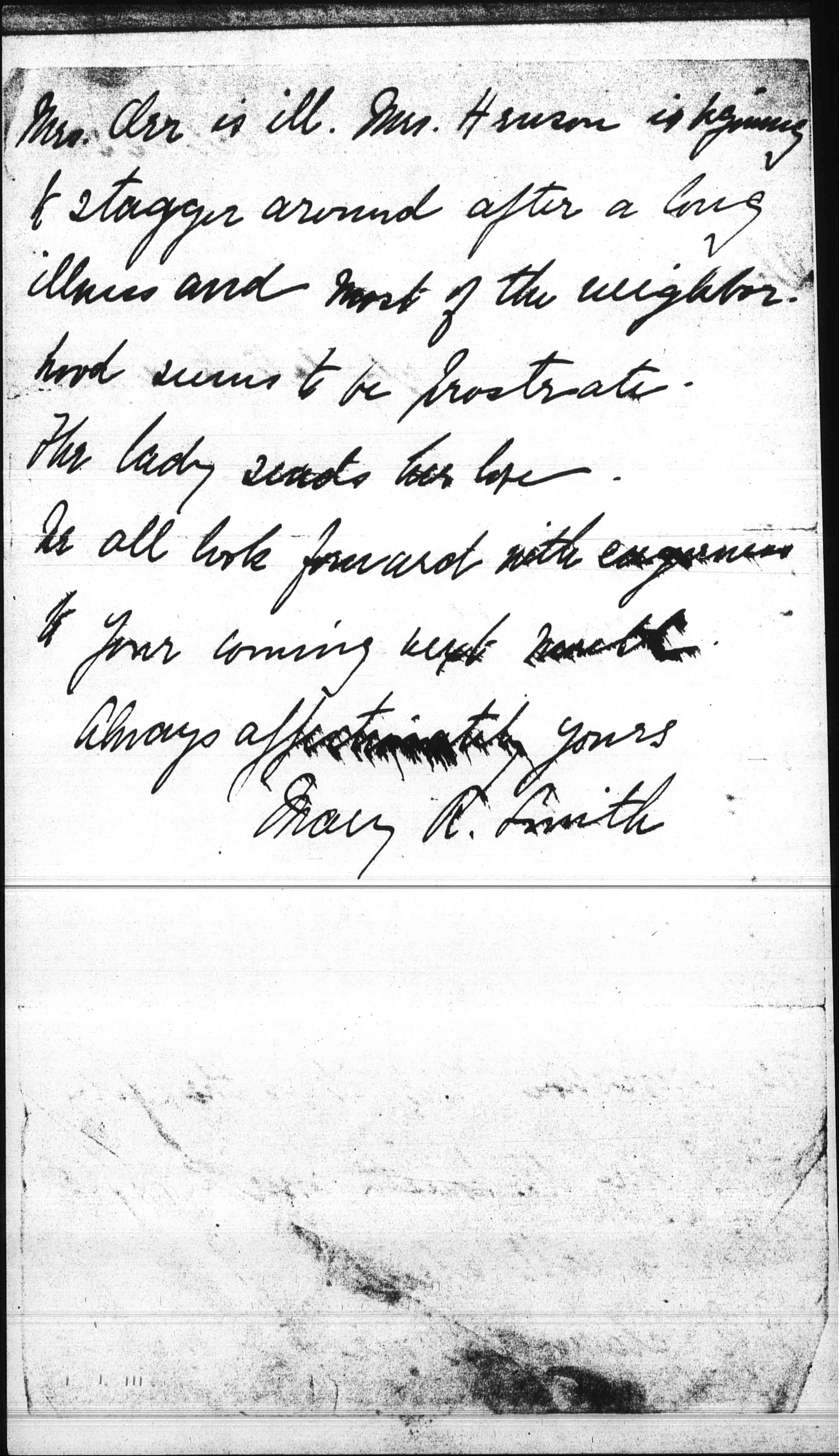 J.A. clamors for me to go calling in the neighborhood. Your friend [page 2] Mrs. Orr is ill. Mrs Henson is beginning to stagger around after a long illness and most of the neighborhood seems to be prostrate.