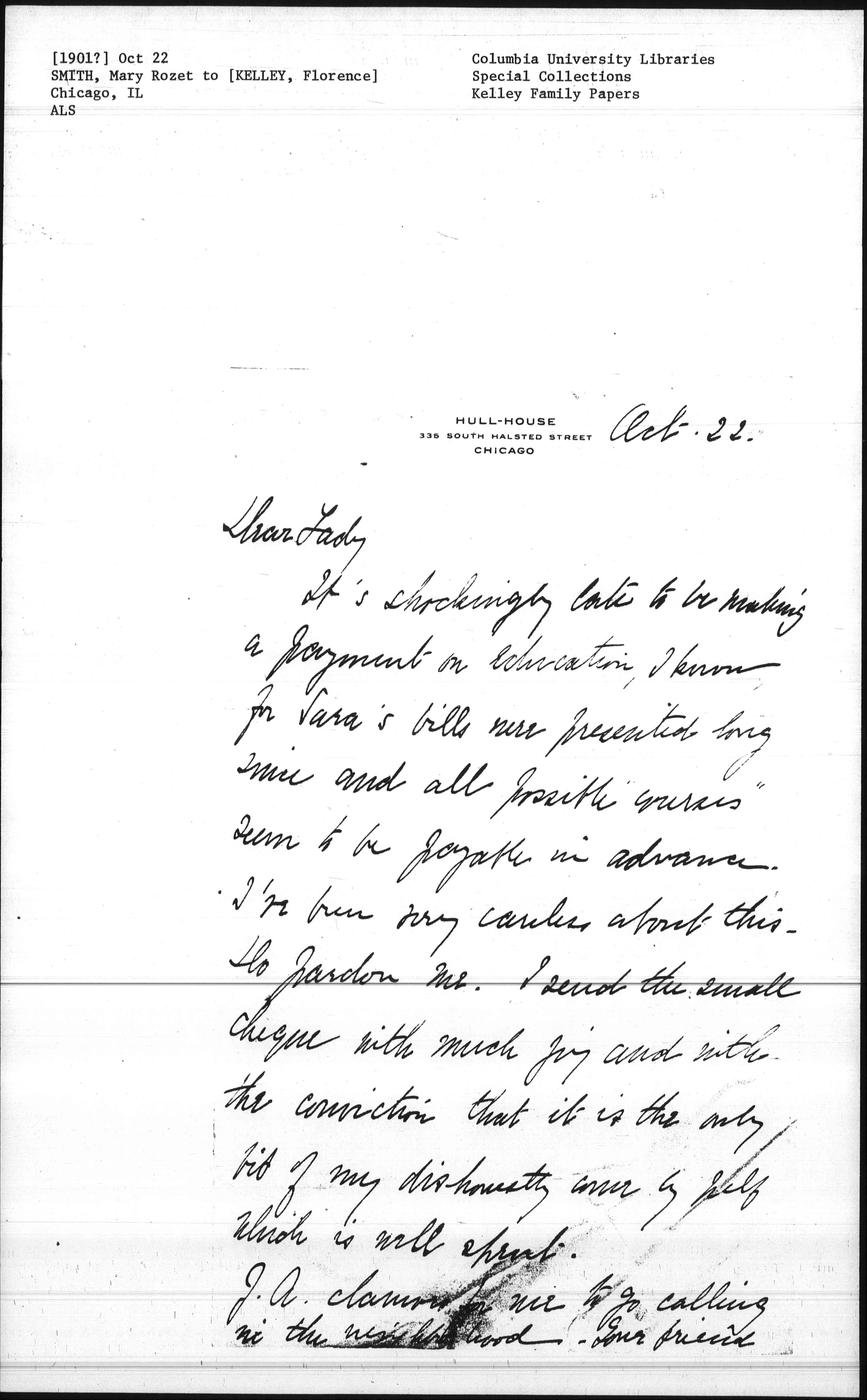 It's shockingly late to be making a payment on education, I know for Sara's bills were presented long since and all possible "courses" seem to be payable in advance. I've been very careless about this. Do pardon me. I send the small [check] with much joy and with the conviction that it is the only bit of my dishonestly come by [help?] which is well spent.