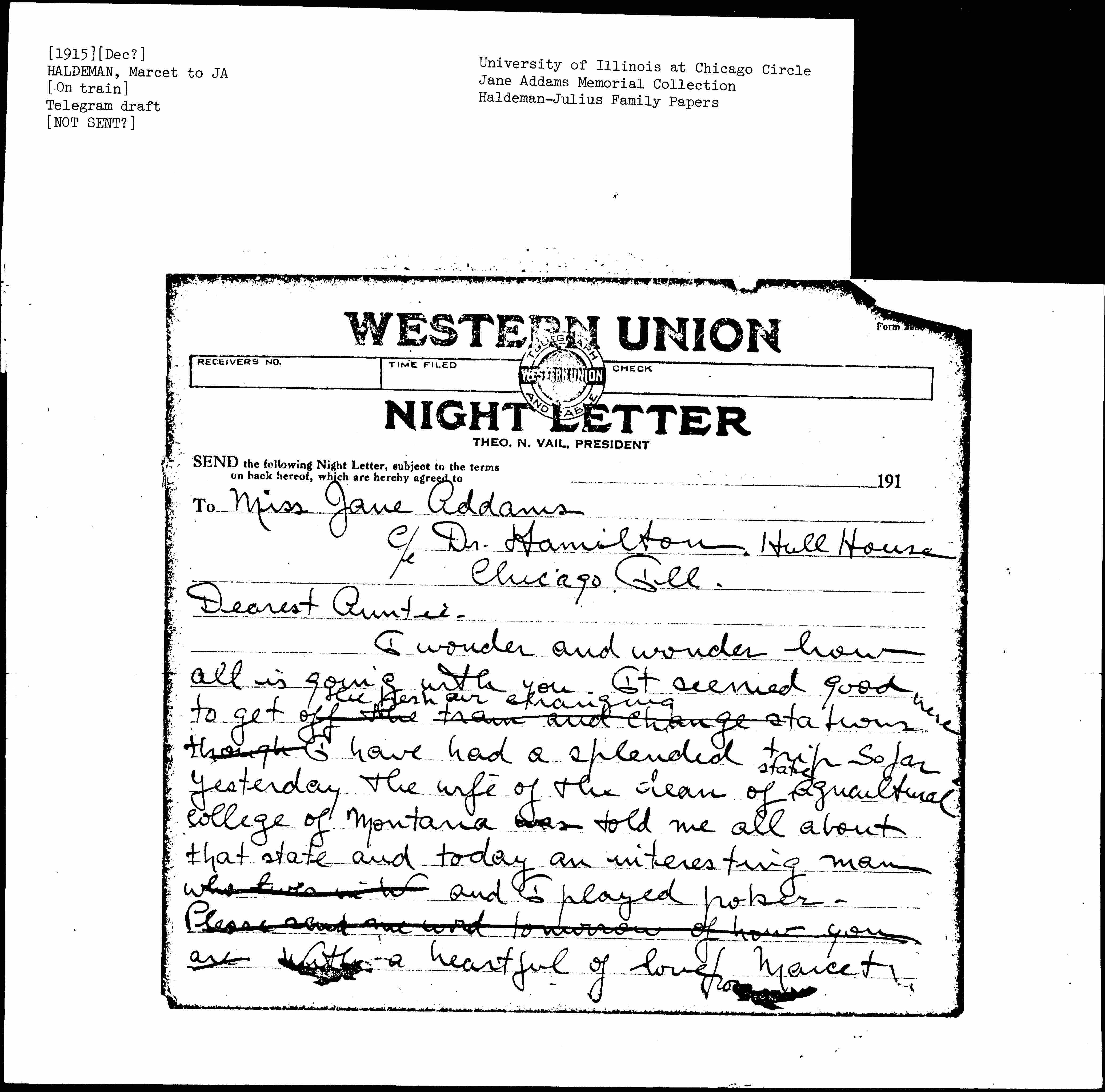 I wonder and wonder how all is going with you. It seemed good to get off the train and change <the fresh air changing> stations <here> though. I have had a splendid trip so far. Yesterday the wife of the dean of <state> agricultural college of Montana was told me all about that state and today an interesting man who lives in W and I played poker -- Please send me word tomorrow of how you are With a [heart full] of love from Marcet