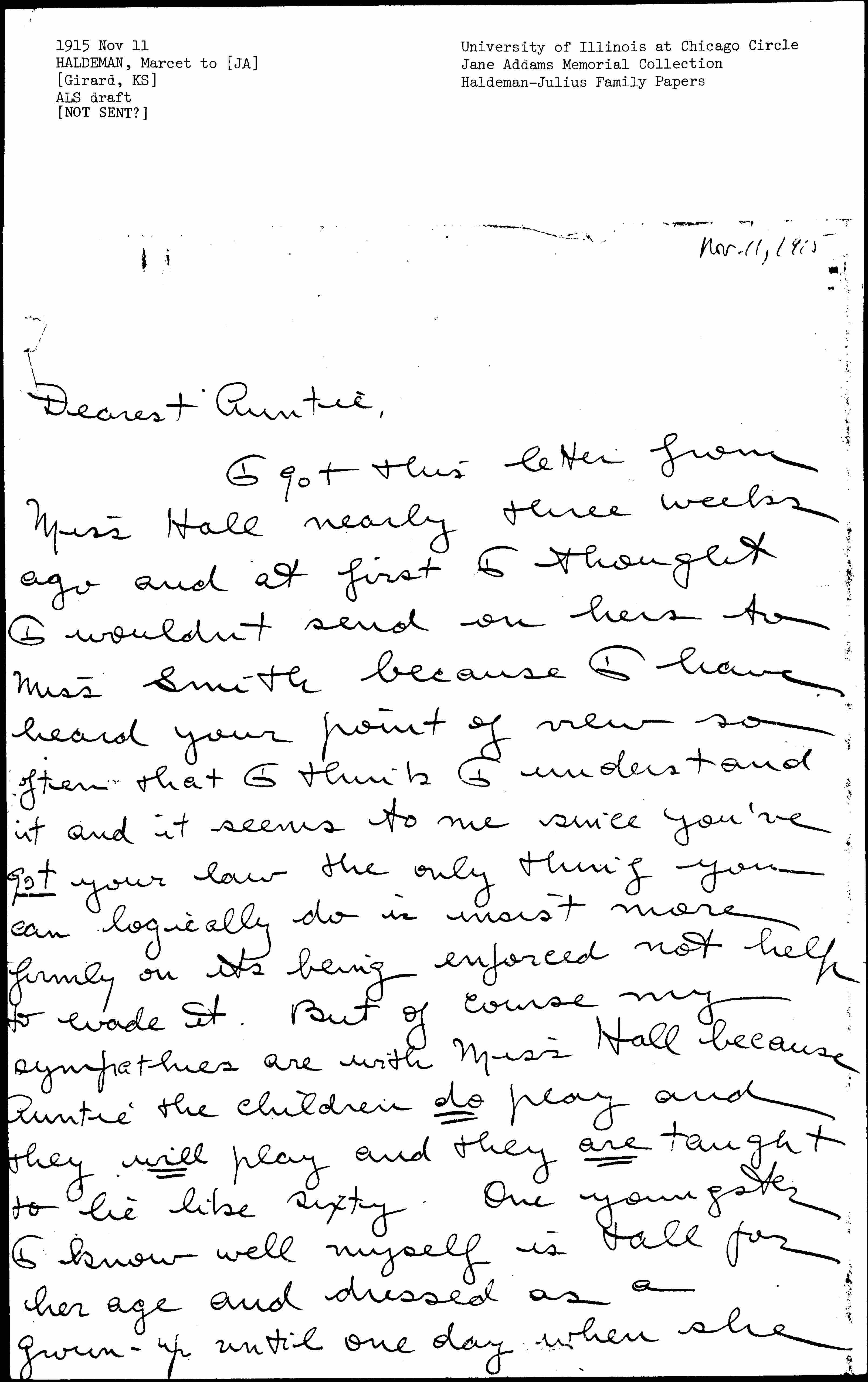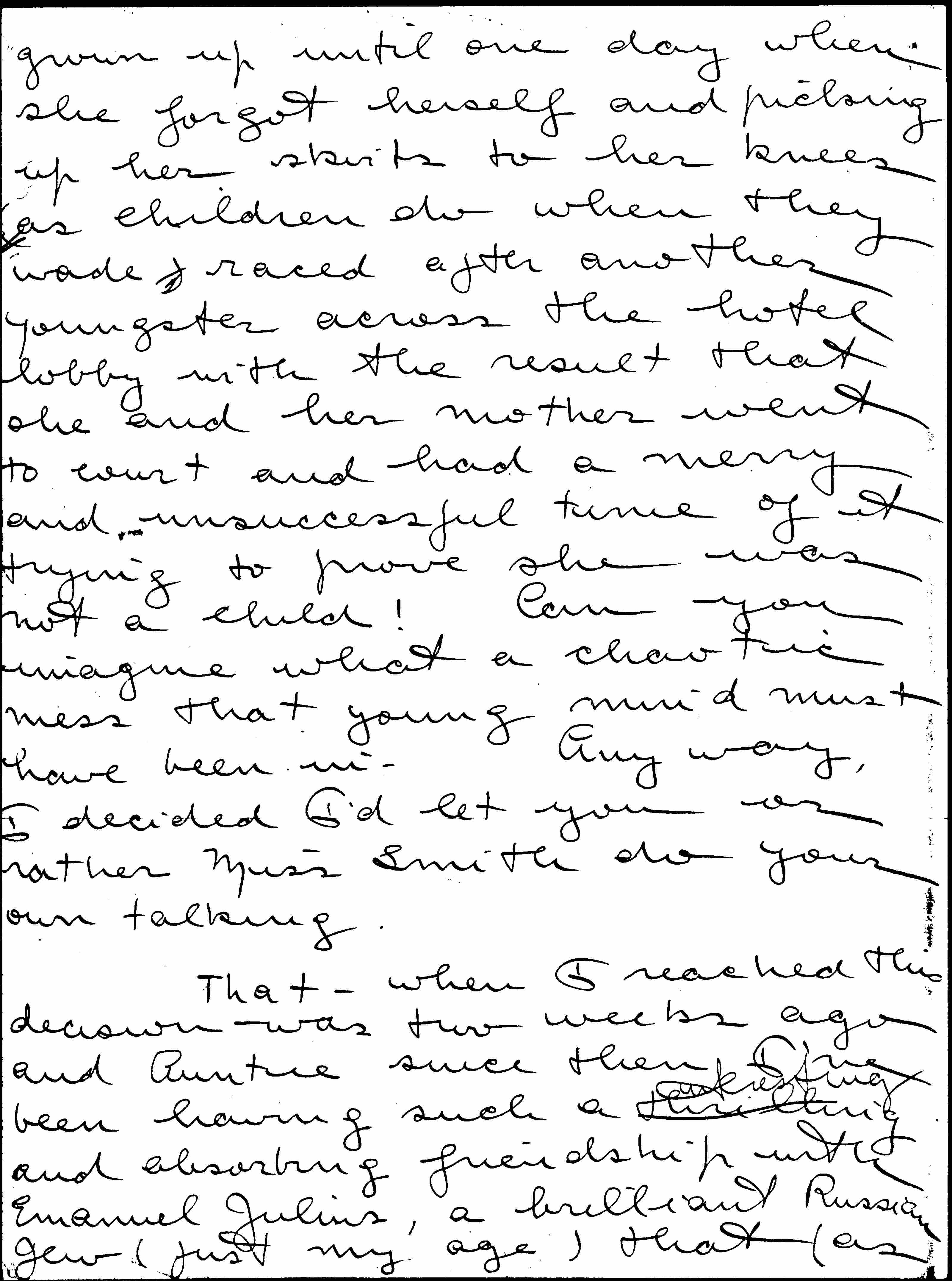 I got this letter from Miss Hall nearly three weeks ago and at first I thought I wouldn't send on hers to Miss Smith because I have heard your point of view so often that I think I understand it and it seems to me since you've got your law the only thing you can logically do is insist more firmly on its being enforced not help to evade it. But of course my sympathies are with Miss Hall because Auntie the children do play and they will play and they are taught to lie like sixty. One youngster I know well myself is tall for her age and dressed as a grown-up until one day when she [page 2] forgot herself and picking up her skirts to her knees (as children do when they wade raced after another youngster across the hotel lobby with the result that she and her mother went to court and had a merry and unsuccessful time of it trying to prove she was not a child! Can you imagine what a chaotic mess that young mind must have been in. Any way, I decided I'd let you or rather Miss Smith do your own talking.