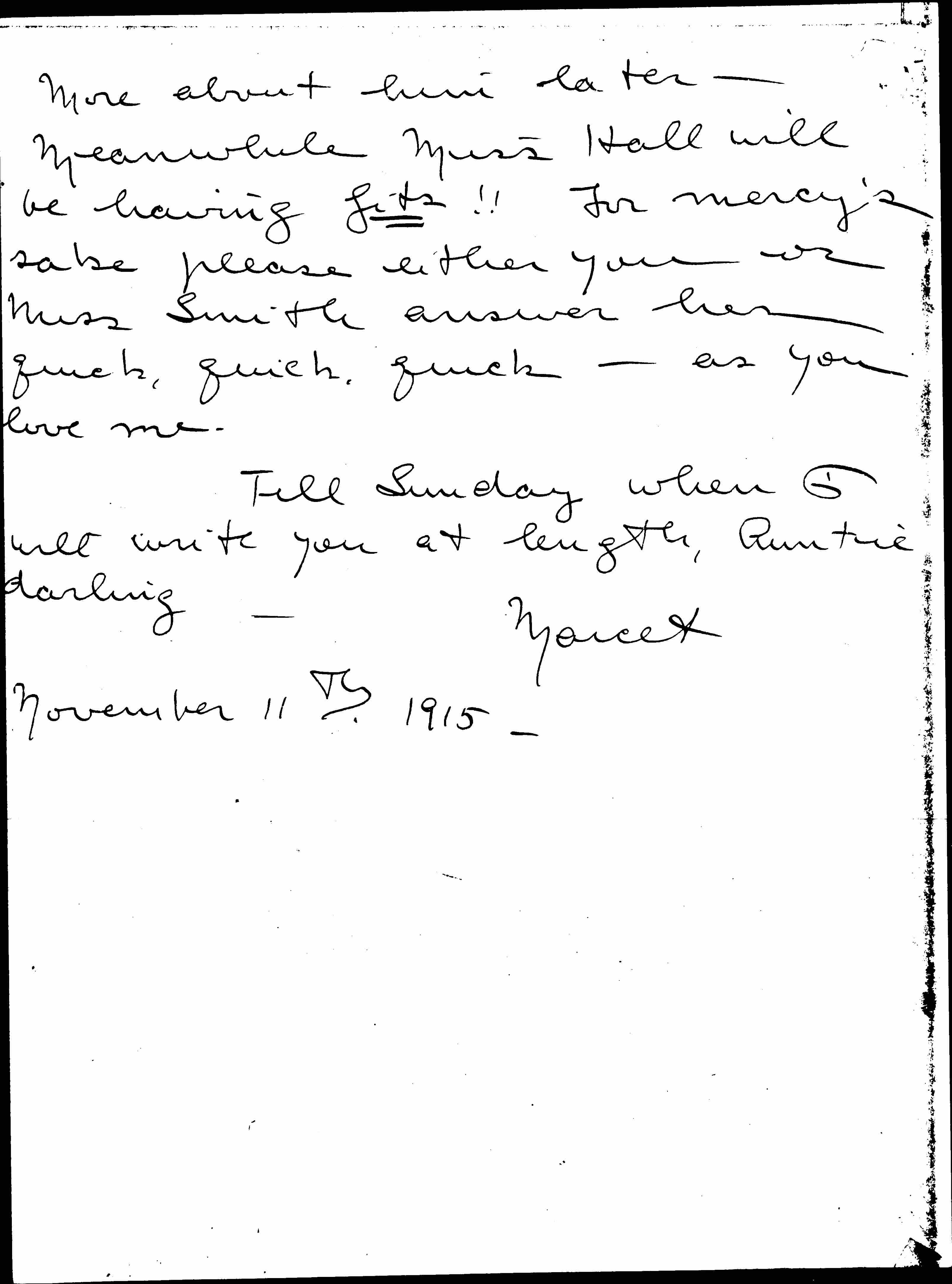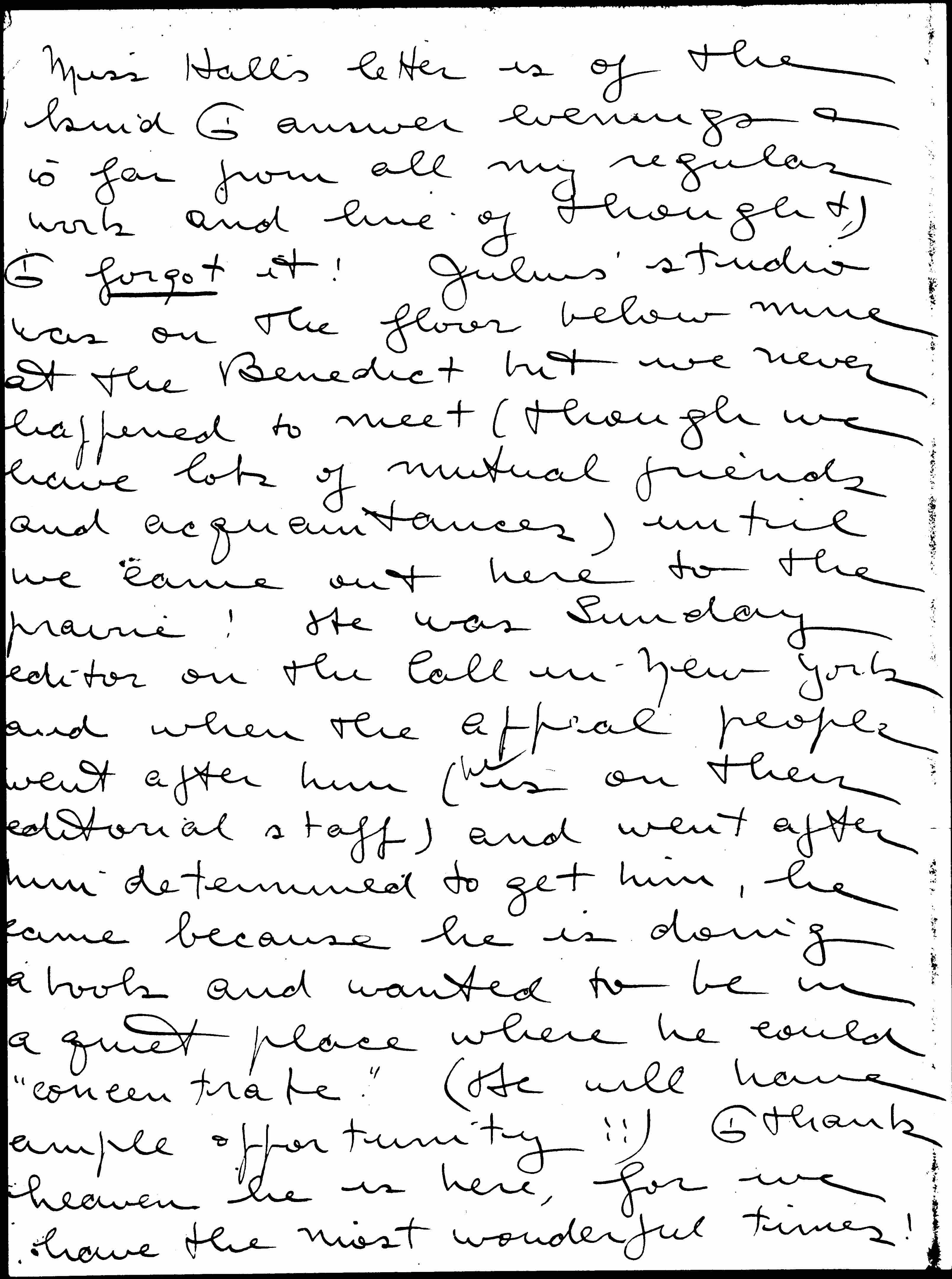 That -- when I reached this decision -- was two weeks ago and Auntie since then I've been having such [an] thrilling <interesting> and absorbing friendship with Emanuel Julius, a brilliant Russian Jew (just my age) that (as [page 3] Miss Hall's letter is of the kind I answer evenings & is far from all my regular work and line of thought &,) I forgot it! Julius' studio was on the floor below mine at the Benedict but we never happened to meet (though we have lots of mutual friends and acquaintances) until we came out here to the prairie! He was Sunday editor on the Call in New York and when the appeal people went after him (<he> is on their editorial staff) and went after him determined to get him, he came because he is doing a book and wanted to be in a quiet place where he could "concentrate." (He will have ample opportunity !!) I thank heaven he is here, for we have the most wonderful times! [page 4] More about him later -- Meanwhile Miss Hall will be having fits !! For mercy's sake please either you or Miss Smith answer her quick, quick, quick -- as you love me.