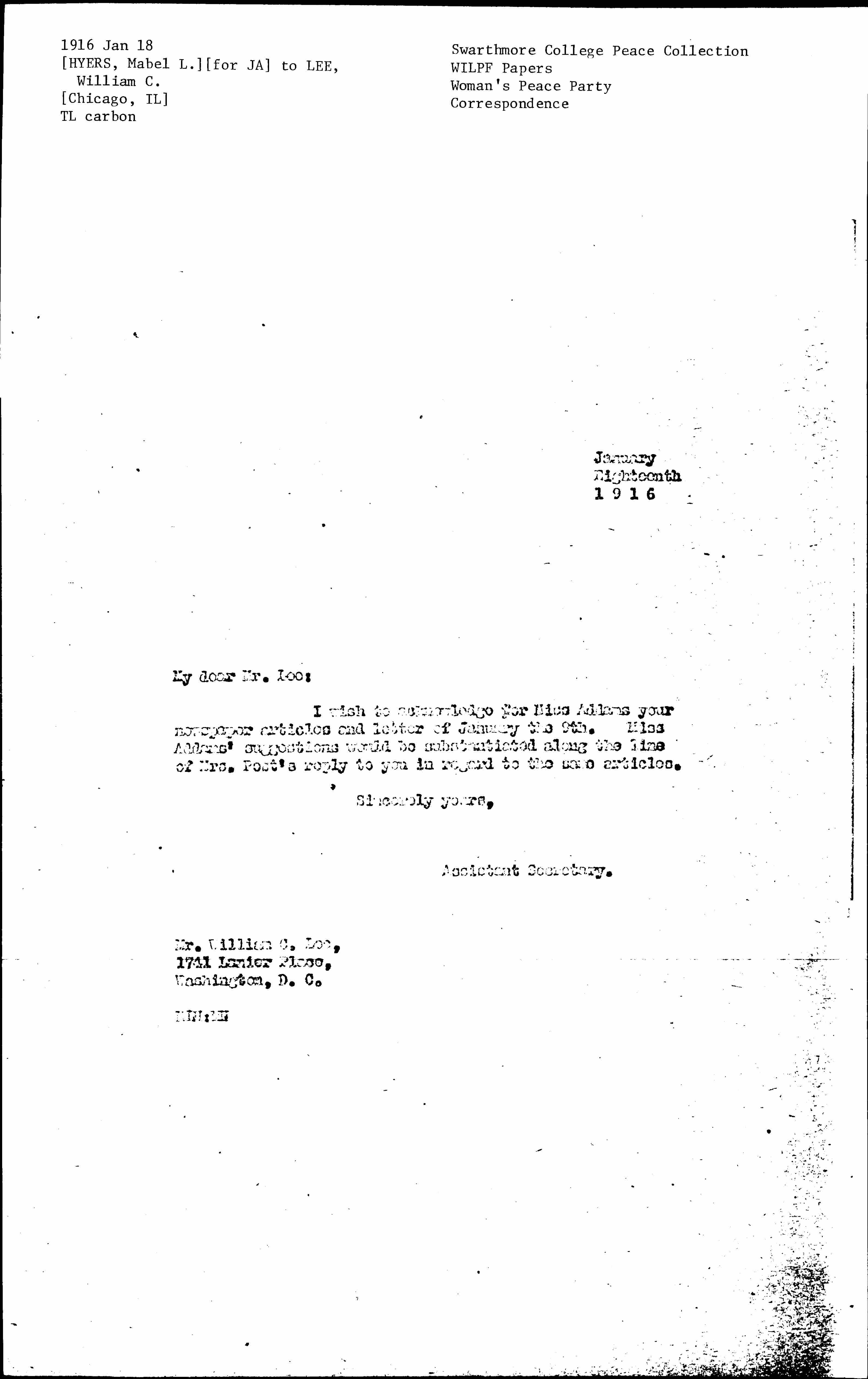 I wish to acknowledge for Miss Addams your newspaper articles and letter of January the 9th. Miss Addams' suggestions would be substantiated along the line of Mrs. Post's reply to you in regard to the same articles.