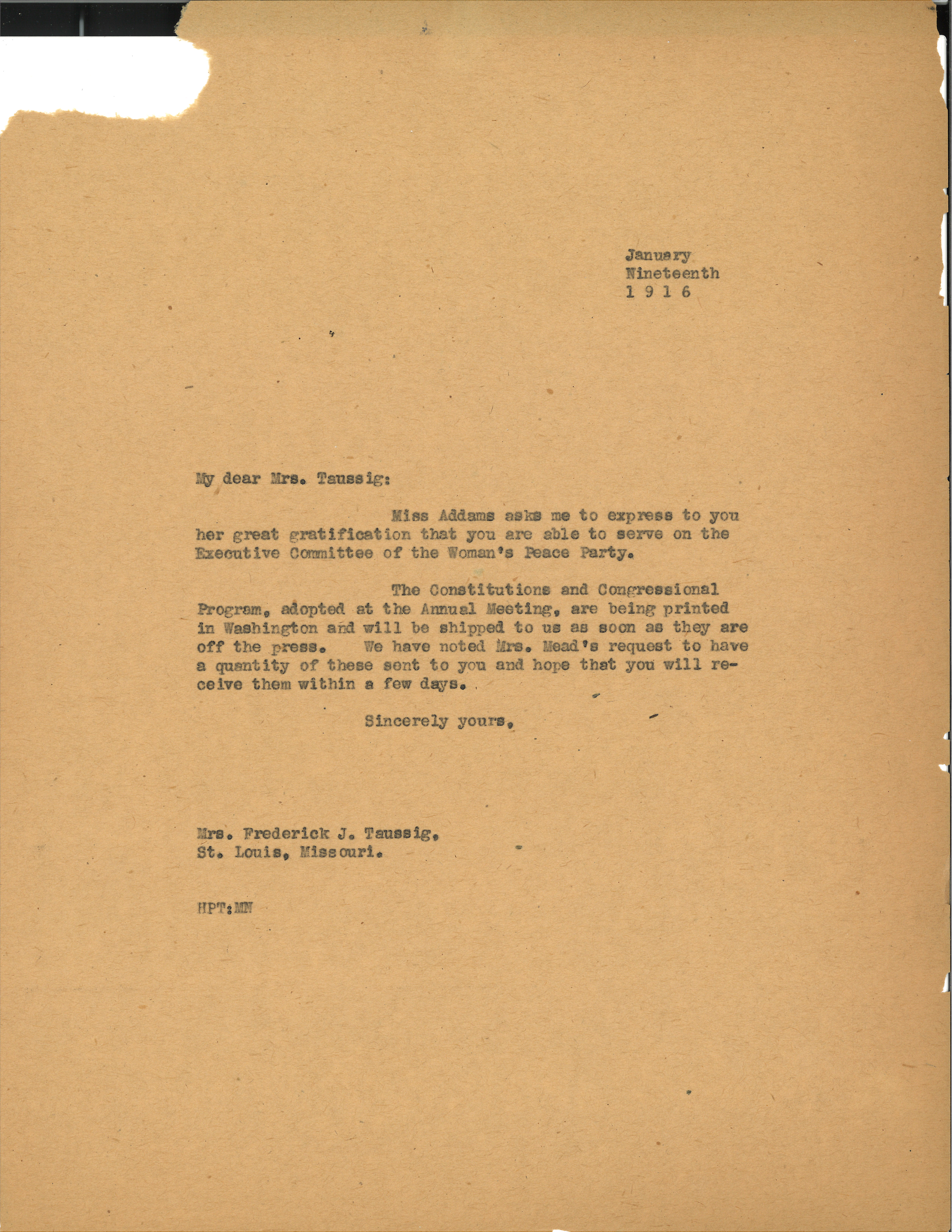 Miss Addams asks me to express to you her great gratification that you are able to serve on the Executive Committee of the Woman's Peace Party.