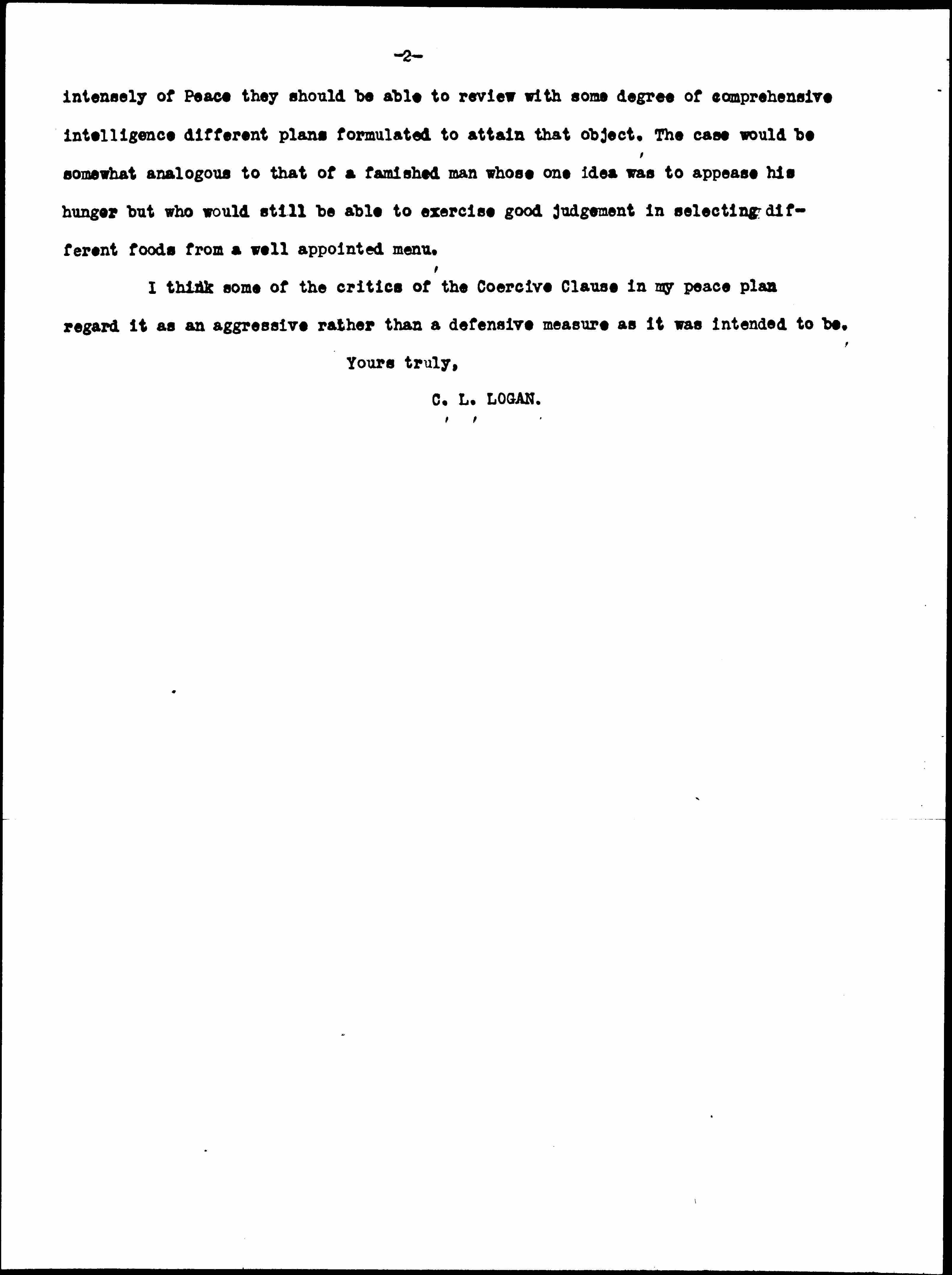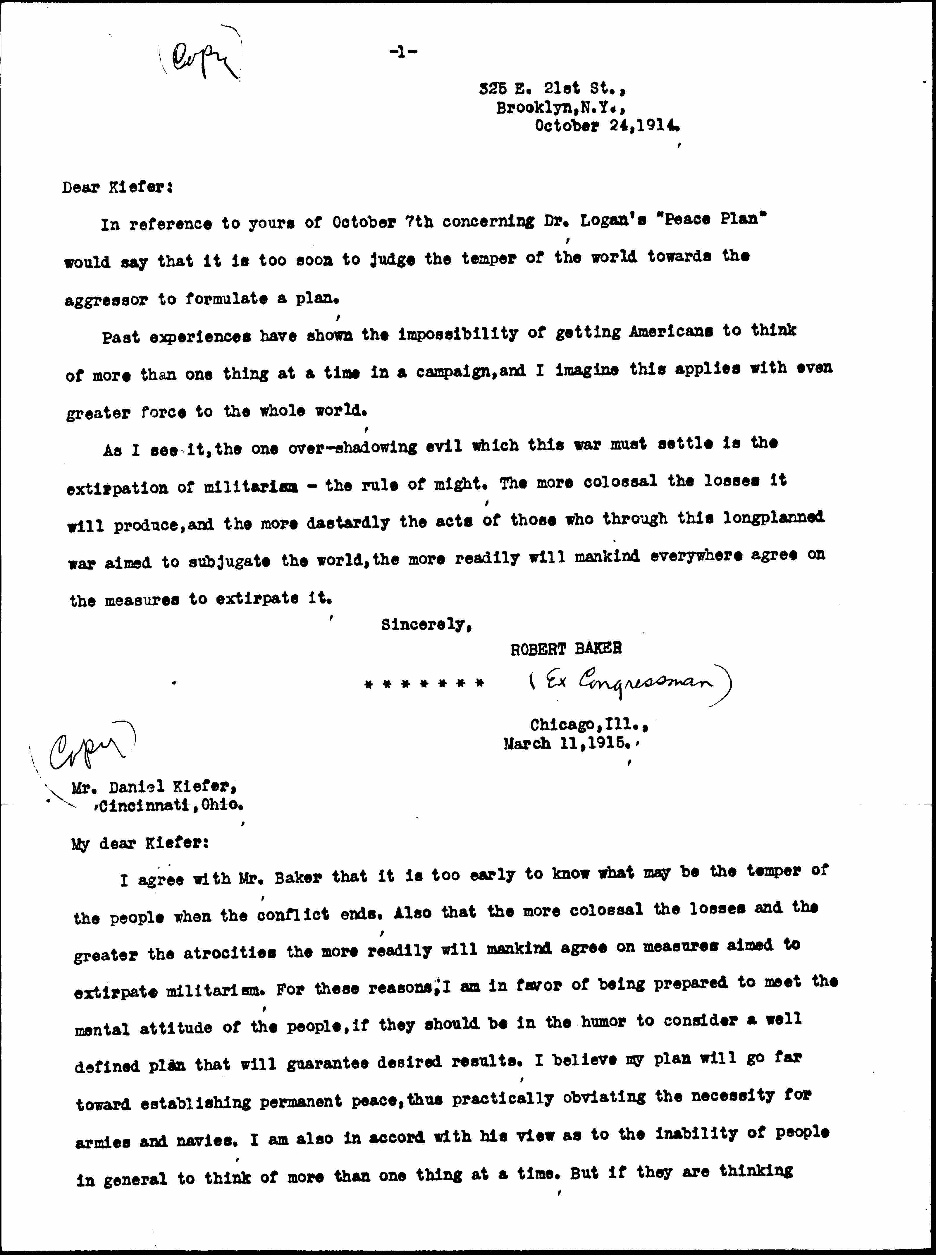 I agree with Mr. Baker that it is too early to know what may be the temper of the people when the conflict ends. Also that the more colossal the losses and the greater the atrocities the more readily will mankind agree on measures aimed to extirpate militarism. For these reasons, I am in favor of being prepared to meet the mental attitude of the people, if they should be in the humor to consider a well defined plan that will guarantee desired results. I believe my plan will go far toward establishing permanent peace, thus practically obviating the necessity for armies and navies. I am also in accord with his view as to the inability of people in general to think of more than one thing at a time. But if they are thinking [page 2] intensely of Peace they should be able to review with some degree of comprehensive intelligence different plans formulated to attain that object. The case would be somewhat analogous to that of a famished man whose one idea was to appease his hunger but who would still be able to exercise good [judgment] in selecting different foods from a well appointed menu.