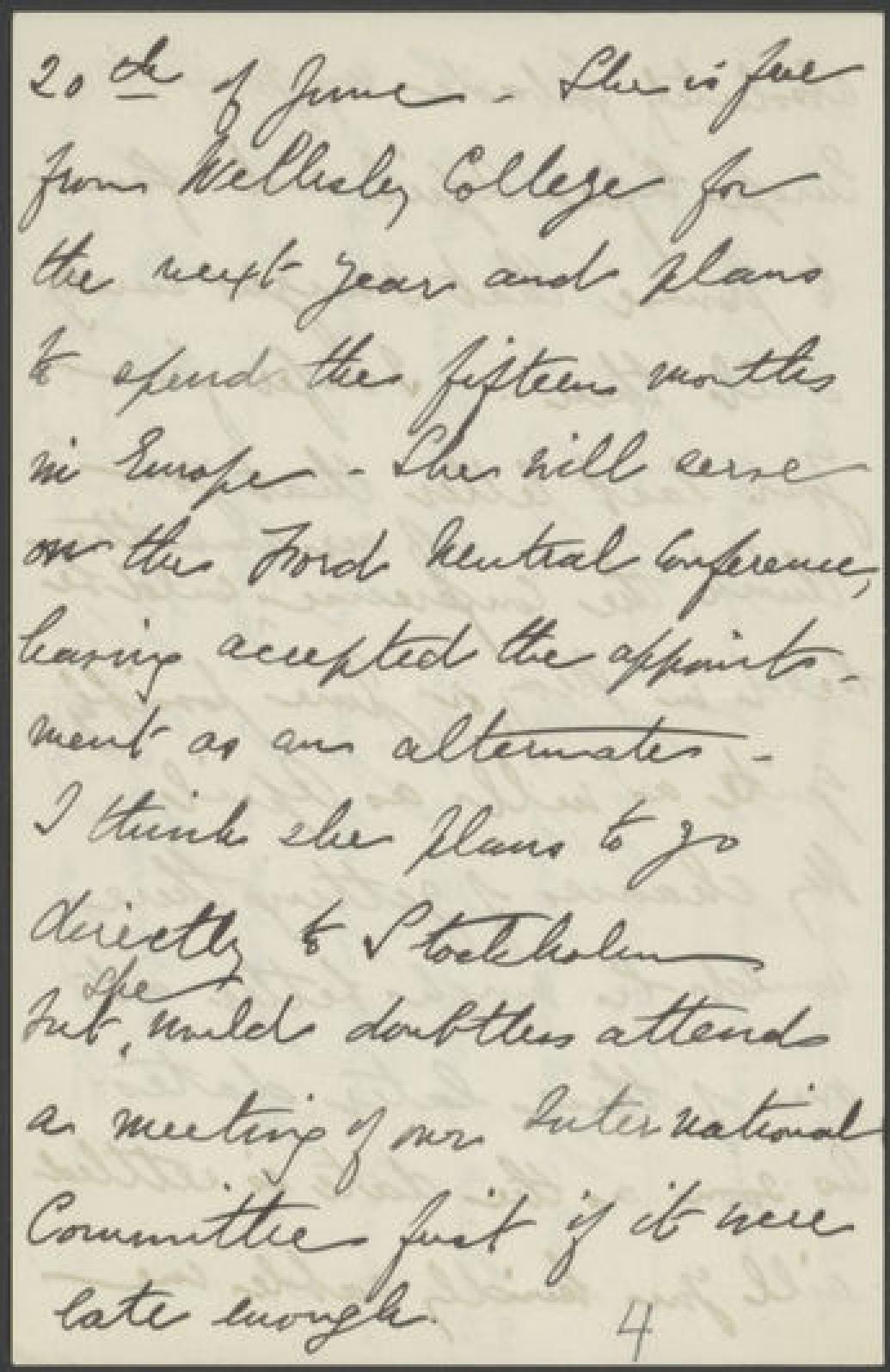 Miss Balch <at present> plans to sail about the [page 4] 20th of June. She is free from Wellesley College for the next year and plans to spend the fifteen months in Europe. She will serve on the Ford Neutral Conference, having accepted the appointment as an alternate. I think she plans to go directly to Stockholm but <she> would doubtless attend a meeting of our International Committee first if it were late enough. [page 5]