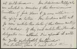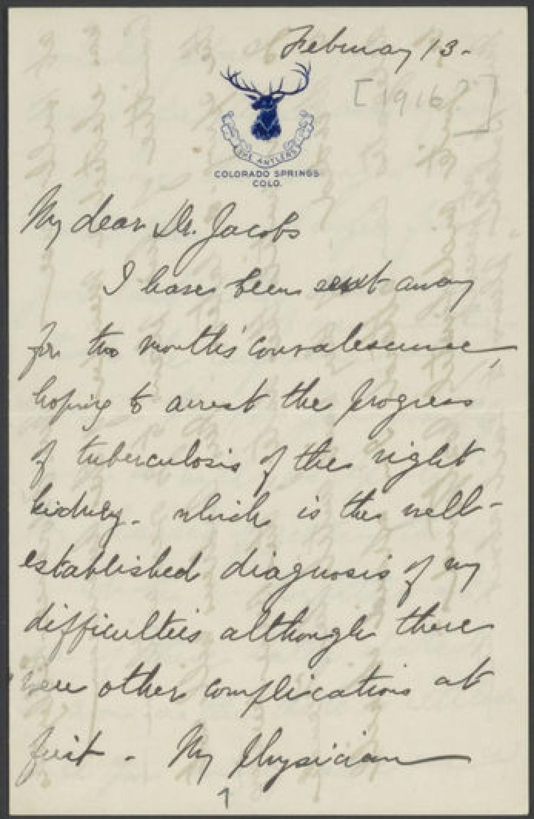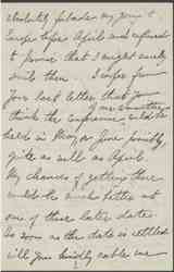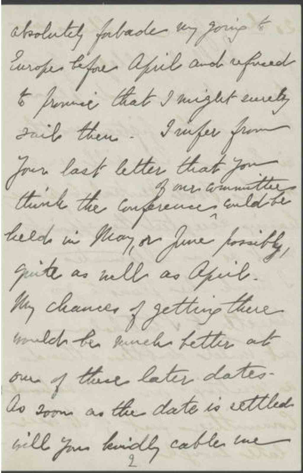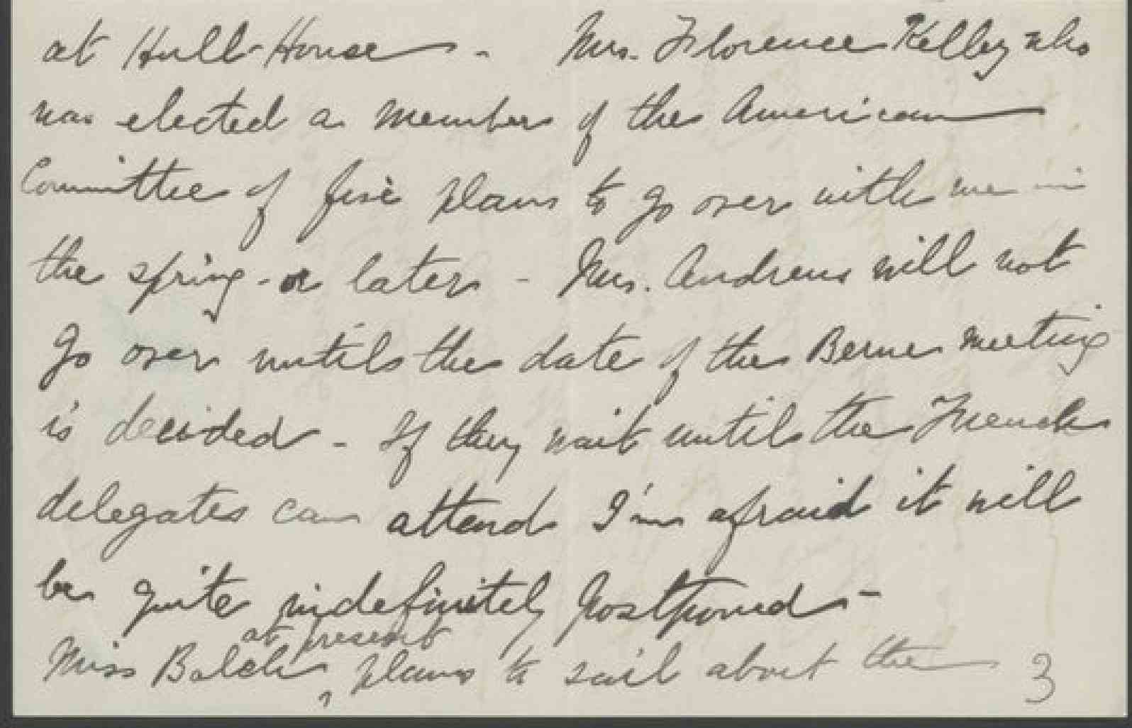 I have been sent away for two months' convalescence, hoping to arrest the progress of tuberculosis of the right kidney, which is the well-established diagnosis of my difficulties although there were other complications at first. My physician [page 2] absolutely forbade my going to Europe before April and refused to promise that I might sail then. I infer from your last letter that you think the conference <of our committee> could be held in May, or June possibly, quite as well as April. My chances of getting there would be much better at one of these later dates. As soon as the date is settled will you kindly cable me [page 3] at Hull-House. Mrs. Florence Kelley who was elected a member of the American Committee of five plans to go over with me in the spring -- or later -- Mrs. Andrews will not go over until the date of the Berne meeting is decided. If they wait until the French delegates can attend I'm afraid it will be quite indefinitely postponed.
