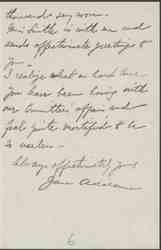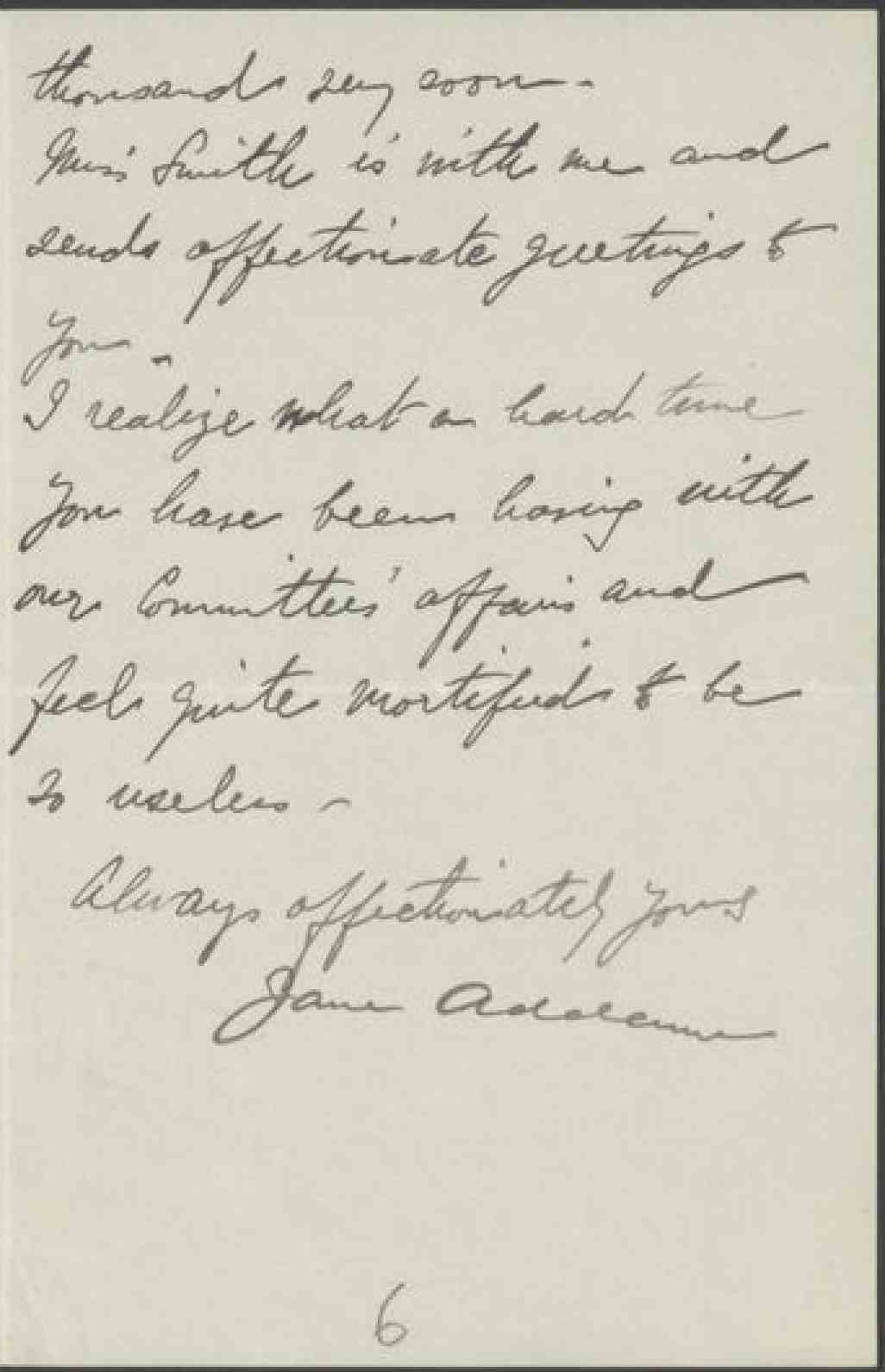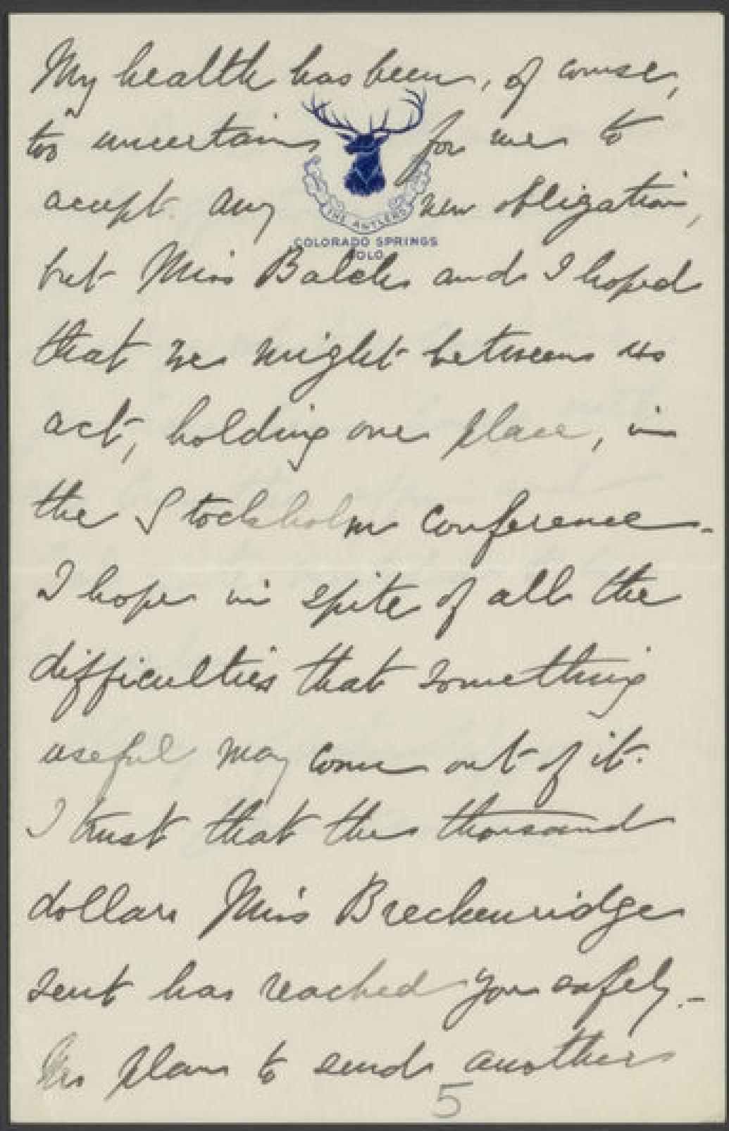 My health has been, of course, too uncertain for me to accept any new obligation, but Miss Balch and I hoped that we might between us act, holding one place, in the Stockholm conference. I hope in spite of all the difficulties that something useful may come out of it. I trust that the thousand dollars Miss [Breckinridge] sent has reached you safely. I plan to send another [page 6] thousand very soon.