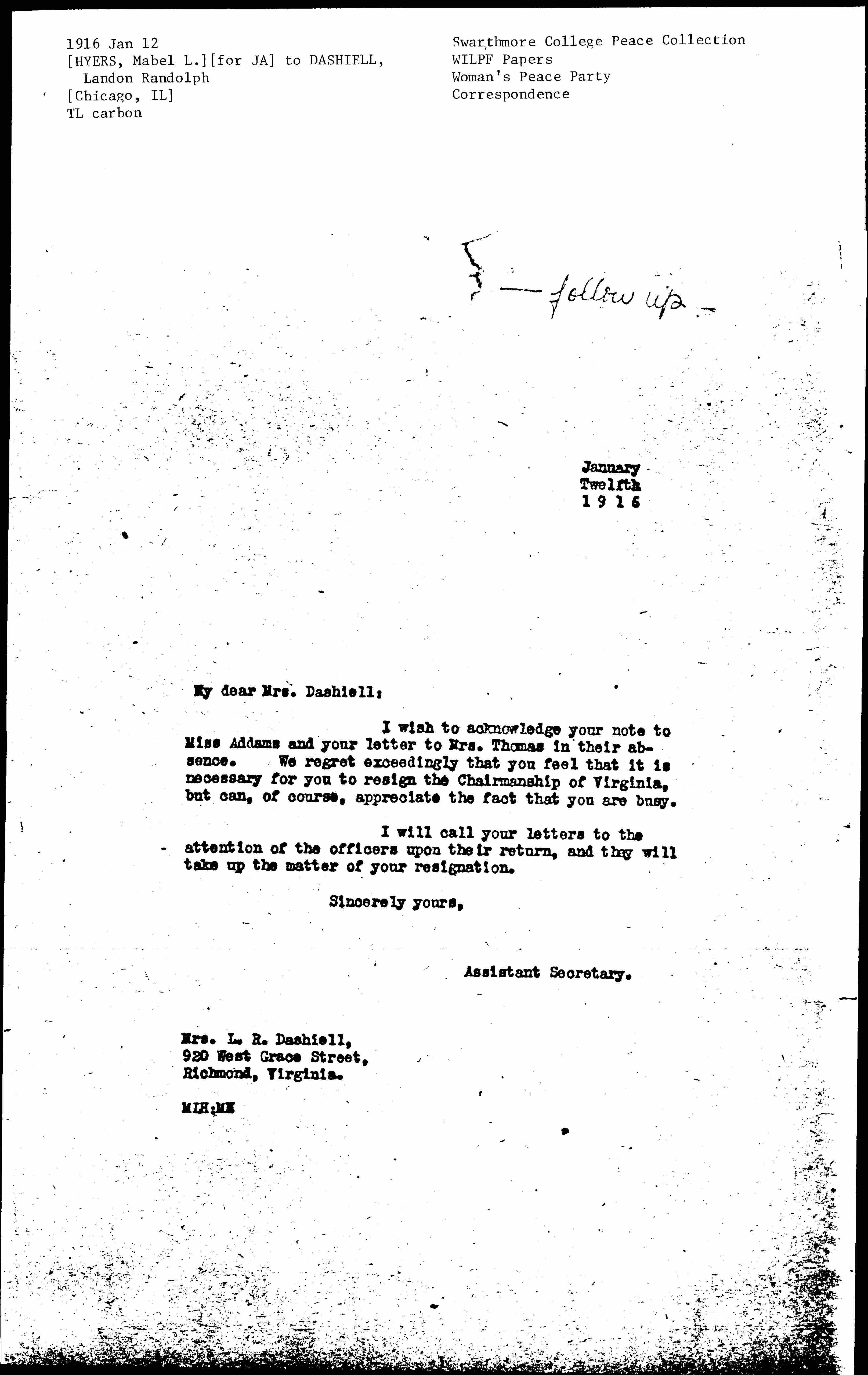 I wish to acknowledge your note to Miss Addams and your letter to Mrs. Thomas in their absence. We regret exceedingly that you feel that it is necessary for you to resign the Chairmanship of Virginia, but can, of course, appreciate the fact that you are busy.