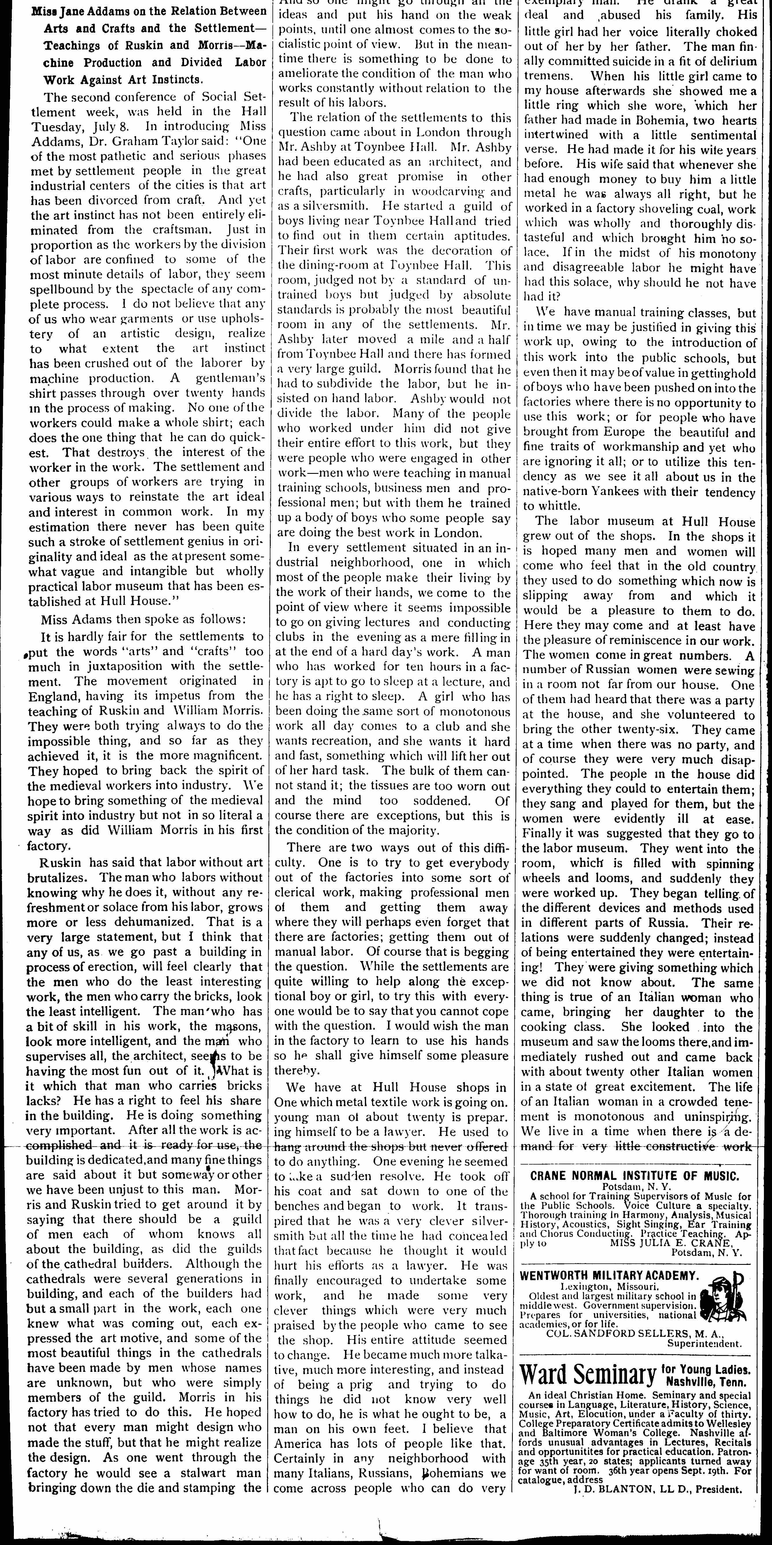 Miss Jane Addams on the Relation Between Arts and Crafts and the Settlement-–Teachings of Ruskin and Morris-–Machine Production and Divided Labor Work Against Art Instincts