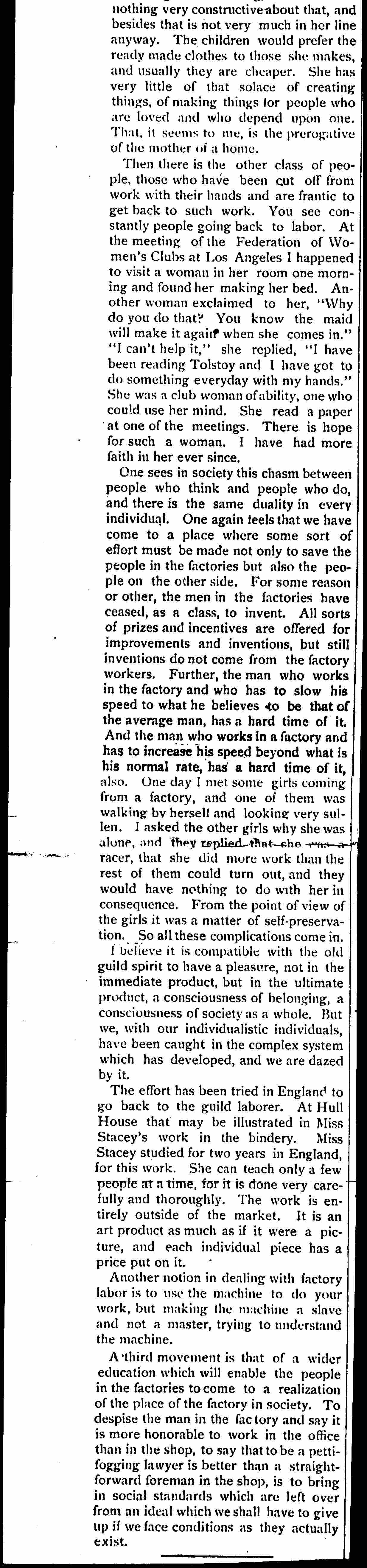Then there is the other class of people, those who have been cut off from work with their hands and are frantic to get back to such work. You see constantly people going back to labor. At the meeting of the Federation of Women's Clubs at Los Angeles I happened to visit a woman in her room one morning and found her making her bed. Another woman exclaimed to her, "Why do you do that? You know that the maid will make it again when she comes in." "I can't help it," she replied, "I have been reading Tolstoy and I have got to do something everyday with my hands." She was a club woman of ability, one who could use her mind. She read a paper at one of the meetings. There is hope for such a woman. I have had more faith in her ever since.