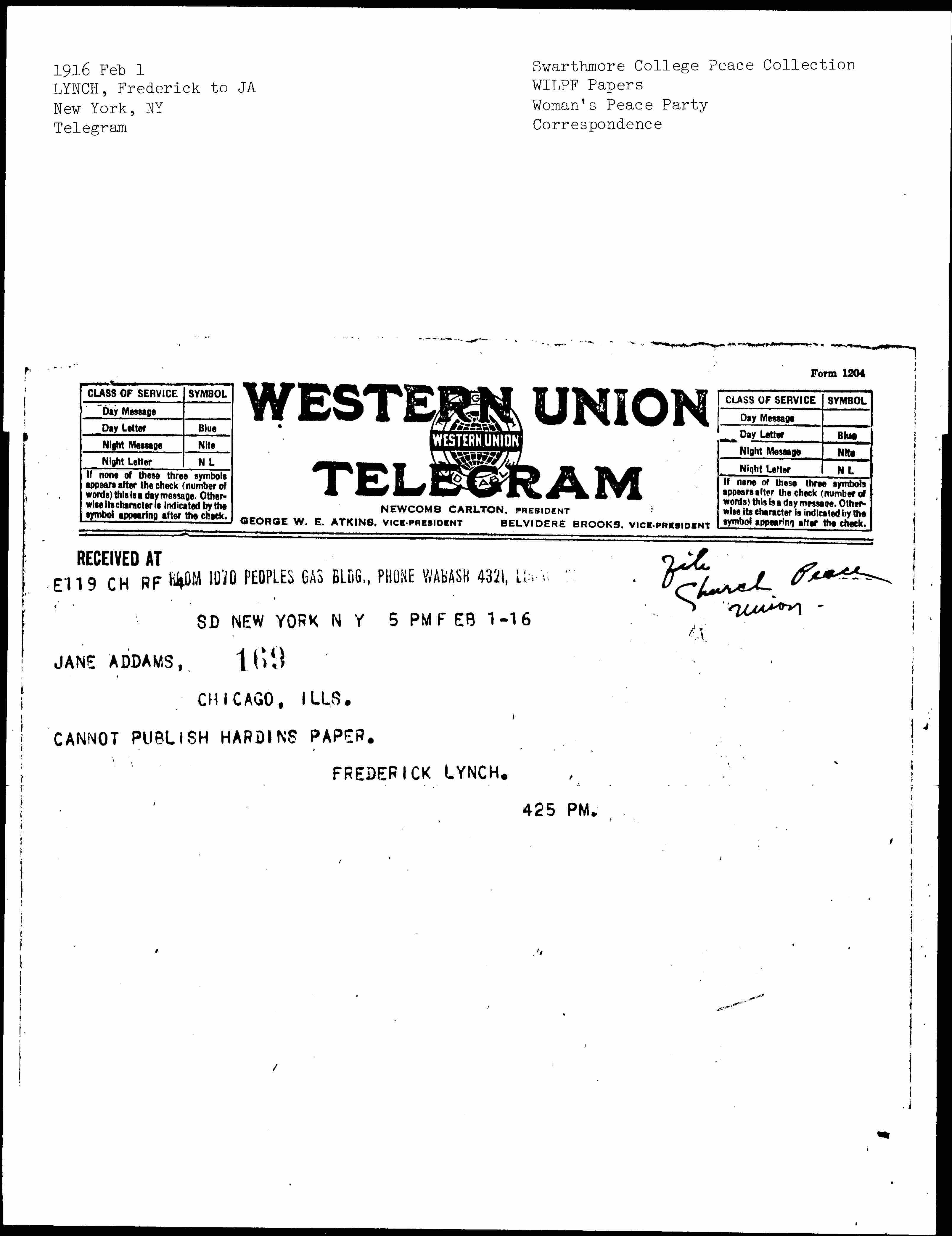 ROOM 1070 PEOPLES GAS BLDG. [stamped]
