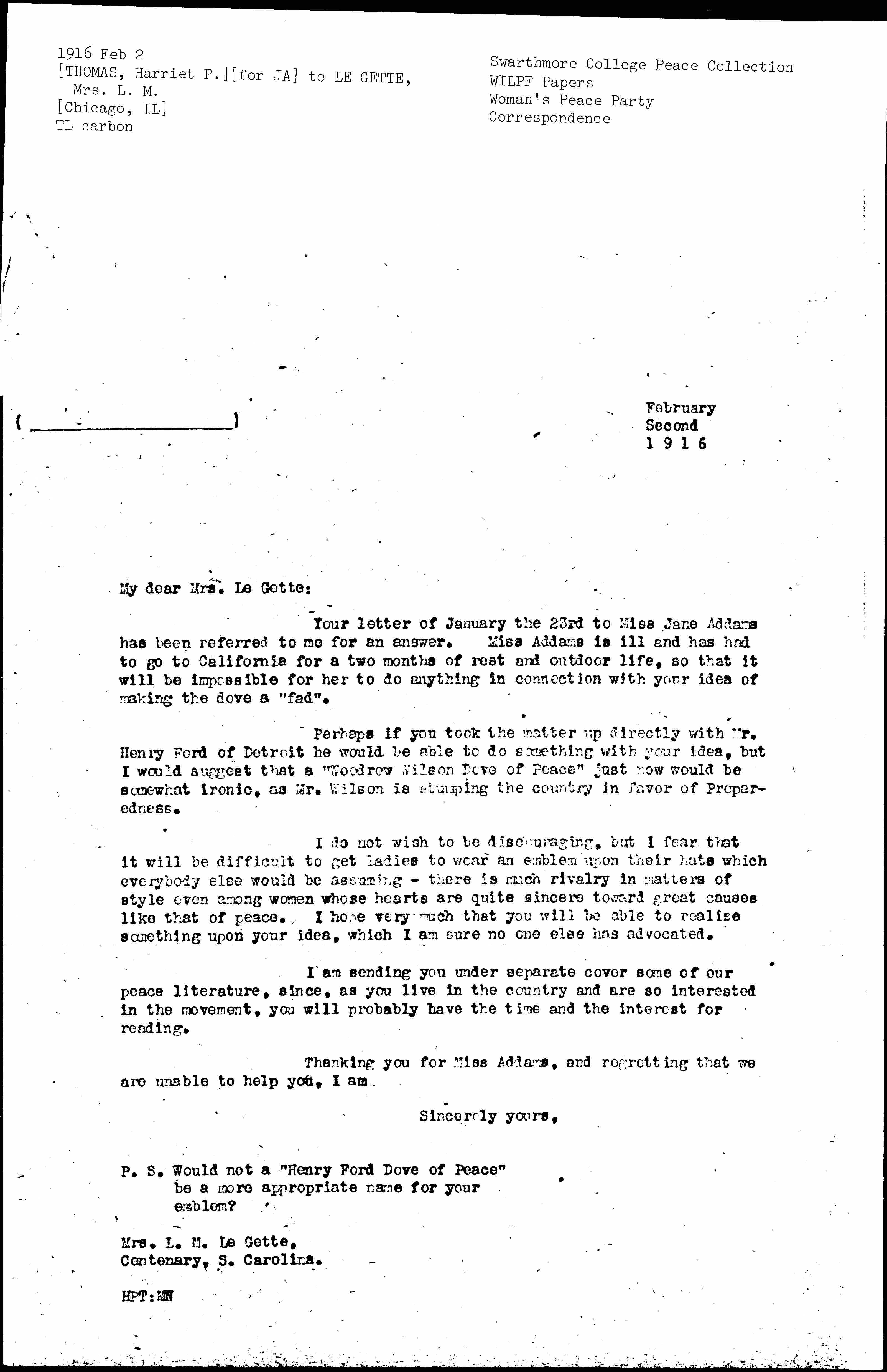 Your letter of January the 23rd to Miss Jane Addams has been referred to me for an answer. Miss Addams is ill and has had to go to California for a two months of rest and outdoor life, so that it will be impossible for her to do anything in connection with your idea of making the dove a "fad".