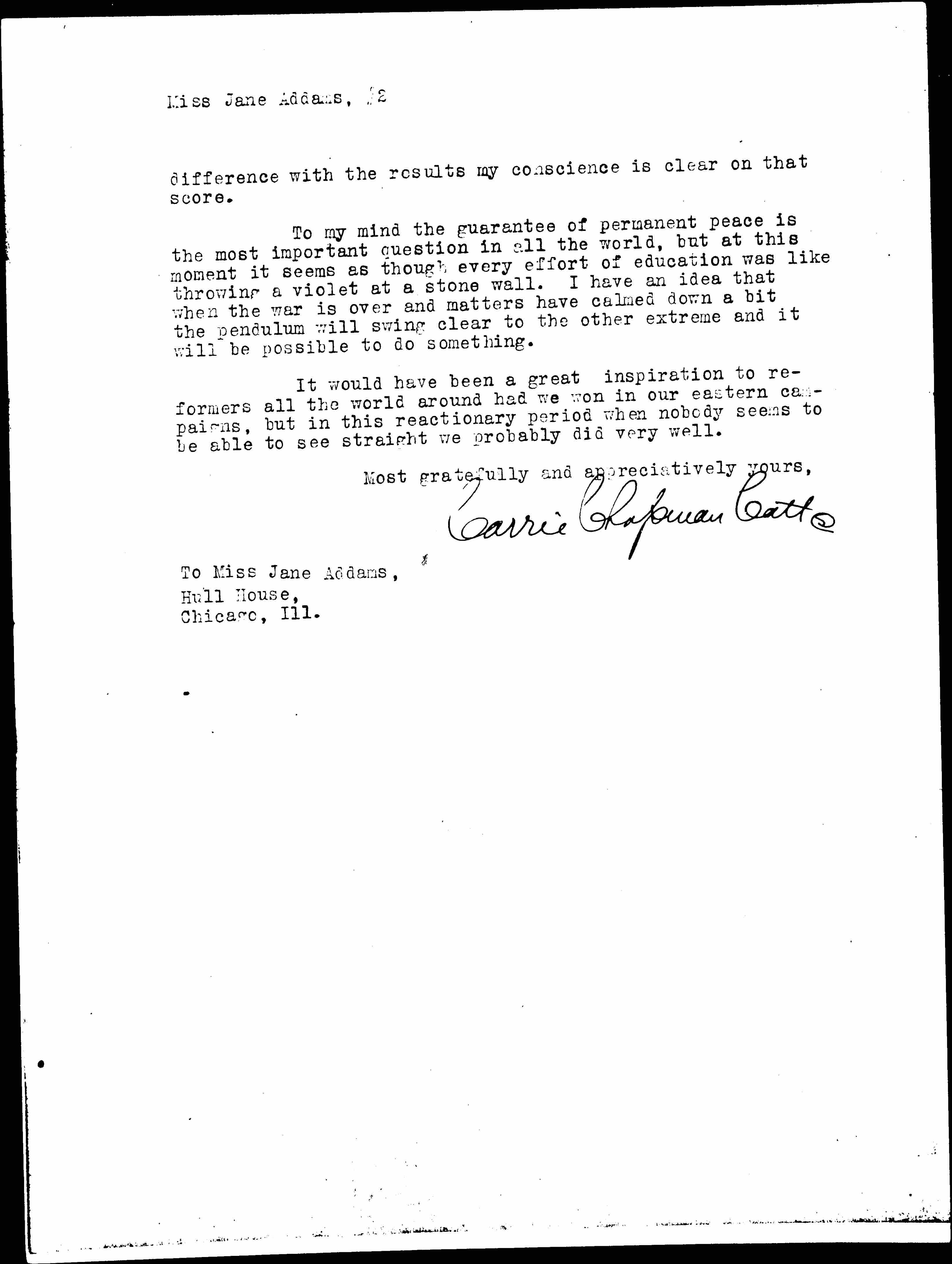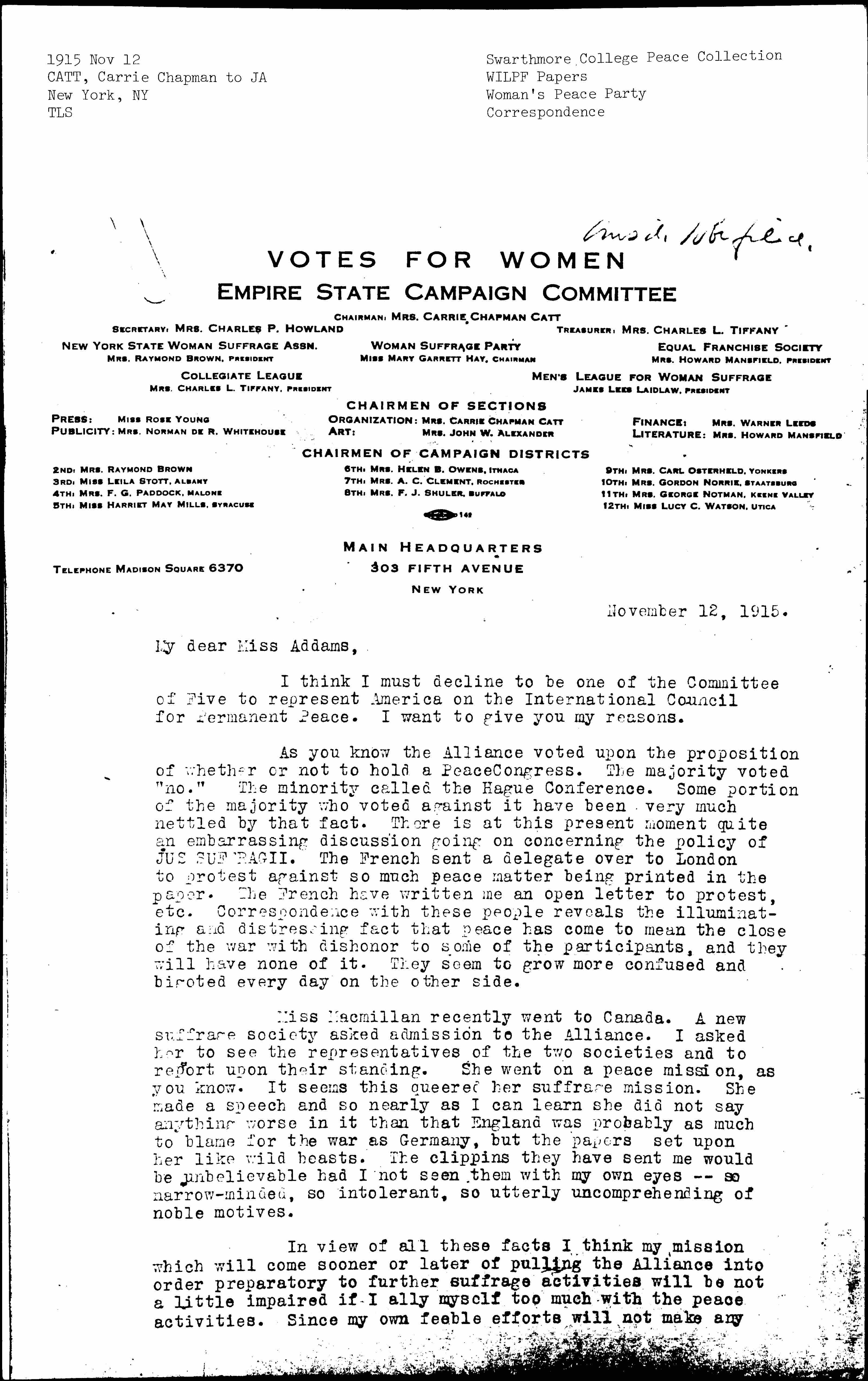 In view of all these facts I think my mission which will come sooner or later of pulling the Alliance into order preparatory to further suffrage activities will be not a little impaired if I ally myself too much with the peace activities. Since my own feeble efforts will not make any [page 2] difference with the results my conscience is clear on that score.