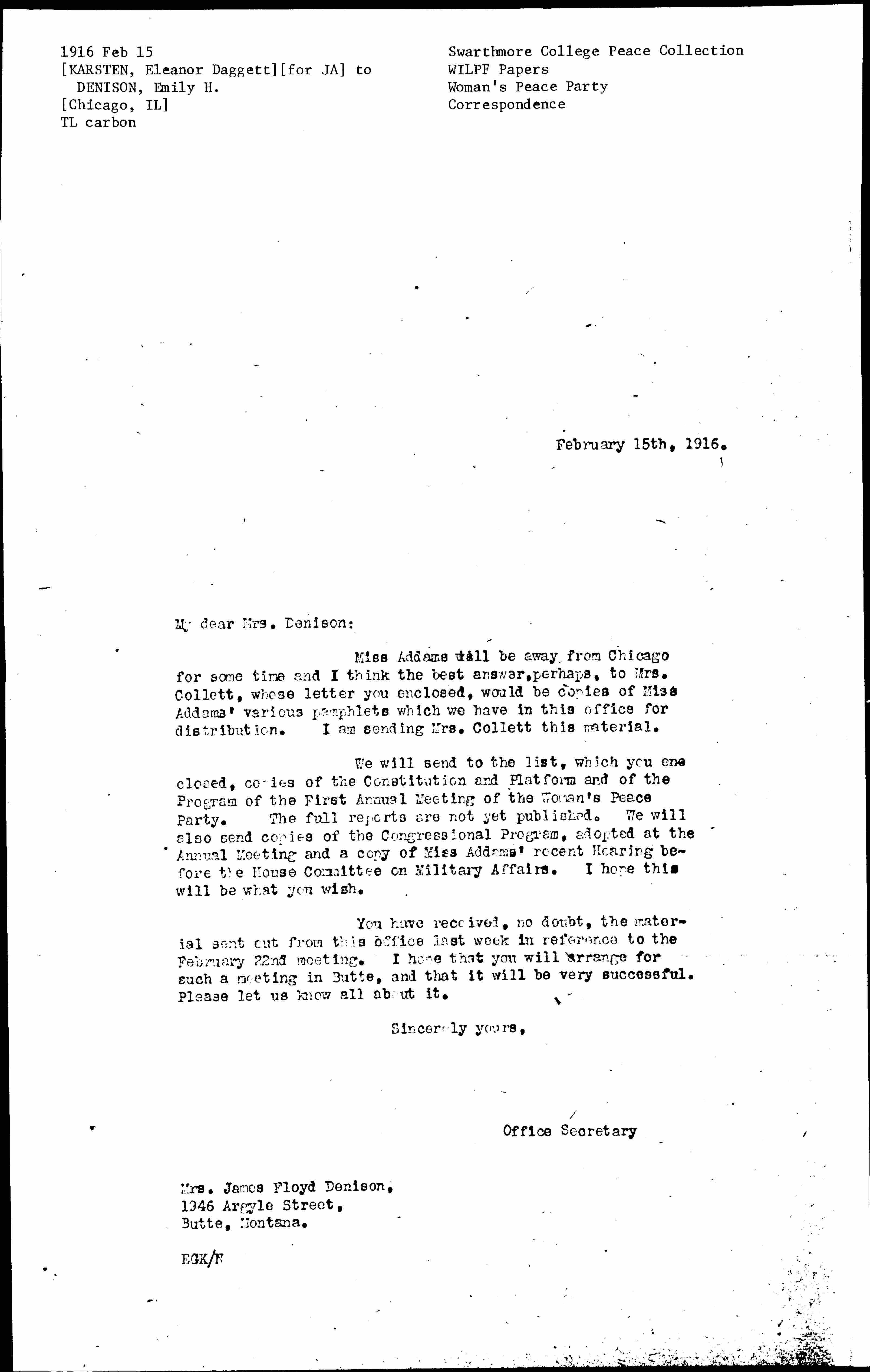 We will send to the list, which you enclosed, copies of the Constitution and Platform and of the Program of the First Annual Meeting of the Woman's Peace Party. The full reports are not yet published. We will also send copies of the Congressional Program, adopted at the Annual Meeting and a copy of Miss Addams' recent Hearing before the House Committee on Military Affairs. I hope this will be what you wish.