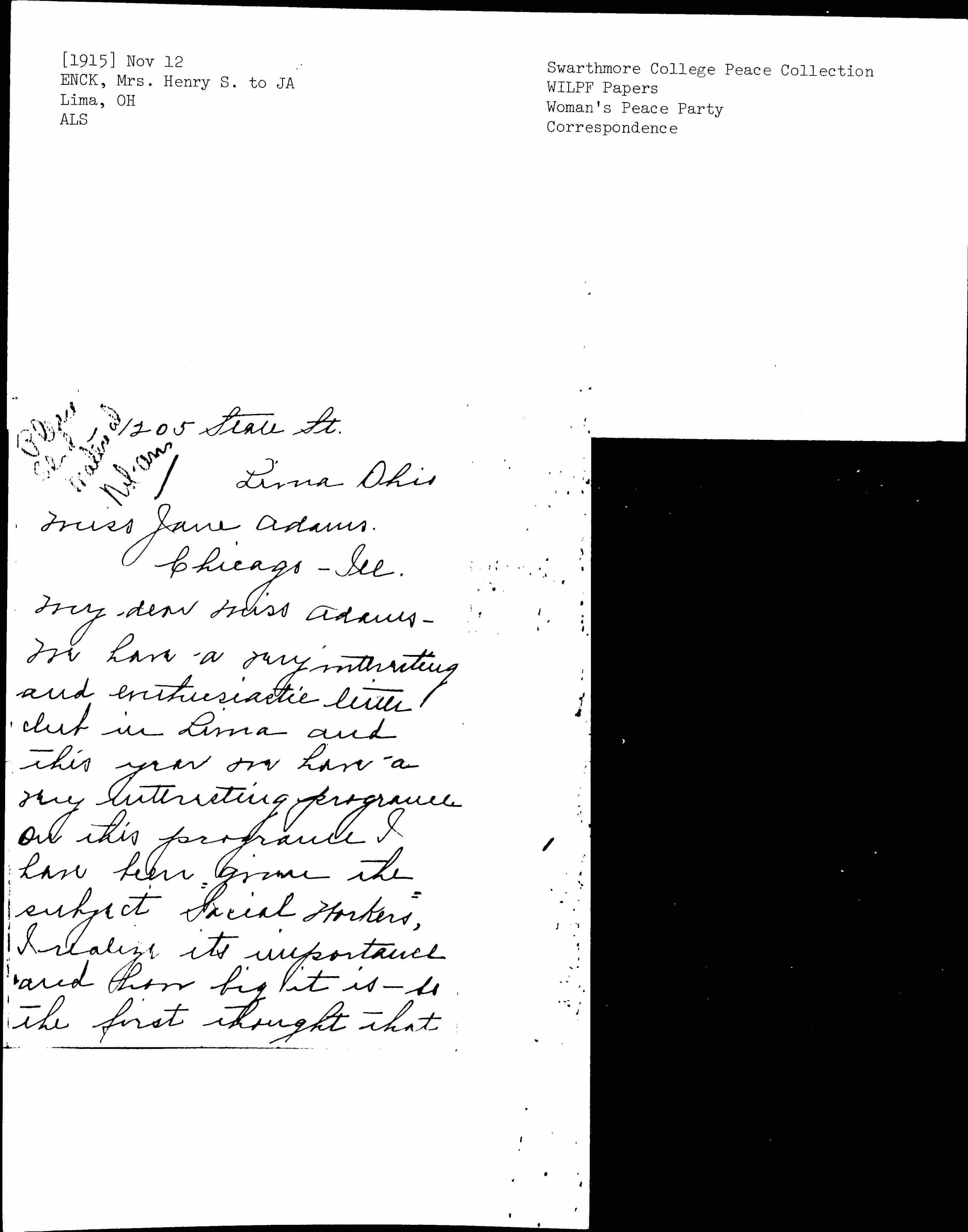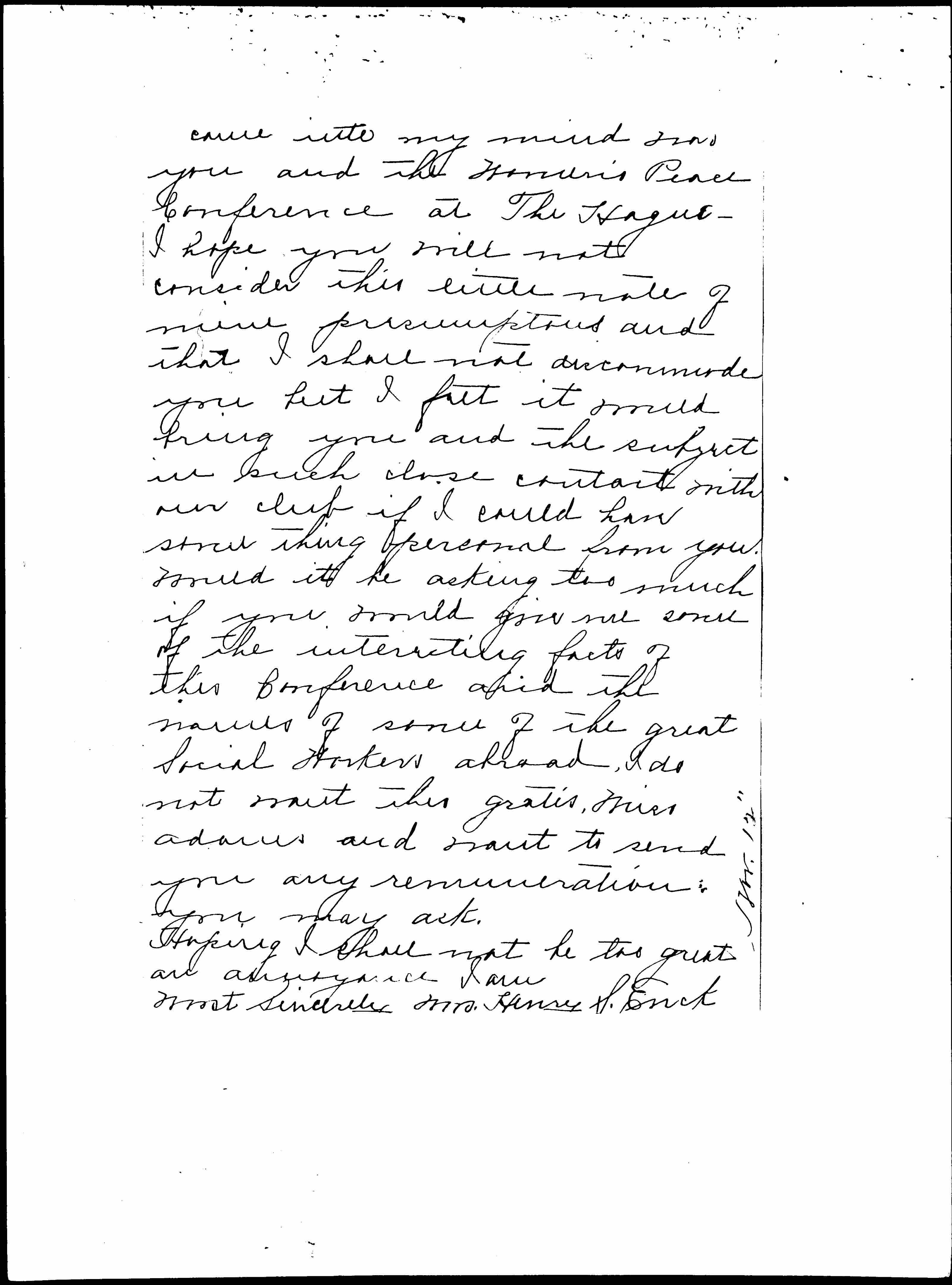 We have a very interesting and enthusiastic little club in Lima and this year we have a very interesting program. On this program I have been given the subject "Social Workers," I realize its importance and how big it is -- so the first thought that [page 2] came into my mind was you and the Woman's Peace Conference at The Hague -- I hope you will not consider this little note of mine presumptuous and that I shall not discommode you but I felt it would bring you and the subject in such close contact with our club if I could have something personal from you. Would it be asking too much if you would give me some of the interesting facts of this Conference and the [worries] of some of the great Social Workers ahead, I do not want this gratis, Miss [Addams] and want to send you any remuneration you may ask.