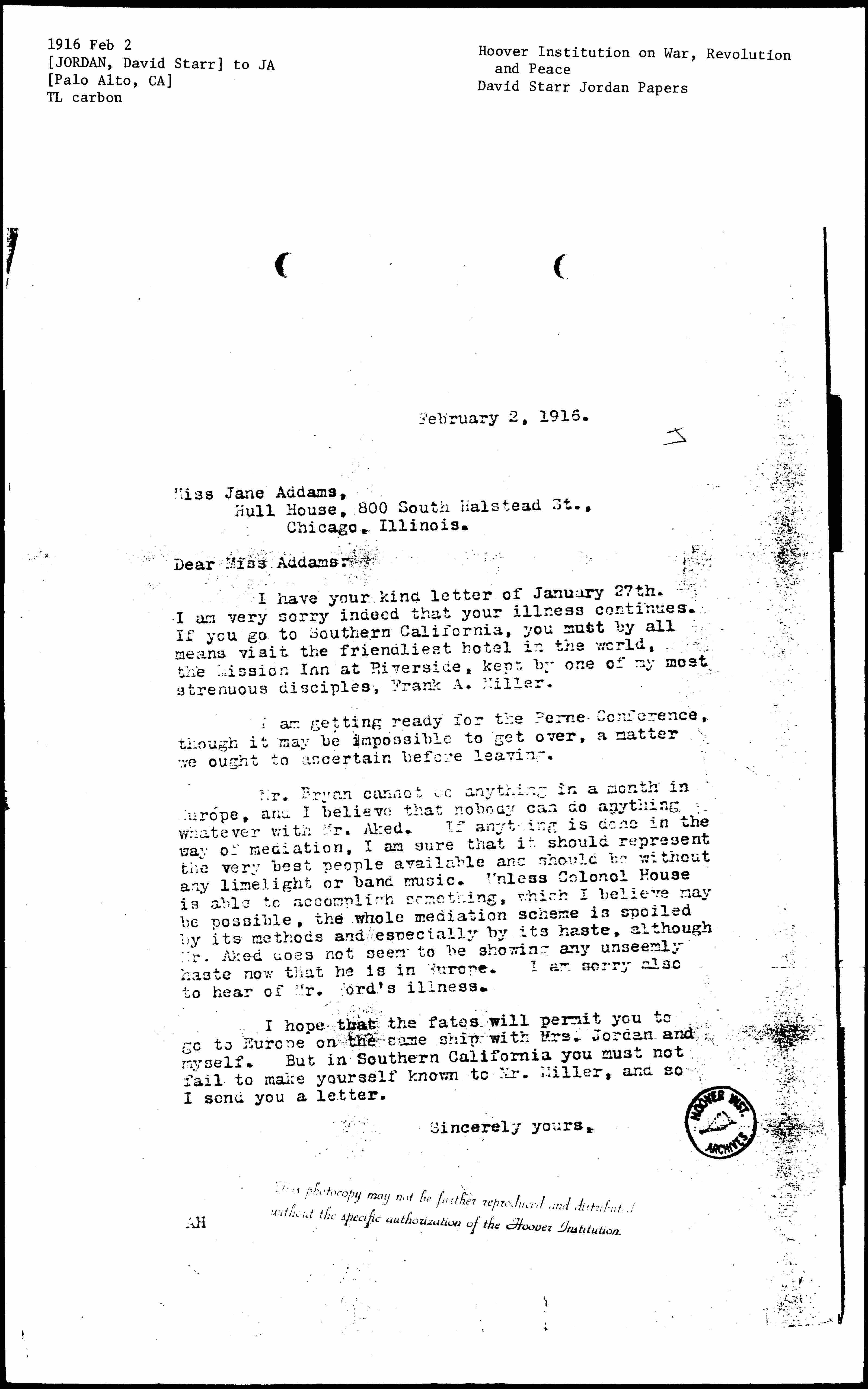I hope that the fates will permit you to go to Europe on the same ship with Mrs. Jordan and myself. But in Southern California you must not fail to make yourself known to Mr. Miller, and so I send you a letter.