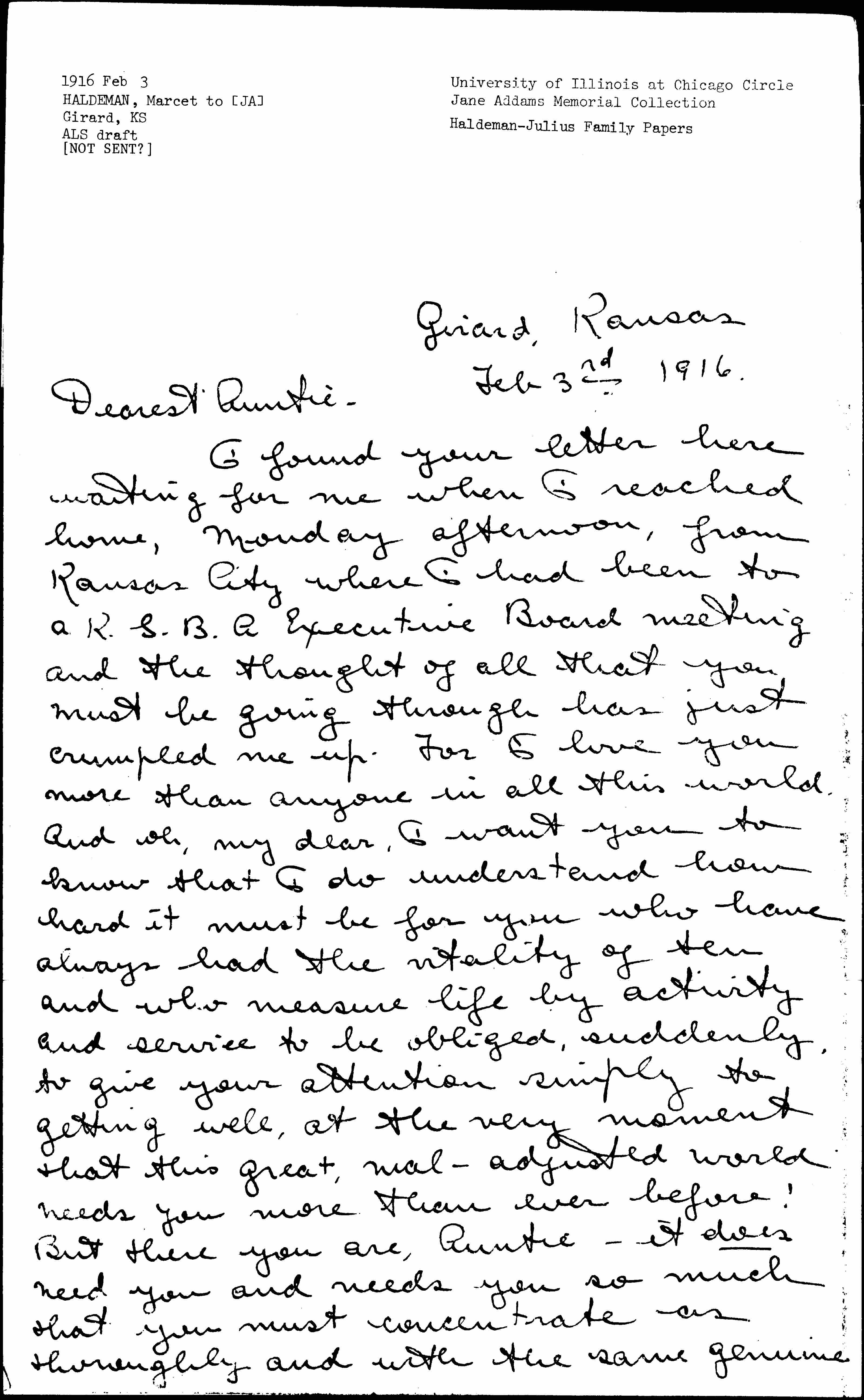I found your letter here waiting for me when I reached home, Monday afternoon, from Kansas City where I had been to a K.S.B.A. Executive Board meeting and the thought of all that you must be going through has just crumpled me up. For I love you more than anyone in all this world. And oh, my dear, I want you to know that I do understand how hard it must be for you who have always had the vitality of ten and who measure life by activity and service to be obliged, suddenly, to give your attention simply to getting well, at the very moment that this great, [maladjusted] world needs you more than ever before! But there you are, Auntie -- it does need you and needs you so much that you must concentrate as thoroughly and with the same genuine [page 2] enthusiasm on this less congenial job, as on everything else you undertake.