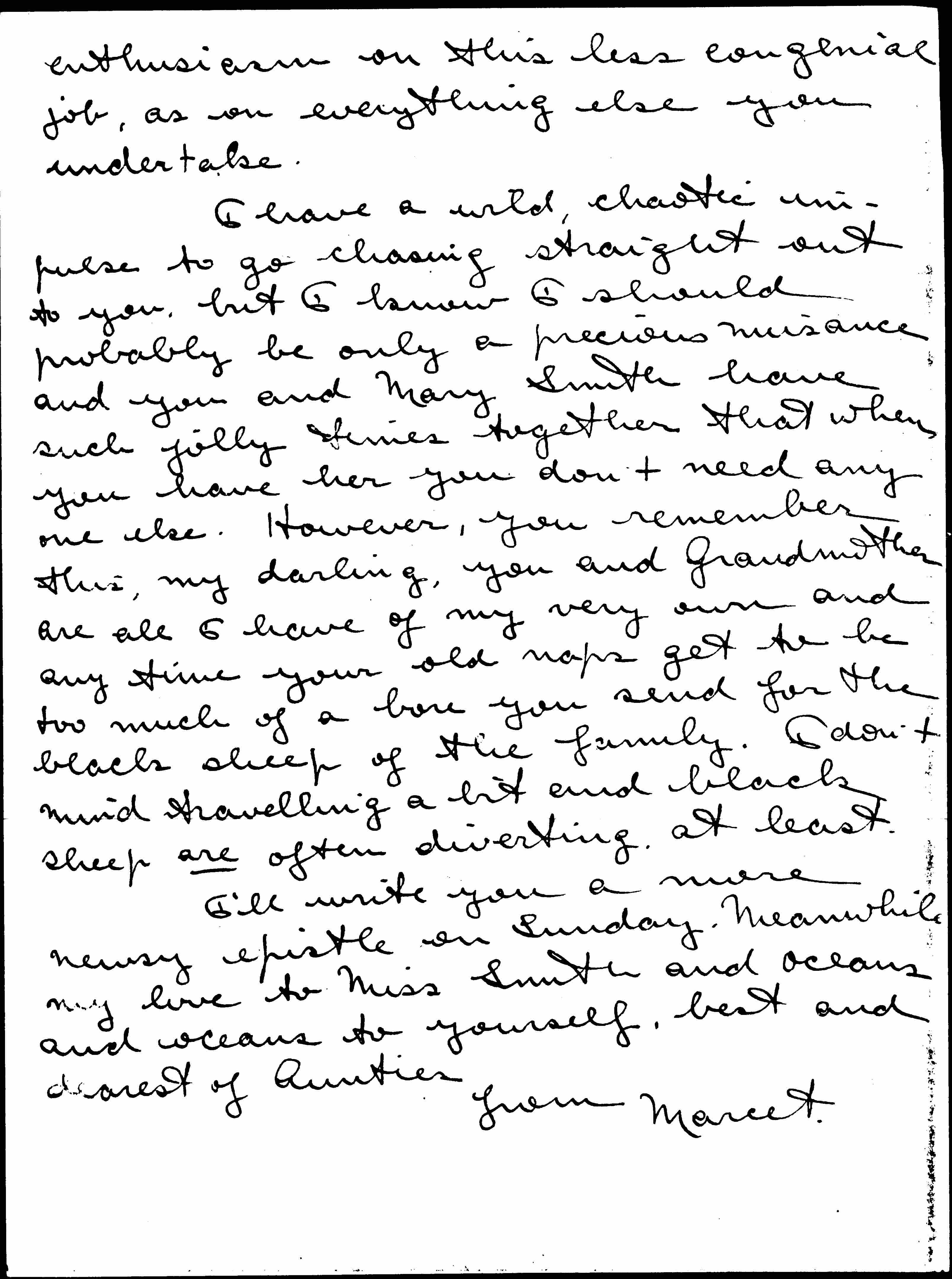 I'll write you a more newsy epistle on Sunday. Meanwhile my love to Miss Smith and oceans and oceans to yourself, best and dearest of Aunties.
