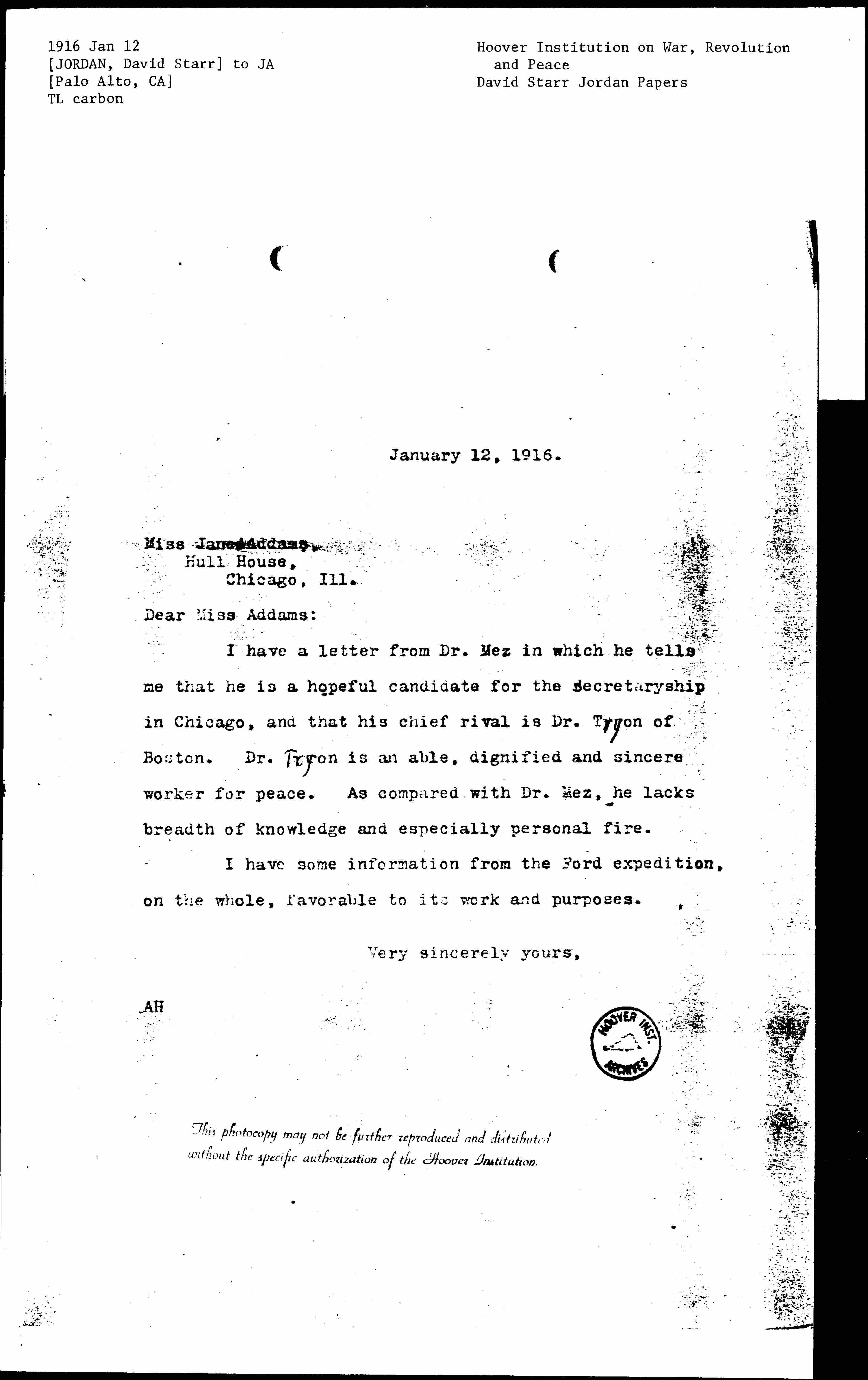 I have a letter from Dr. Mez in which he tells me that he is a hopeful candidate for the secretaryship in Chicago, and that his chief rival is Dr. Tryon of Boston. Dr. Tryon is an able, dignified and sincere worker for peace. As compared with Dr. Mez, he lacks breadth of knowledge and especially personal fire.