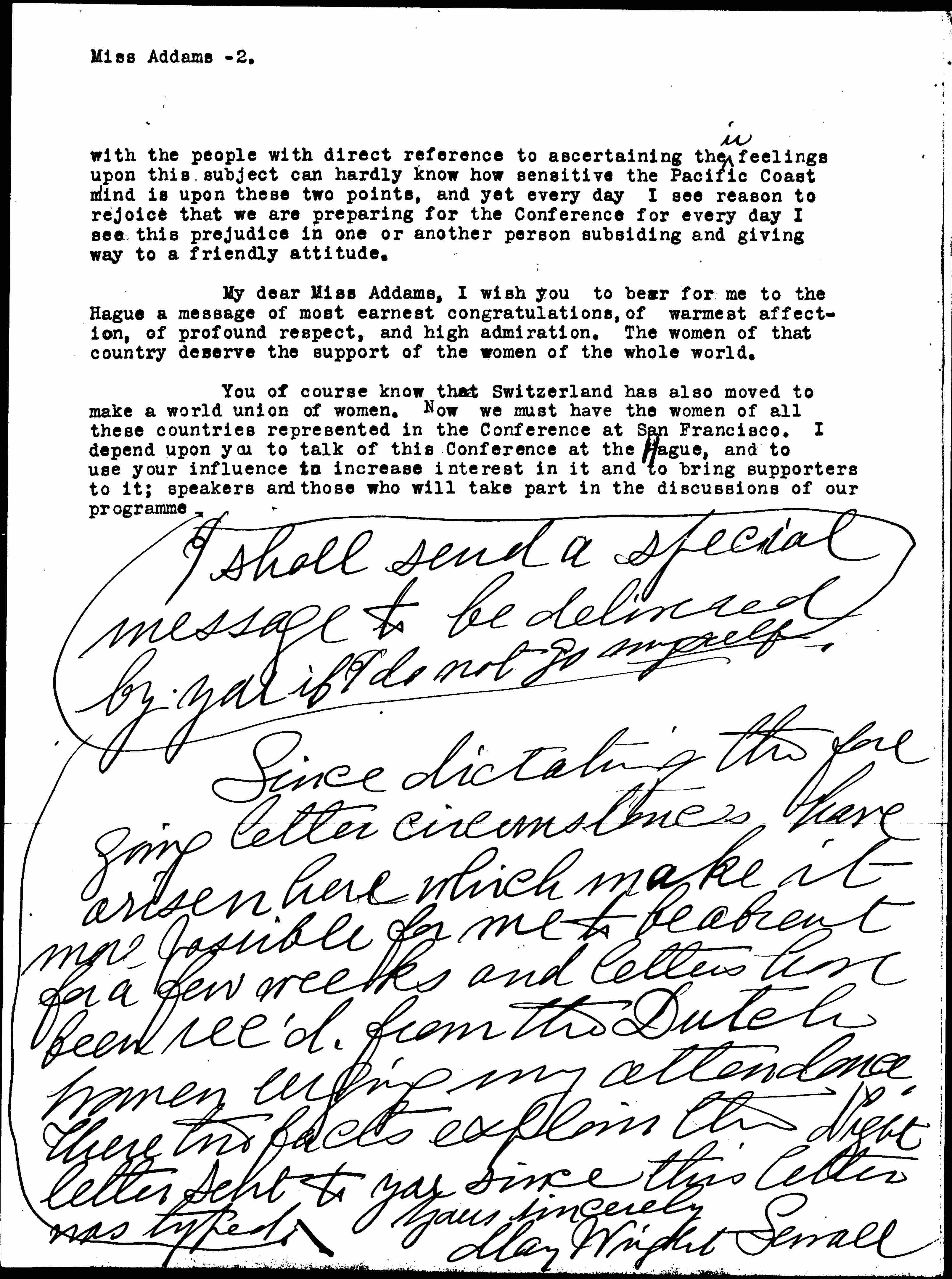 You of course know that Switzerland has also moved to make a world union of women. Now we must have the women of all these countries represented in the Conference at San Francisco. I depend upon you to talk of this Conference at the Hague, and to use your influence to increase interest in it and to bring supporters to it; speakers and those who will take part in the discussions of our [program].