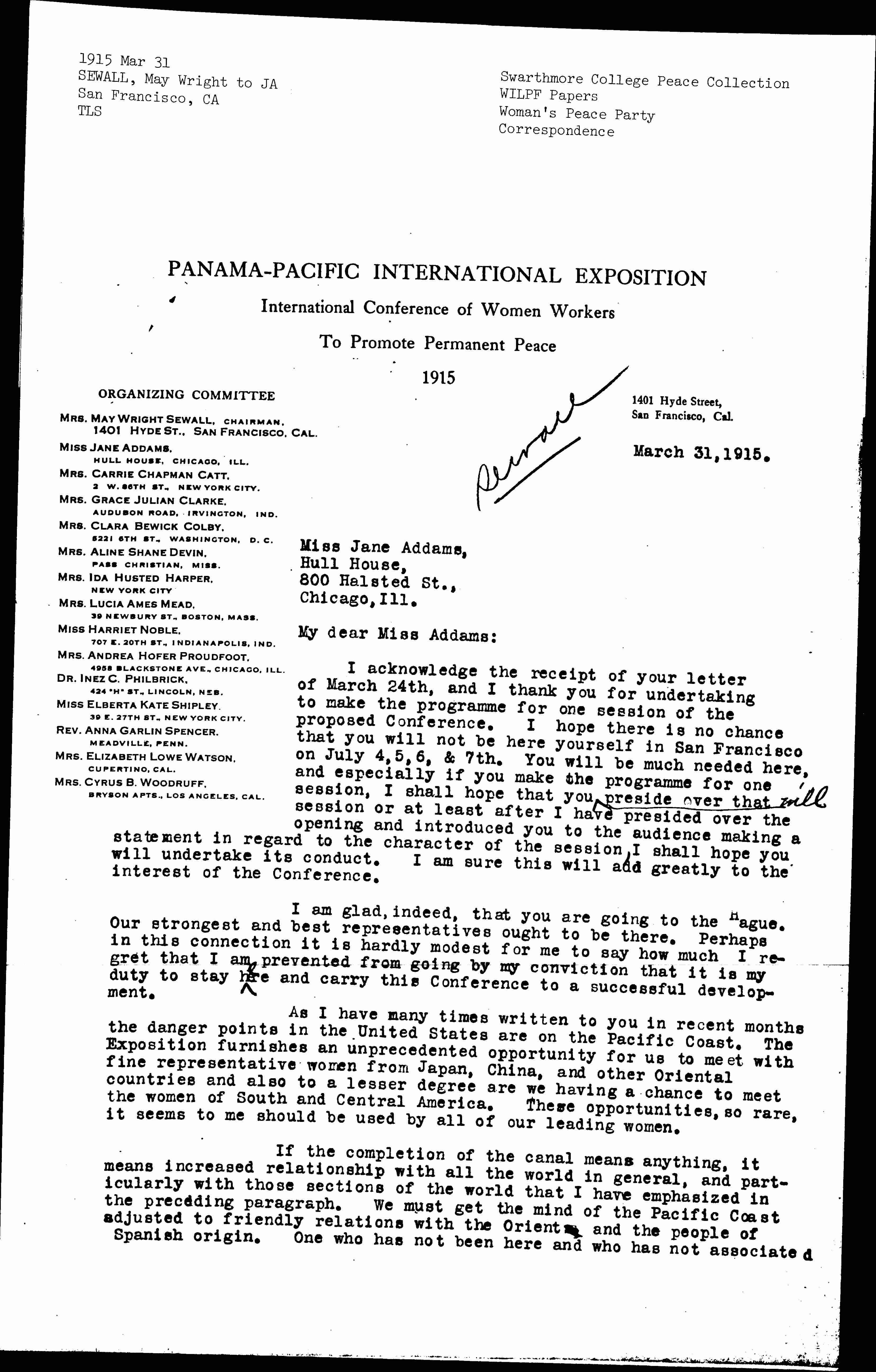 As I have many times written to you in recent months the danger points in the United States are on the Pacific Coast. The Exposition furnishes an unprecedented opportunity for us to meet with fine representative women from Japan, China, and other Oriental countries and also to a lesser degree are we having a chance to meet the women of South and Central America. These opportunities, so rare, it seems to me should be used by all of our leading women.