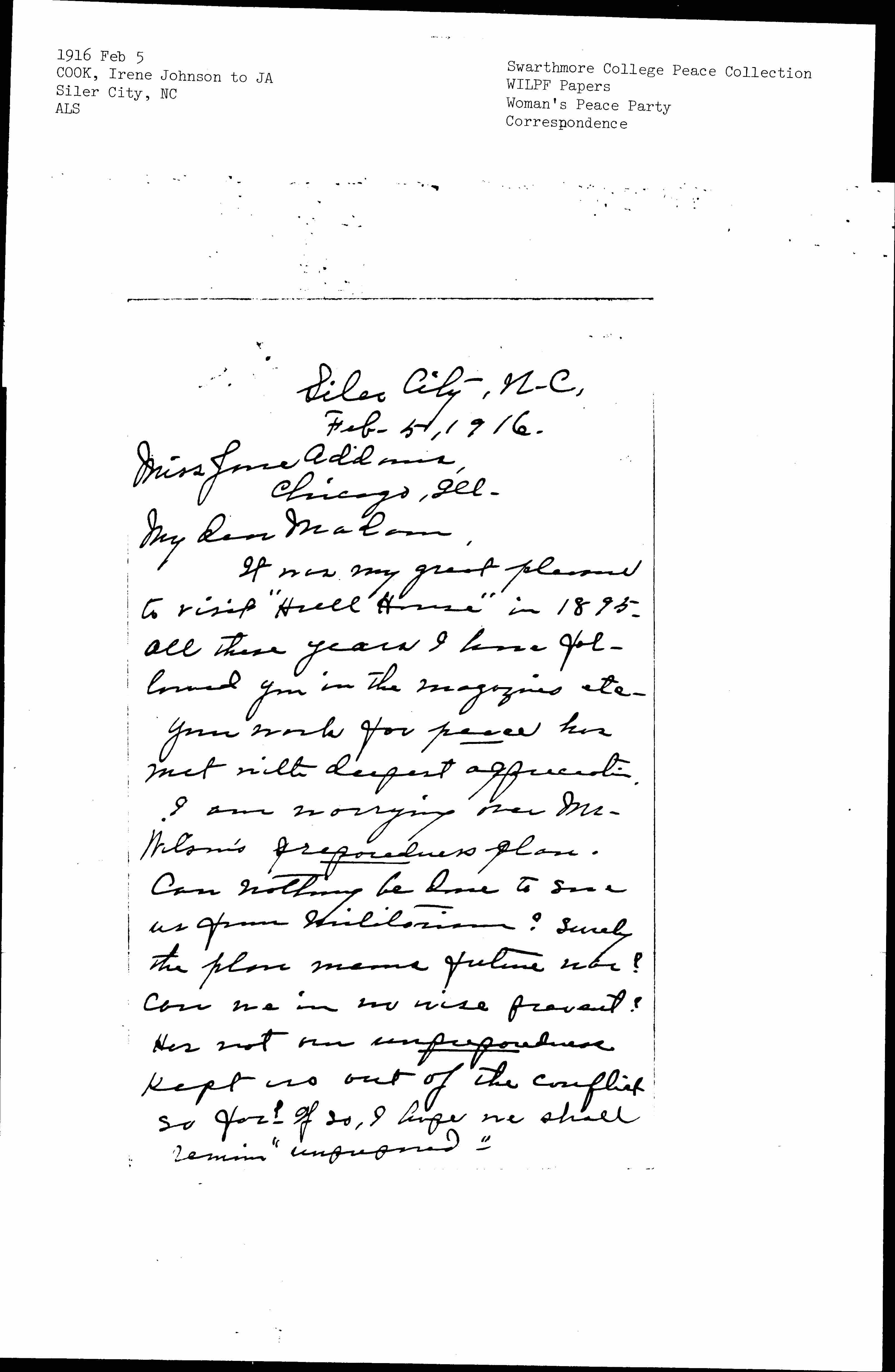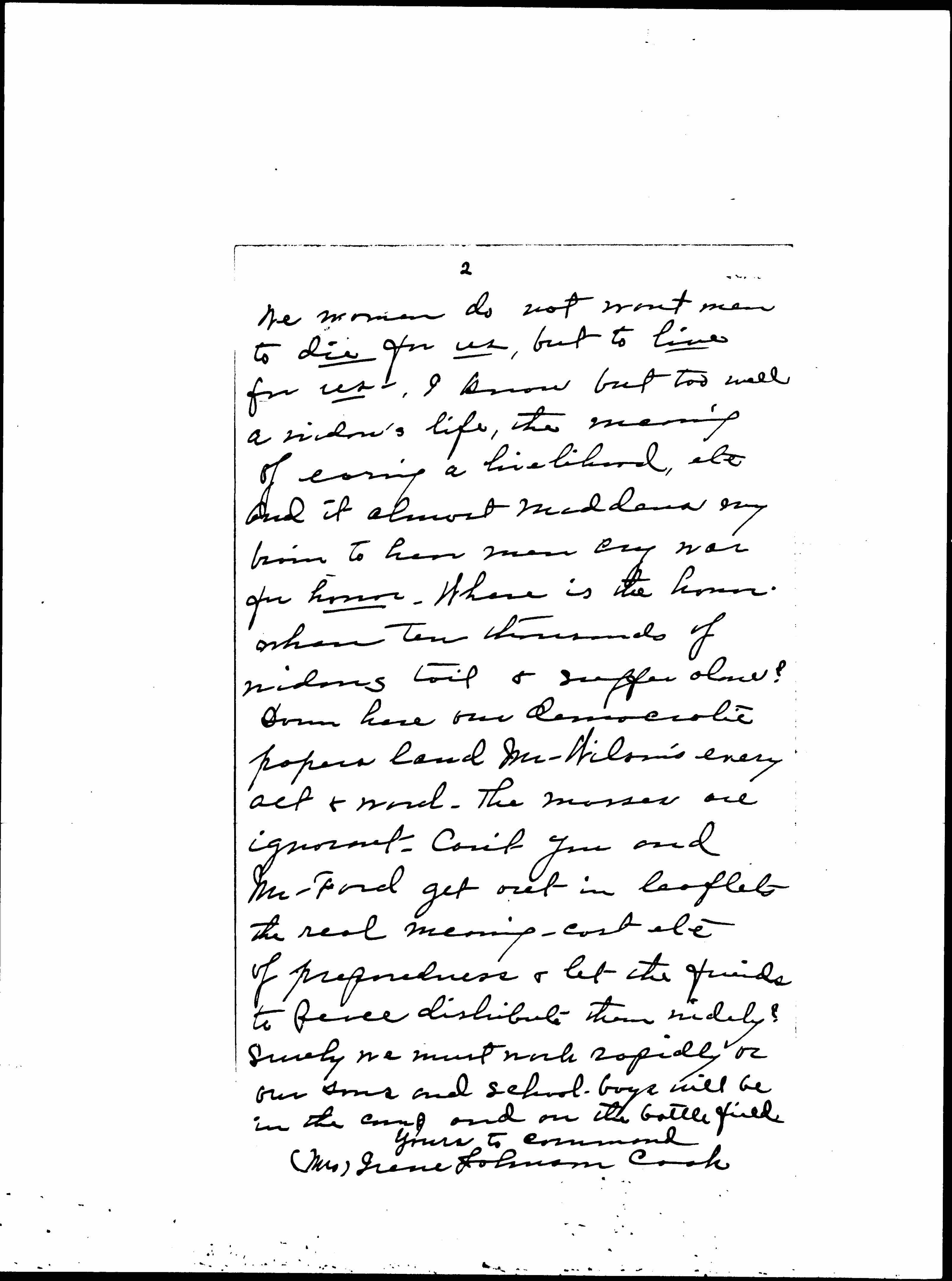 We women do not want men to die for us, but to live for us. I know but too well a widow's life, the meaning of earning a livelihood, etc and it almost maddens my brain to hear men cry war for honor. Where is the honor when ten thousands of widows toil & suffer alone? Even here our democratic papers laud Mr. Wilson's every act & word. The masses are ignorant. Can't you and Mr. Ford get out in leaflets the real meaning -- cost, etc of preparedness & let the friends to peace distribute them widely? Surely we must work rapidly or our sons and school-boys will be in the [cause] and on the battlefield.
