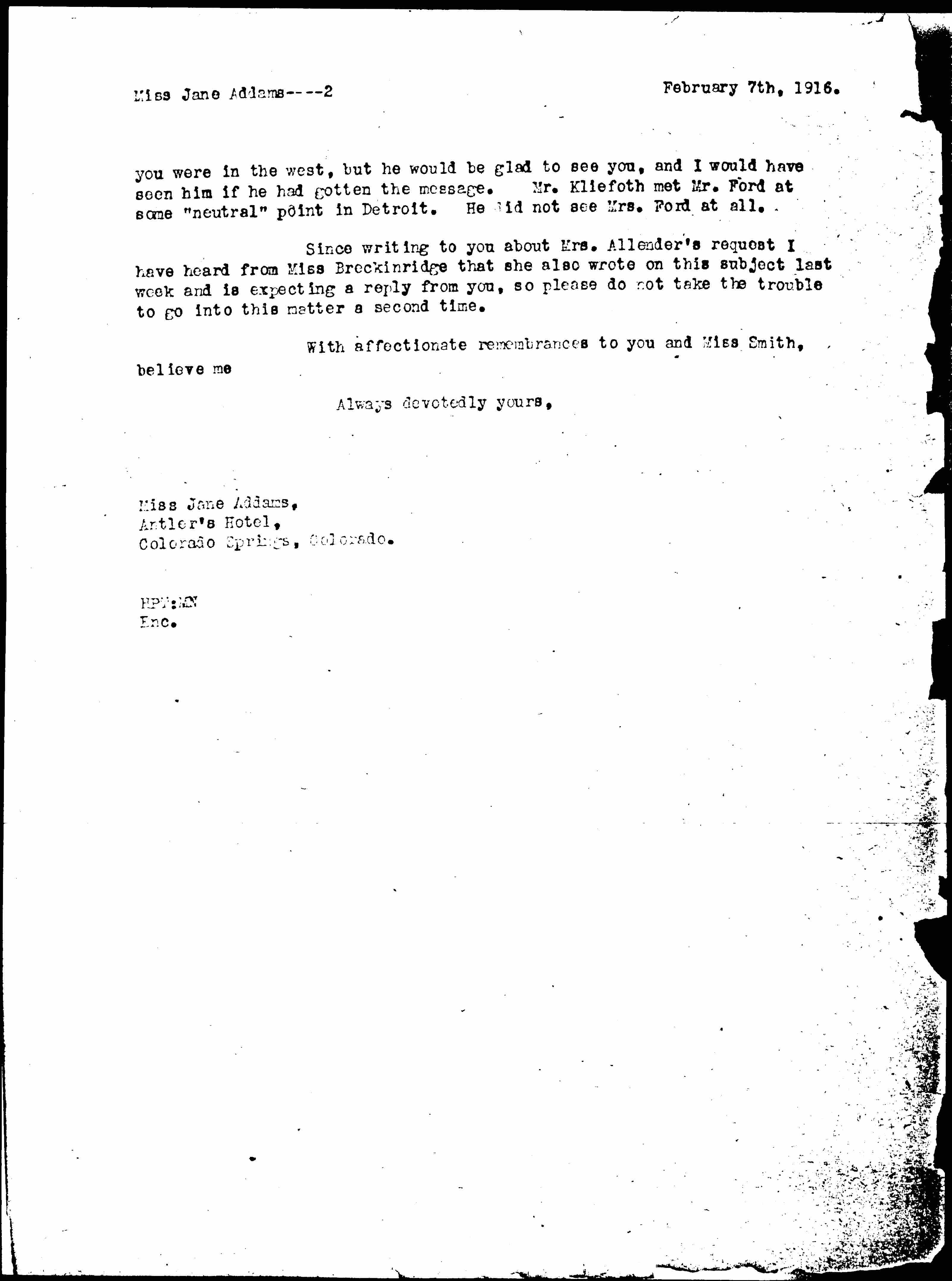 I have just had a little heart to heart talk with Mr. Kliefoth in Mr. Lochner's office. He went to Detroit and had a very satisfactory talk with Mr. Ford. He feels that some queer influence is at work to intercept communications to him regarding peace. Telegrams are not received and letters are also waylaid. Mr. Kliefoth suspects Liebold and Mr. Ford [himself] is convinced that somebody who is confidentially employed is making the trouble. He made no plan for seeing you as he knew [page 2] you were in the west, but he would be glad to see you, and I would have seen him if he had gotten the message. Mr. Kliefoth met Mr. Ford at some "neutral" point in Detroit. He did not see Mrs. Ford at all.