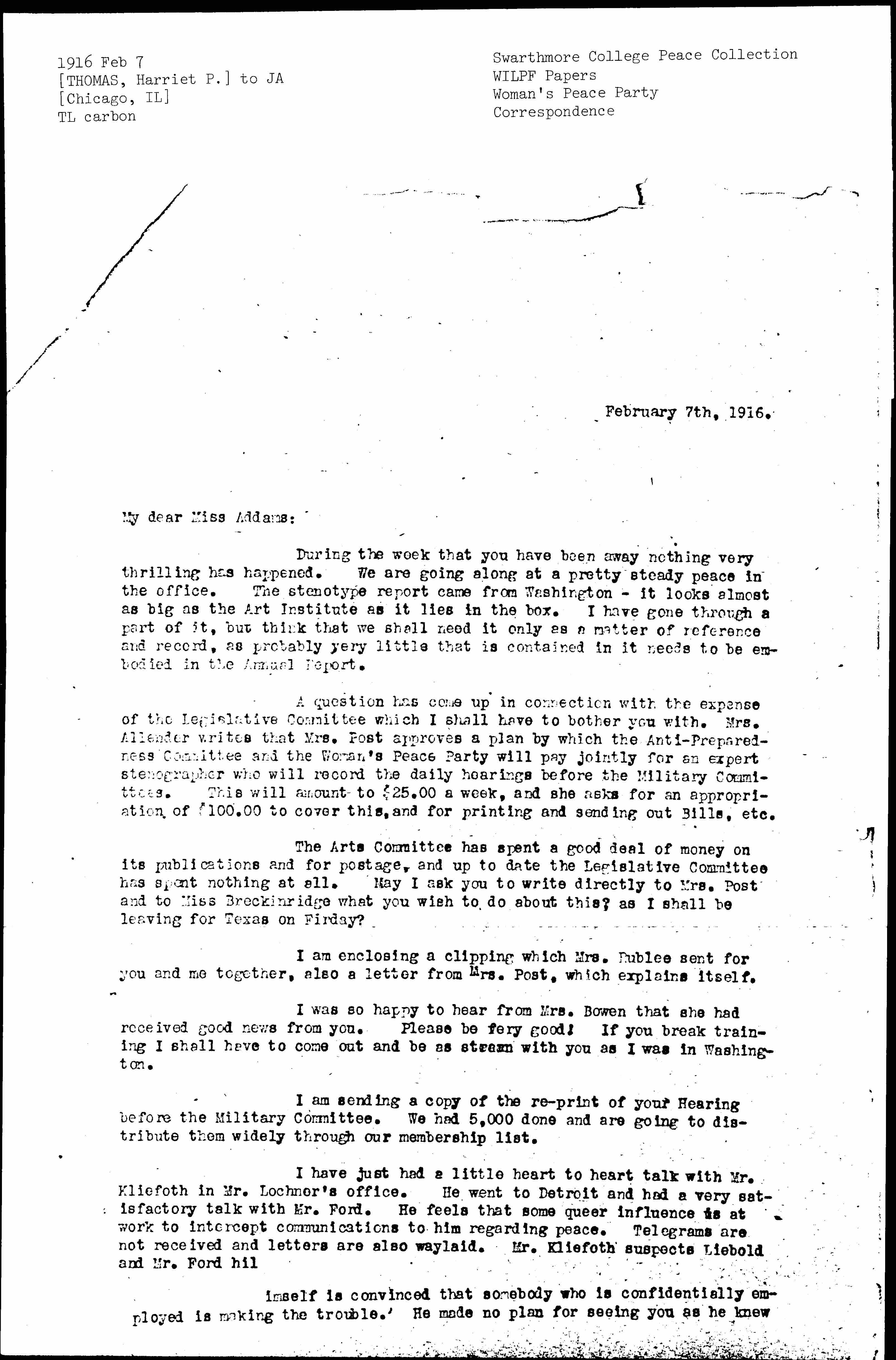 A question has come up in connection with the expense of the Legislative Committee which I shall have to bother you with. Mrs. Allender writes that Mrs. Post approves a plan by which the Anti-Preparedness Committee and the Woman's Peace Party will pay jointly for an expert stenographer who will record the daily hearings before the Military Committees. This will amount to $25.00 a week, and she asks for an appropriation of $100.00 to cover this, and for printing and sending out Bills, etc.