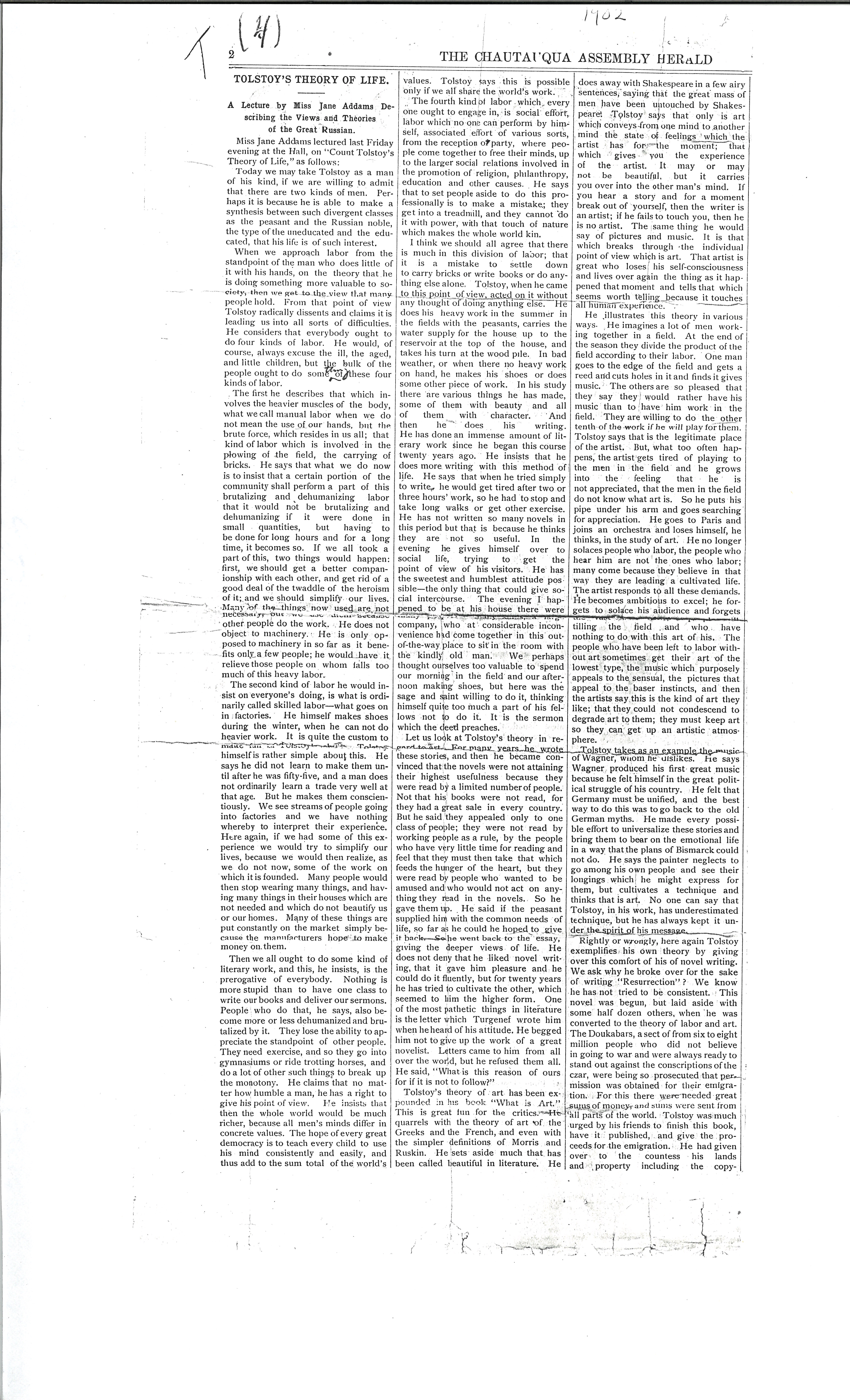 A Lecture by Miss Jane Addams Describing the Views and Theories of the Great Russian.