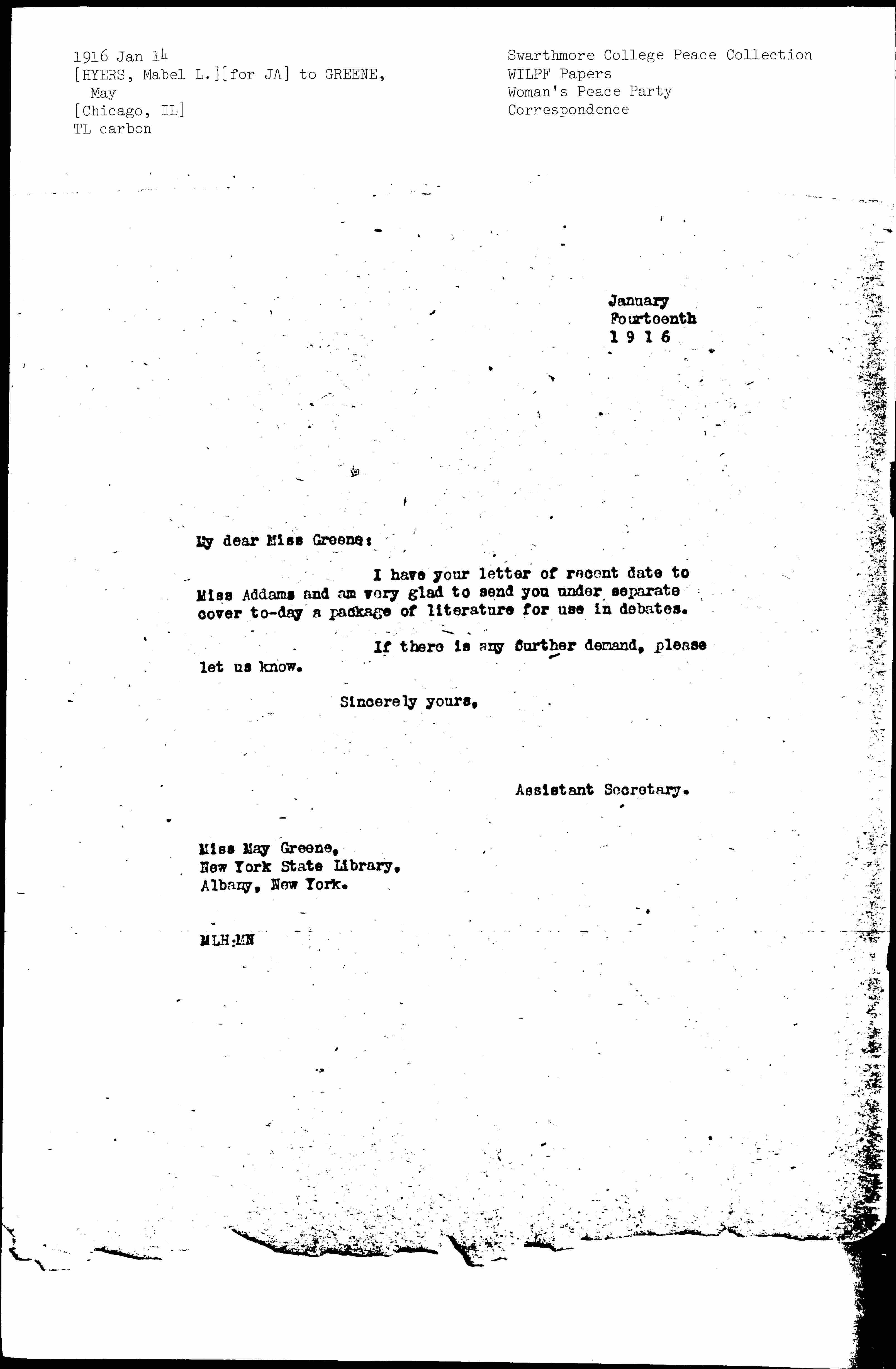 I have your letter of recent date to Miss Addams and am very glad to send you under separate cover [today] a package of literature for use in debates.