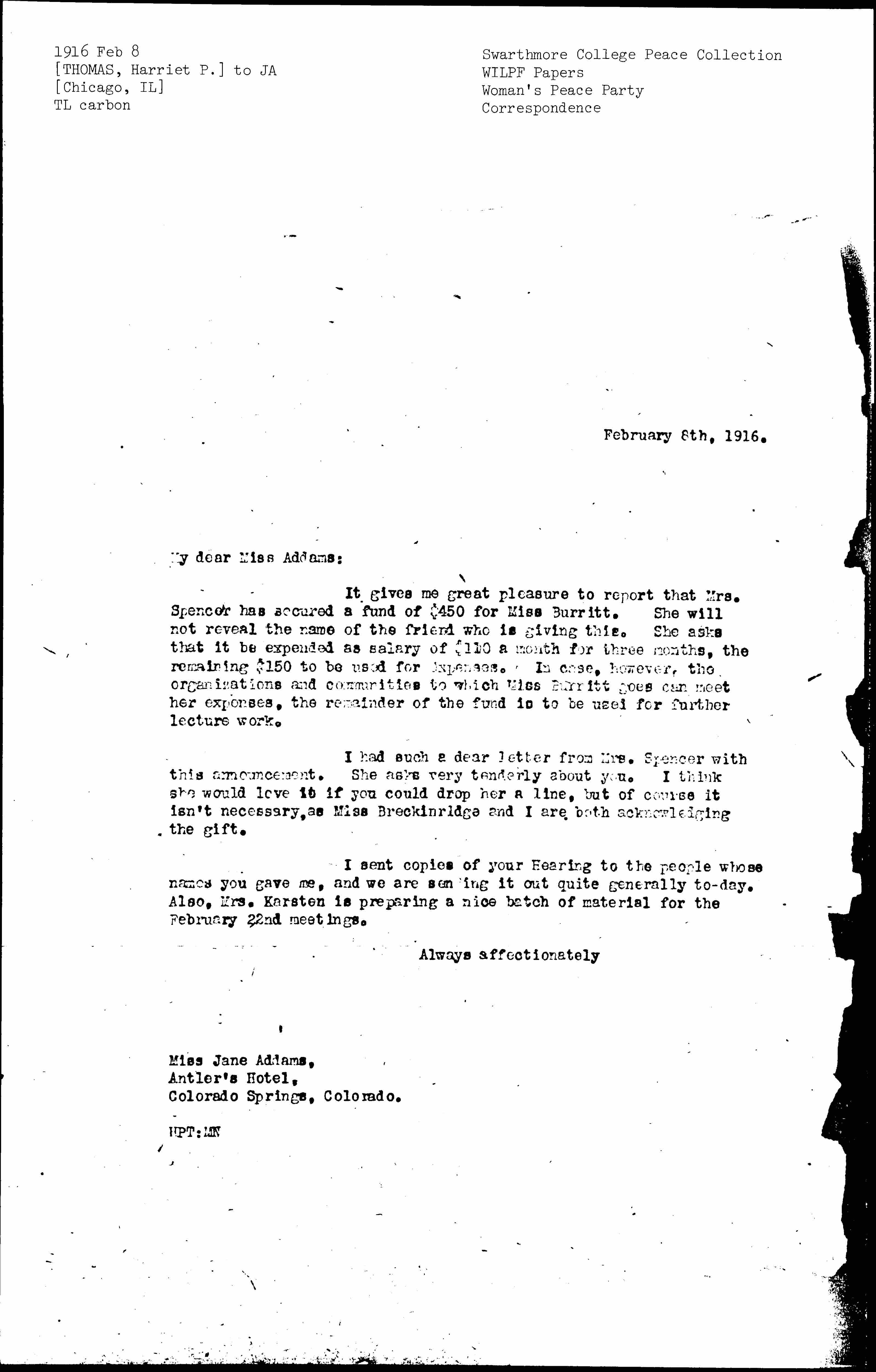 It gives me great pleasure to report that Mrs. Spencer has secured a fund of $450 for Miss Burritt. She will not reveal the name of the friend who is giving this. She asks that it be expended as salary of [$100] a month for three months, the remaining $150 to be used for expenses. In case, however, the organizations and communities to which Miss Burritt goes can meet her expenses, the remainder of the fund is to be used for further lecture work.