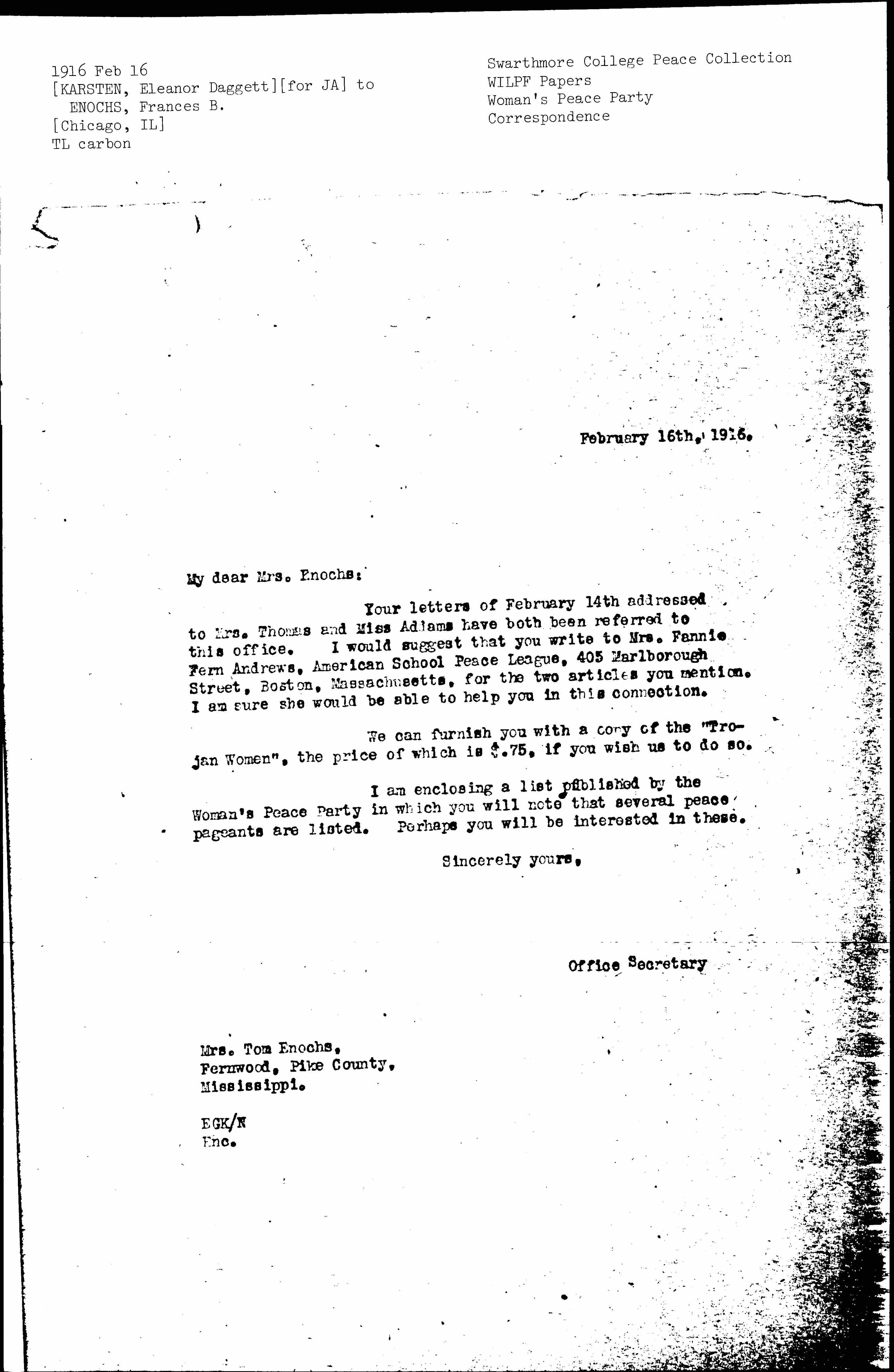 I am enclosing a list published by the Woman's Peace Party in which you will note that several peace pageants are listed. Perhaps you will be interested in these.