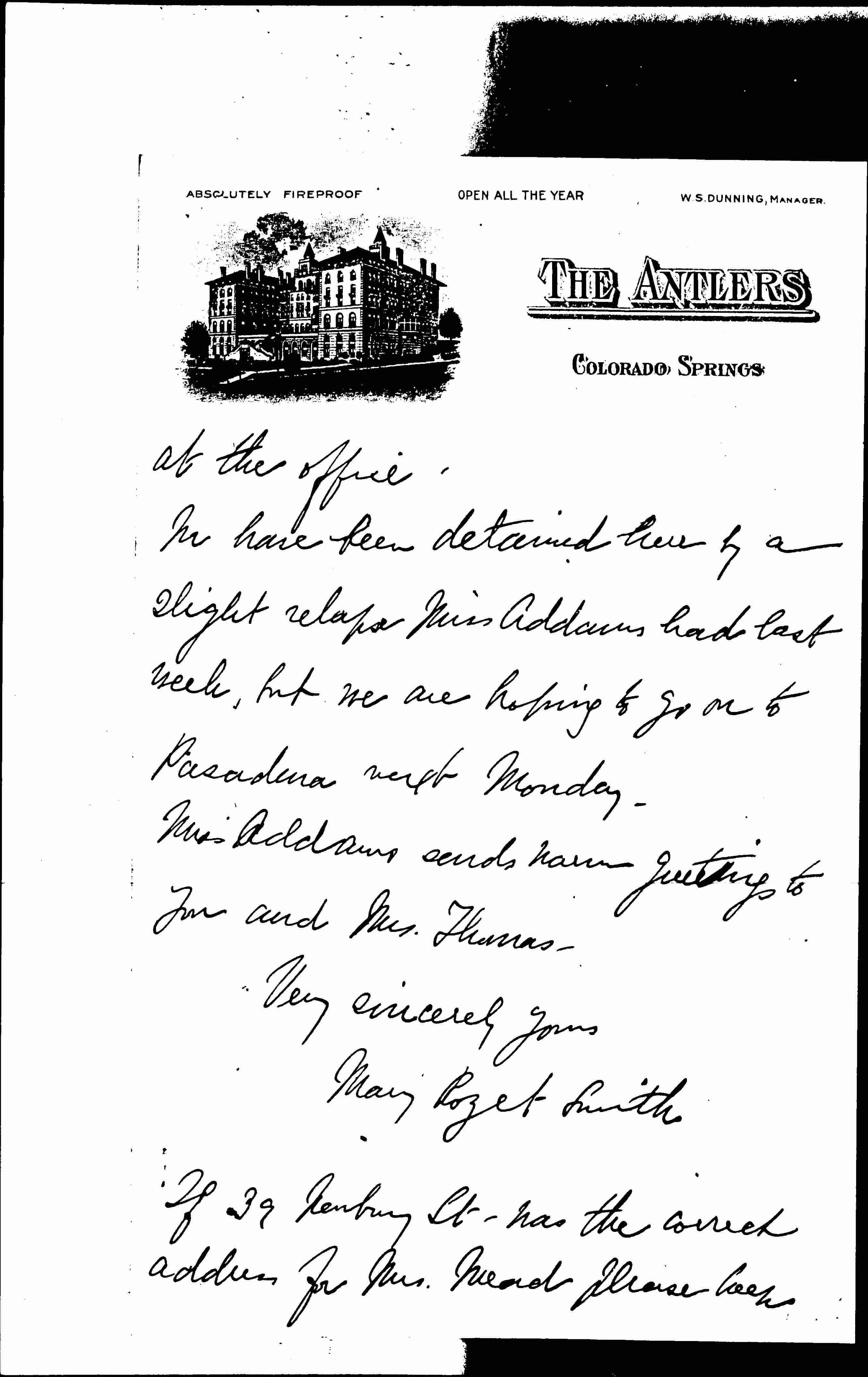 We have been detained here by a slight relapse Miss Addams had last week, but we are hoping to go on to Pasadena next Monday.