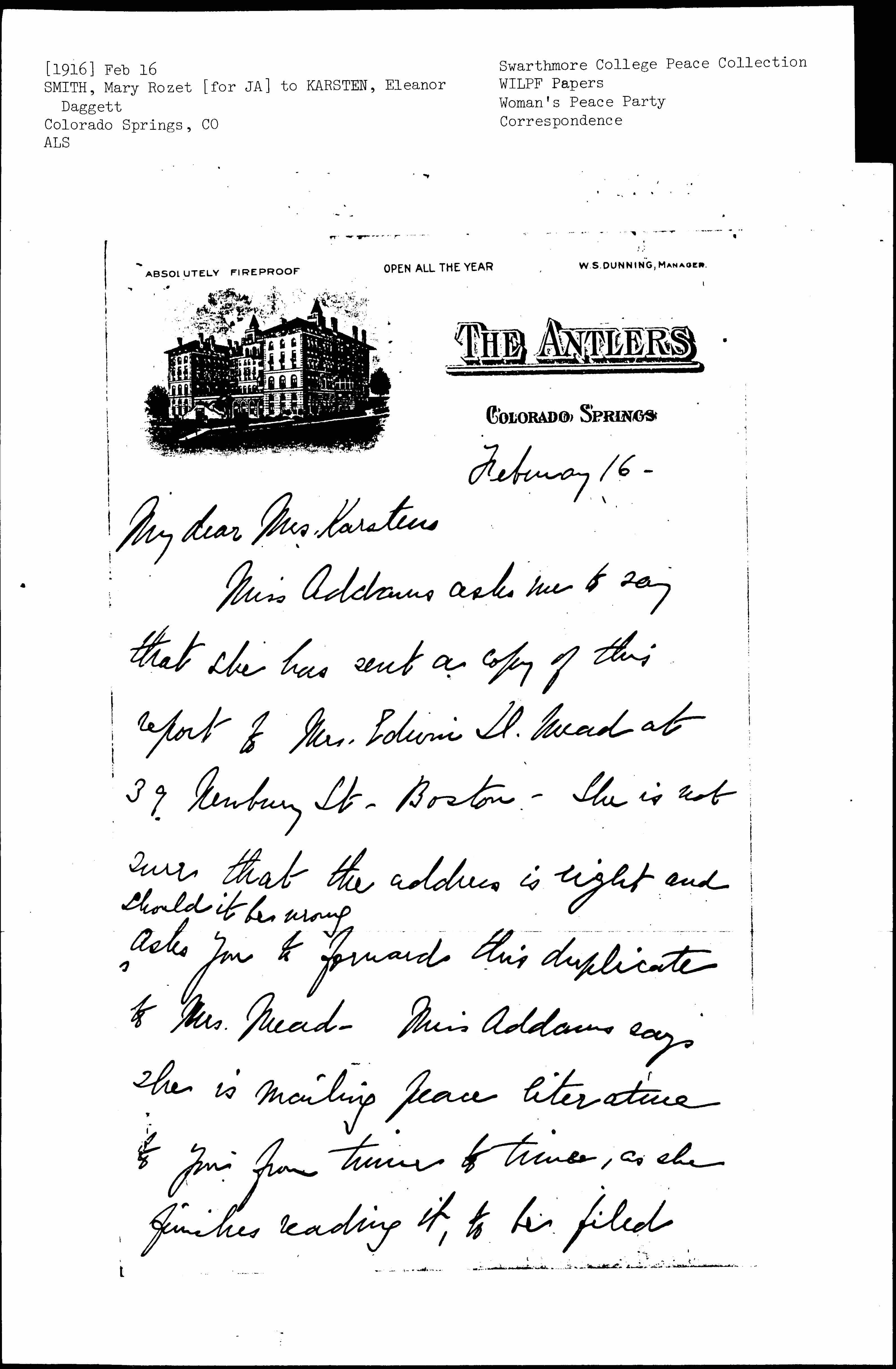 Miss Addams asks me to say that she has sent a copy of this report to Mrs. Edwin D. Mead at 39 Newbury St. Boston -- She is not sure that the address is right and <should it be wrong> asks you to forward this duplicate to Mrs. Mead. Miss Addams says she is mailing peace literature to you from time to time, as she finishes reading it, to be filed [page 2] at the office.