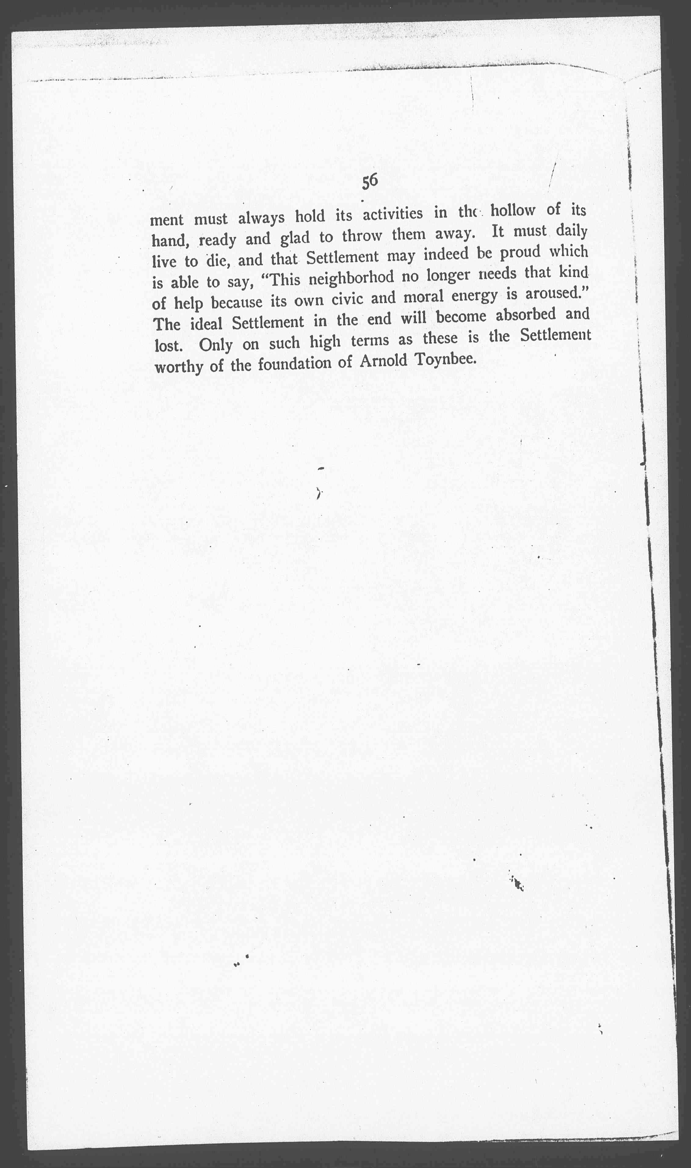 There is room in a Settlement for all sorts of social creeds. The man who believes that there is no use in the smaller activities because social affairs are so bad and so huge that only the city or state can cope with them, will some day find himself lifting his hat before the august spectacle of a fine and delicate character, [molded] in the most abject surroundings. The man who says that nothing is really accomplished by state activity and that we must concentrate our care upon the individual will some day find his heart breaking to see a child of promise and power broken down by sheer weight of overwork and over-hours, and he will be forced to admit that nothing but state regulation can prevent the premature thrusting of children into industry and the shocking social waste which follows; or he will see a family lately emigrated and full of the vigor of country life gradually growing pale and ill and dropping out one by one from their places in the community from sheer lack of decent air and light in the house they occupy, and he will appeal to the city [page 5] for better regulation and enforcement of tenement house laws in blank despair of individual effort.