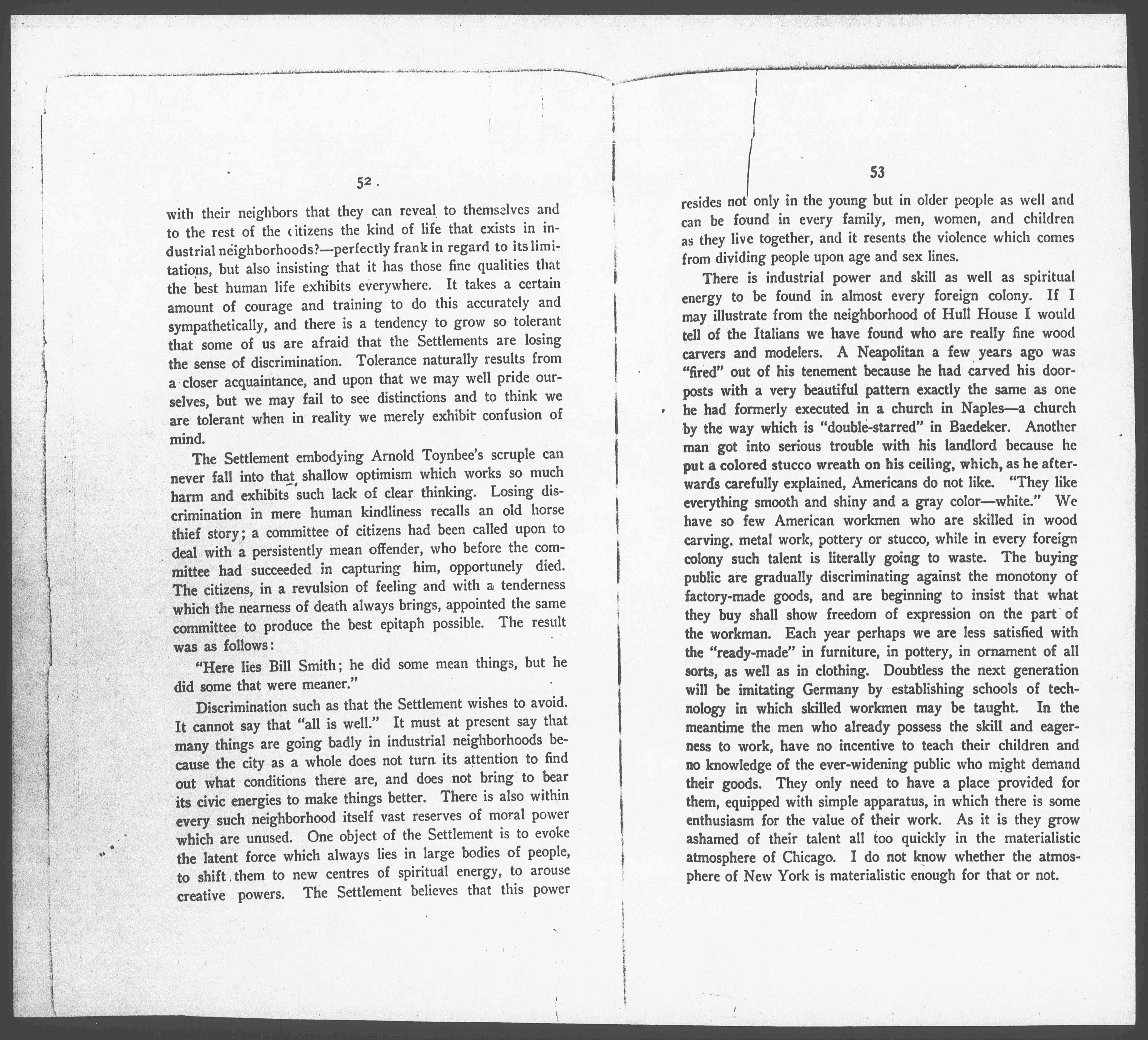 What is it that these groups of people representing a certain amount of education and material advantage, who go to live in industrial neighborhoods, are trying to do? They certainly cannot point with pride to a list of achievements, for that list no matter how long will always be pitifully [meager] when compared to the needs. They are certainly not trying to build up a new institution for we find within the Settlement itself a great distrust of institutionalism. May we not say that their first aim is to get into such social and natural relations [page 2] with their neighbors that they can reveal to themselves and to the rest of the citizens the kind of life that exists in industrial neighborhoods? -– perfectly frank in regard to its limitations, but also insisting that it has those fine qualities that the best human life exhibits everywhere. It takes a certain amount of courage and training to do this accurately and sympathetically, and there is a tendency to grow so tolerant that some of us are afraid that the Settlements are losing the sense of discrimination. Tolerance naturally results from a closer acquaintance, and upon that we may well pride ourselves, but we may fail to see distinctions and to think we are tolerant when in reality we merely exhibit confusion of mind.