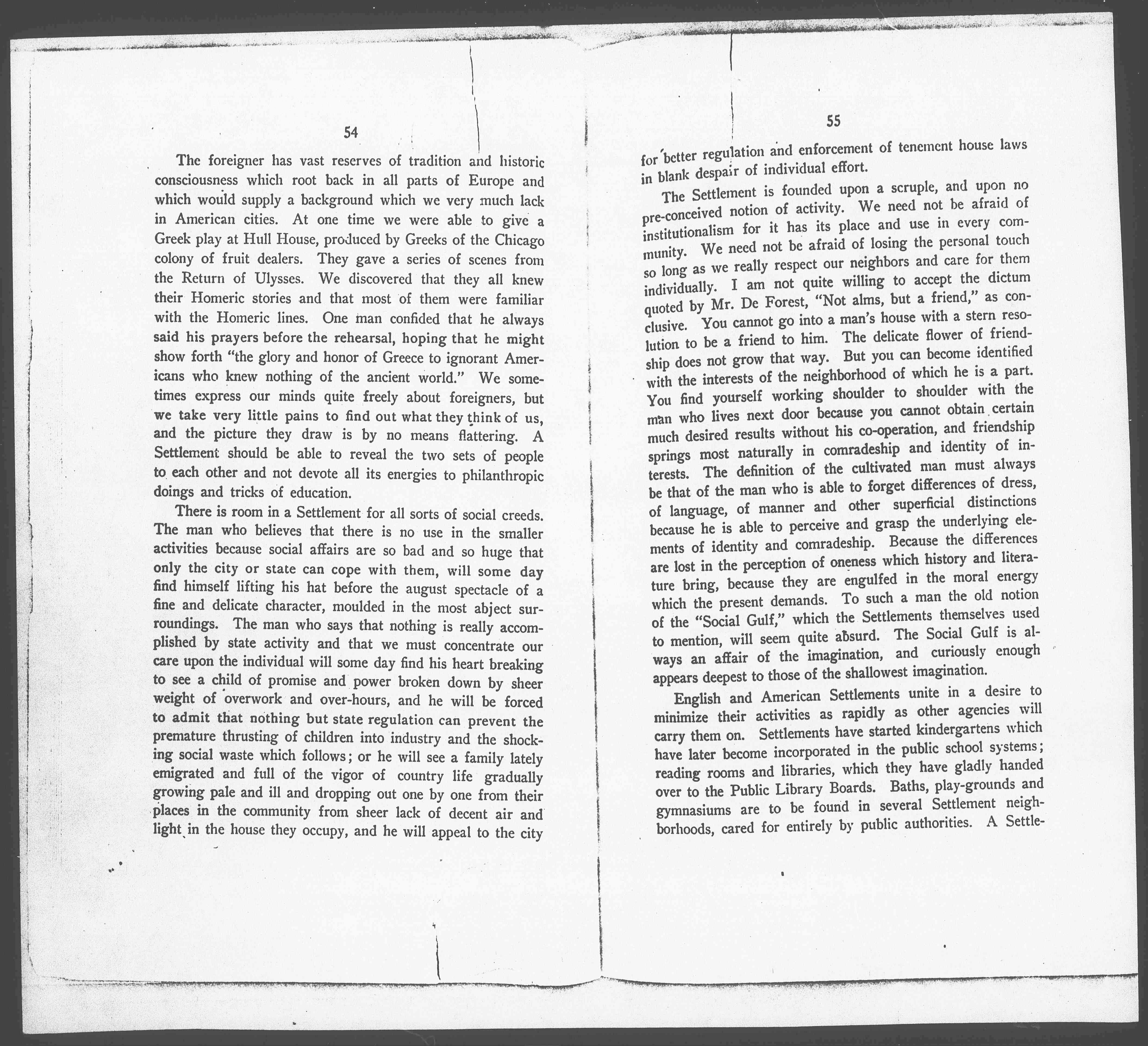 The Settlement is founded upon a scruple, and upon no [preconceived] notion of activity. We need not be afraid of institutionalism for it has its place and use in every community. We need not be afraid of losing the personal touch so long as we really respect our neighbors and care for them individually. I am not quite willing to accept the dictum quoted by Mr. DeForest, "Not alms, but a friend," as conclusive. You cannot go into a man's house with a stern resolution to be a friend to him. The delicate flower of friendship does not grow that way. But you can become identified with the interests of the neighborhood of which he is a part. You find yourself working shoulder to shoulder with the man who lives next door because you cannot obtain certain much desired results without his co-operation, and friendship springs most naturally in comradeship and identity of interests. The definition of the cultivated man must always be that of the man who is able to forget differences of dress, of language, of manner and other superficial distinctions because he is able to perceive and grasp the underlying elements of identity and comradeship. Because the differences are lost in the perception of oneness which history and literature bring, because they are engulfed in the moral energy which the present demands. To such a man the old notion of the "Social Gulf," which the Settlements themselves used to mention, will seem quite absurd. The Social Gulf is always an affair of the imagination, and curiously enough appears deepest to those of the shallowest imagination.