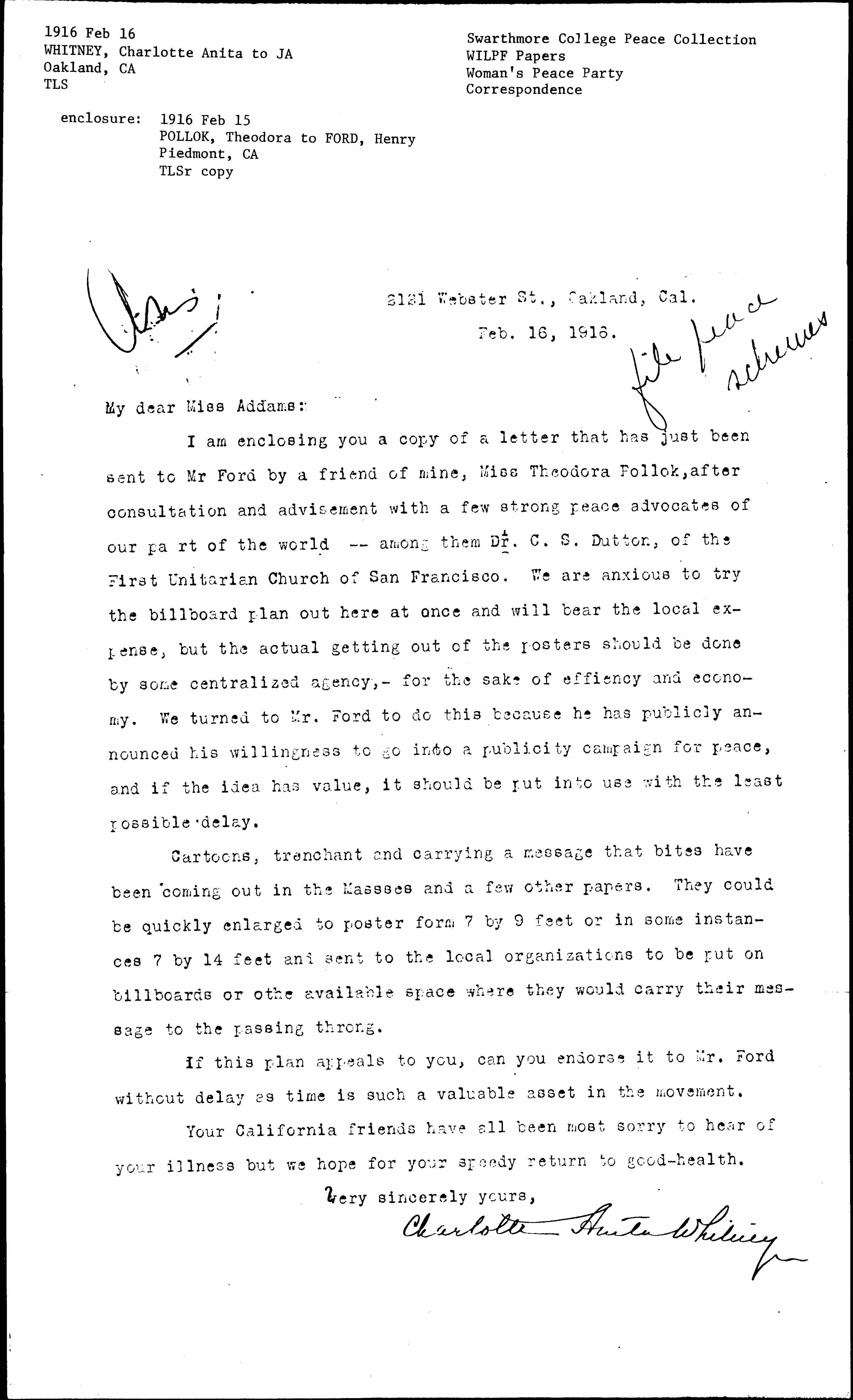 I am enclosing you a copy of a letter that has just been sent to Mr Ford by a friend of mine, Miss Theodora Pollok, after consultation and advisement with a few strong peace advocates of our part of the world -- among them Dr. C. S. Dutton, of the First Unitarian Church of San Francisco. We are anxious to try the billboard plan out here at once and will bear the local expense, but the actual getting out of the posters should be done by some centralized agency, -- for the sake of efficiency and economy. We turned to Mr. Ford to do this because he has publicly announced his willingness to go into a publicity campaign for peace, and if the idea has value, it should be put into use with the least possible delay.