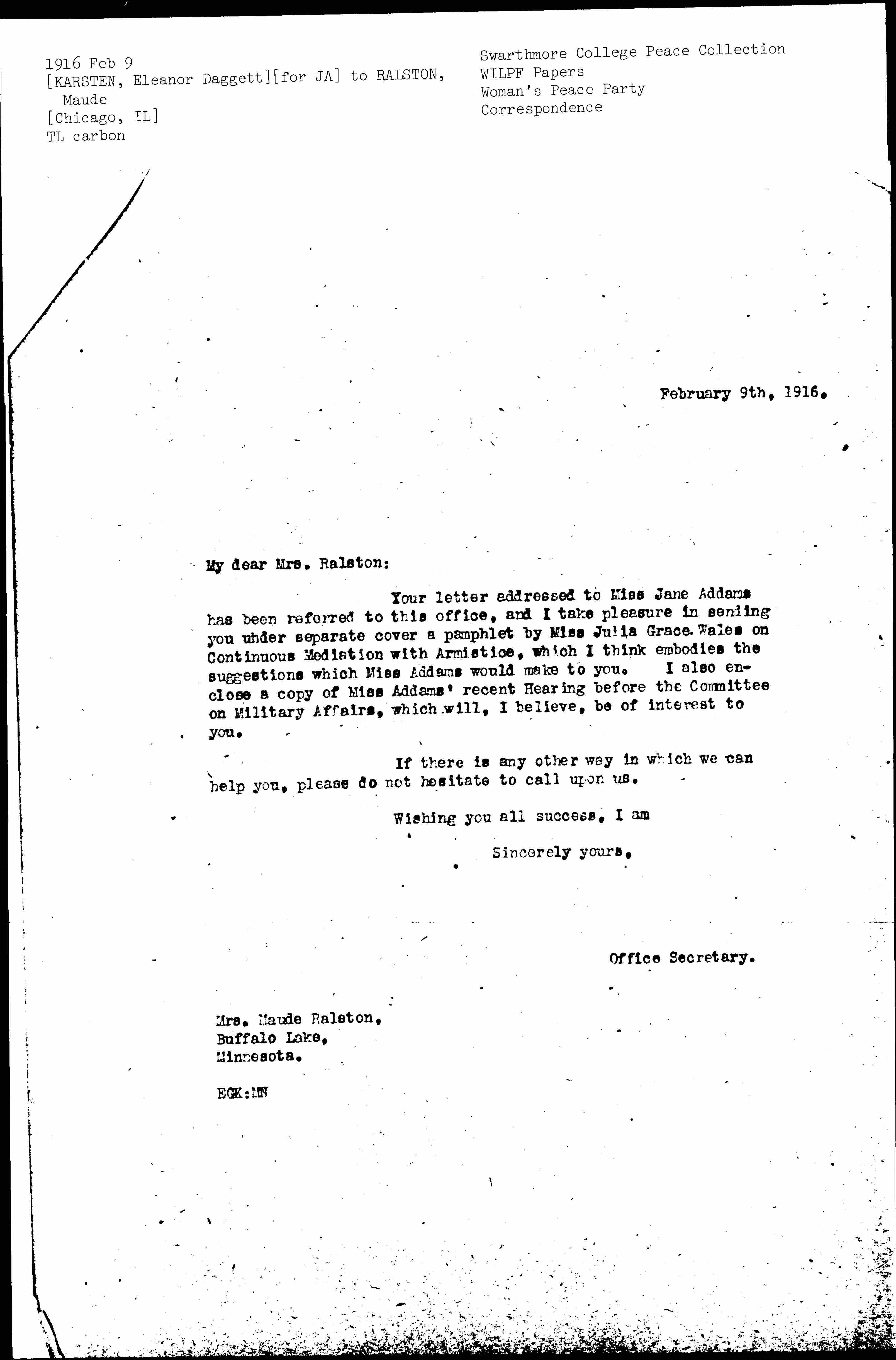 Your letter addressed to Miss Jane Addams has been referred to this office, and I take pleasure in sending you under separate cover a pamphlet by Miss Julia Grace Wales on Continuous Mediation with Armistice, which I think embodies the suggestions which Miss Addams would make to you. I also enclose a copy of Miss Addams' recent Hearing before the Committee on Military Affairs, which will, I believe, be of interest to you.