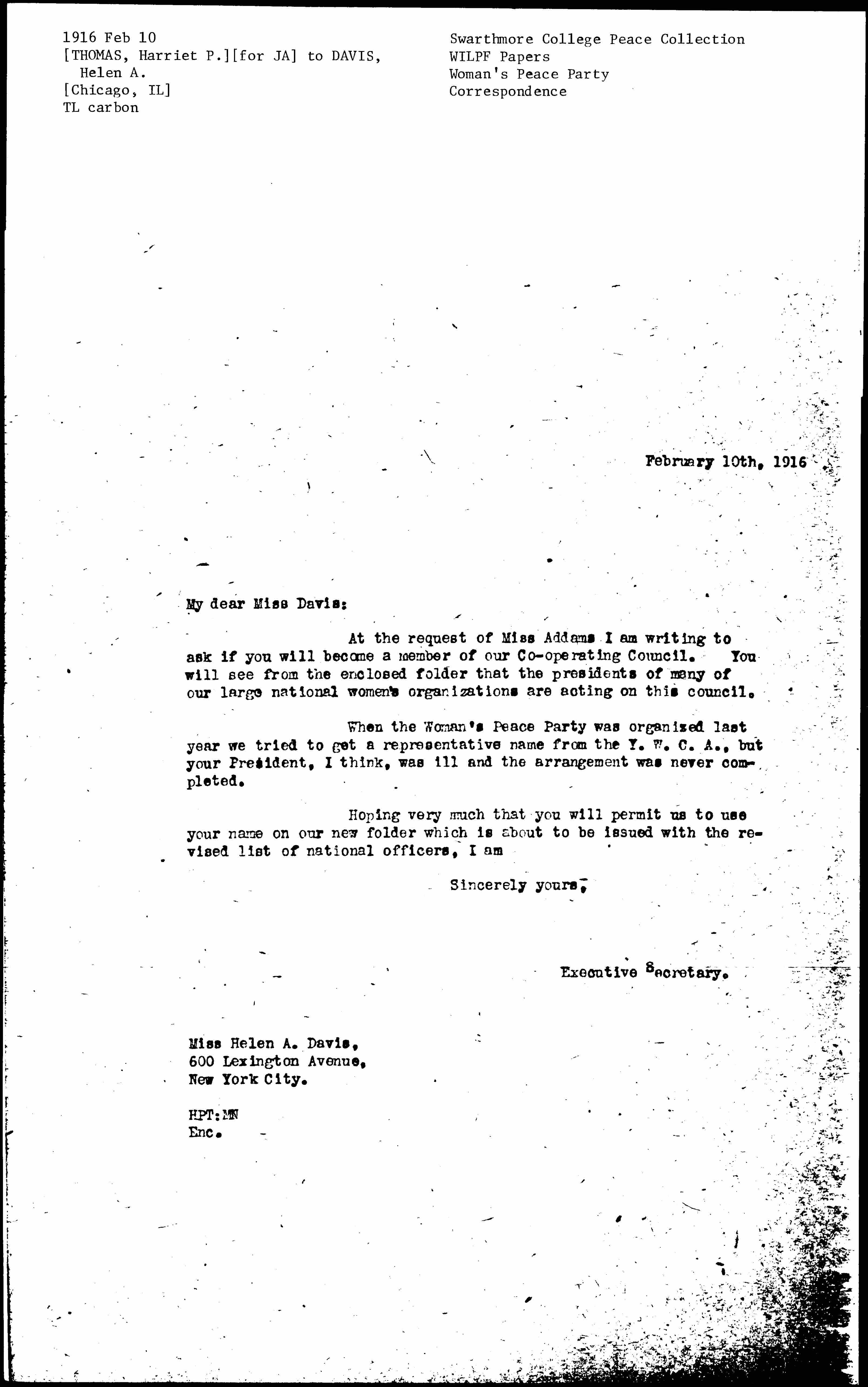 At the request of Miss Addams I am writing to ask if you will become a member of our [Cooperating] Council. You will see from the enclosed folder that the presidents of many of our large national women's organizations are acting on this council.