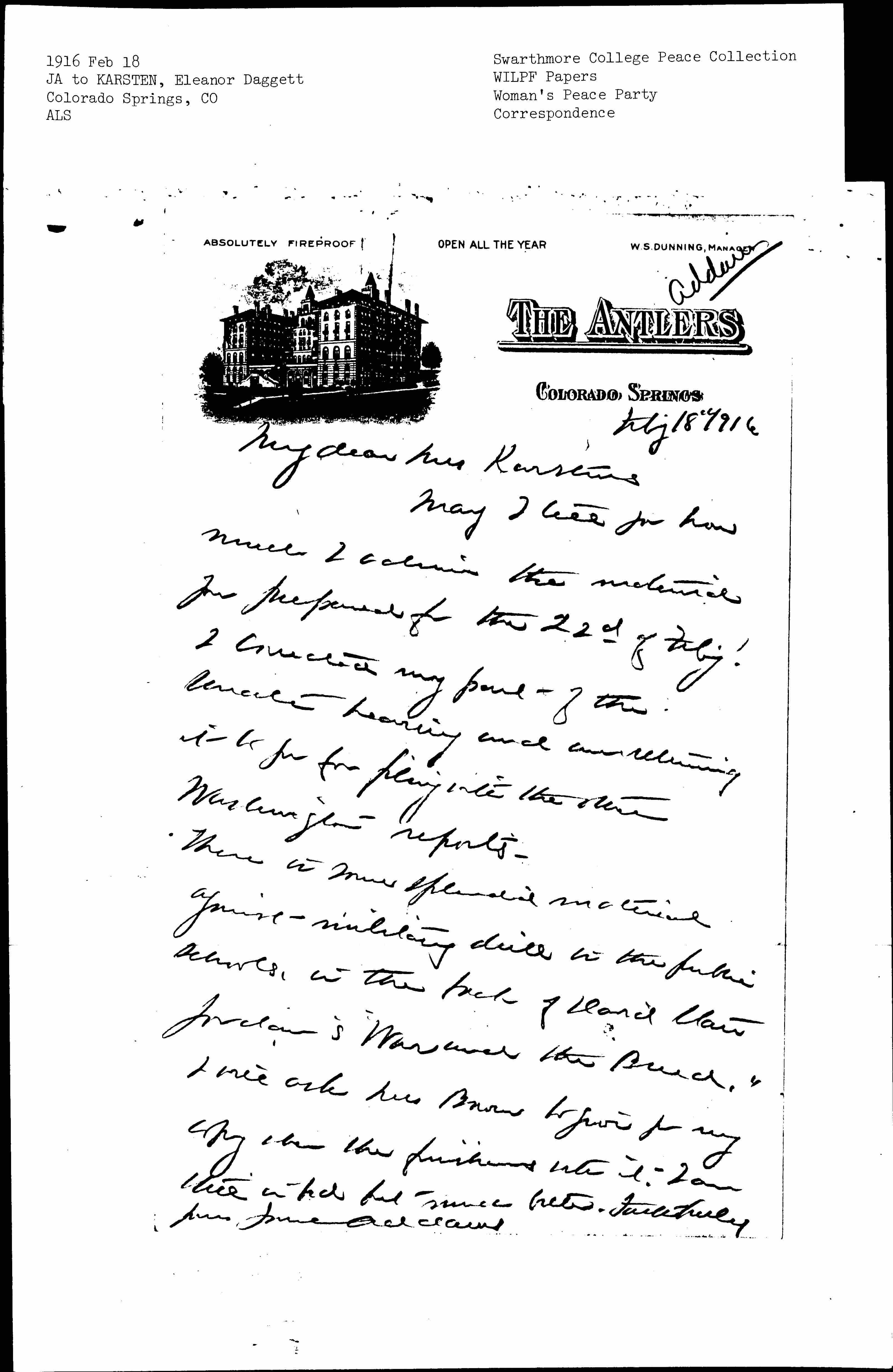 There is more splendid material against military drill in the public schools in the back of David Starr Jordan's "War and the Breed." I will ask Mrs Bowen to give you my copy when she finishes with it. I am still in bed but much better. Faithfully yours, Jane Addams