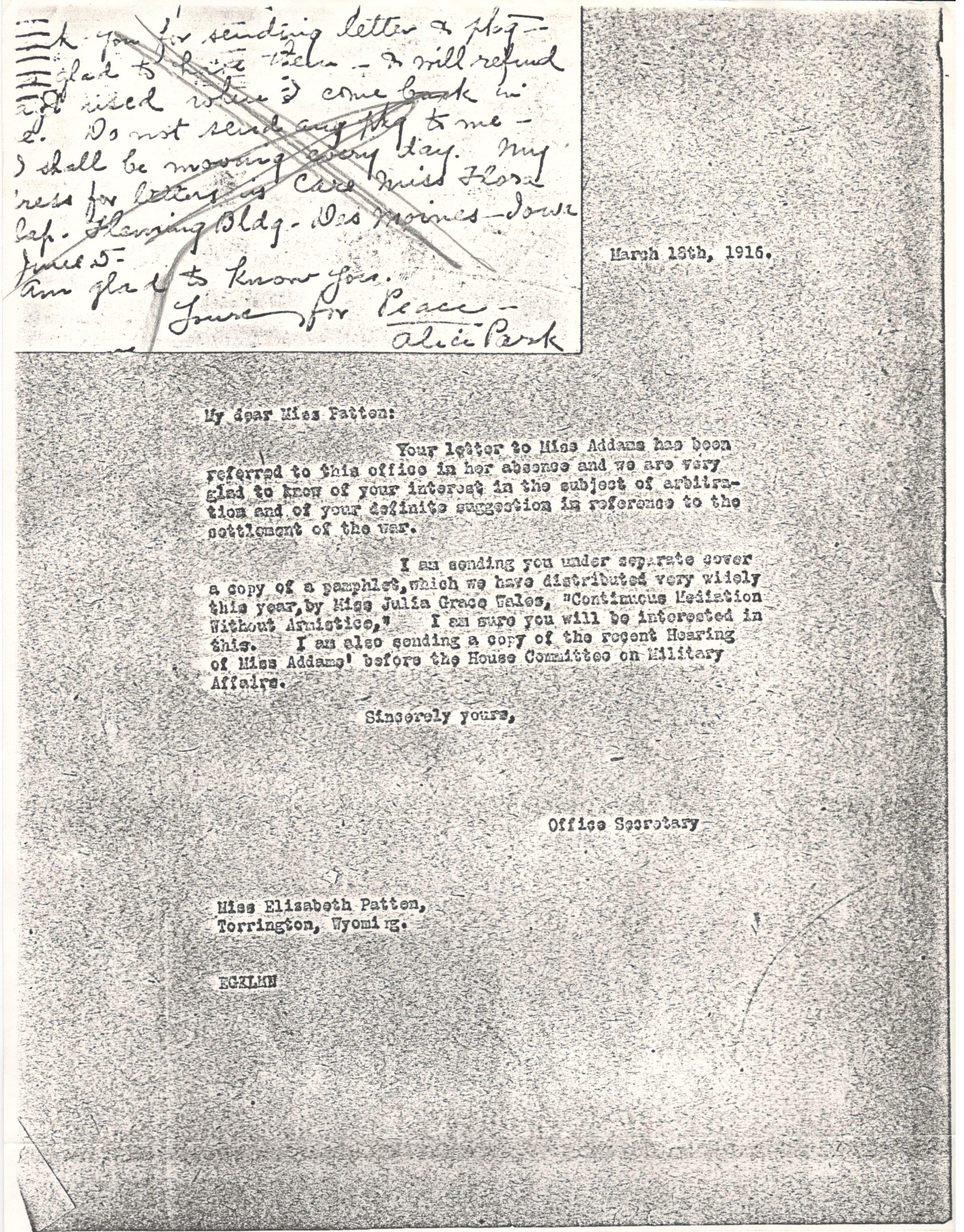 Your letter to Miss Addams has been referred to this office in her absence and we are very glad to know of your interest in the subject of arbitration and of your definite suggestion in reference to the settlement of the war.