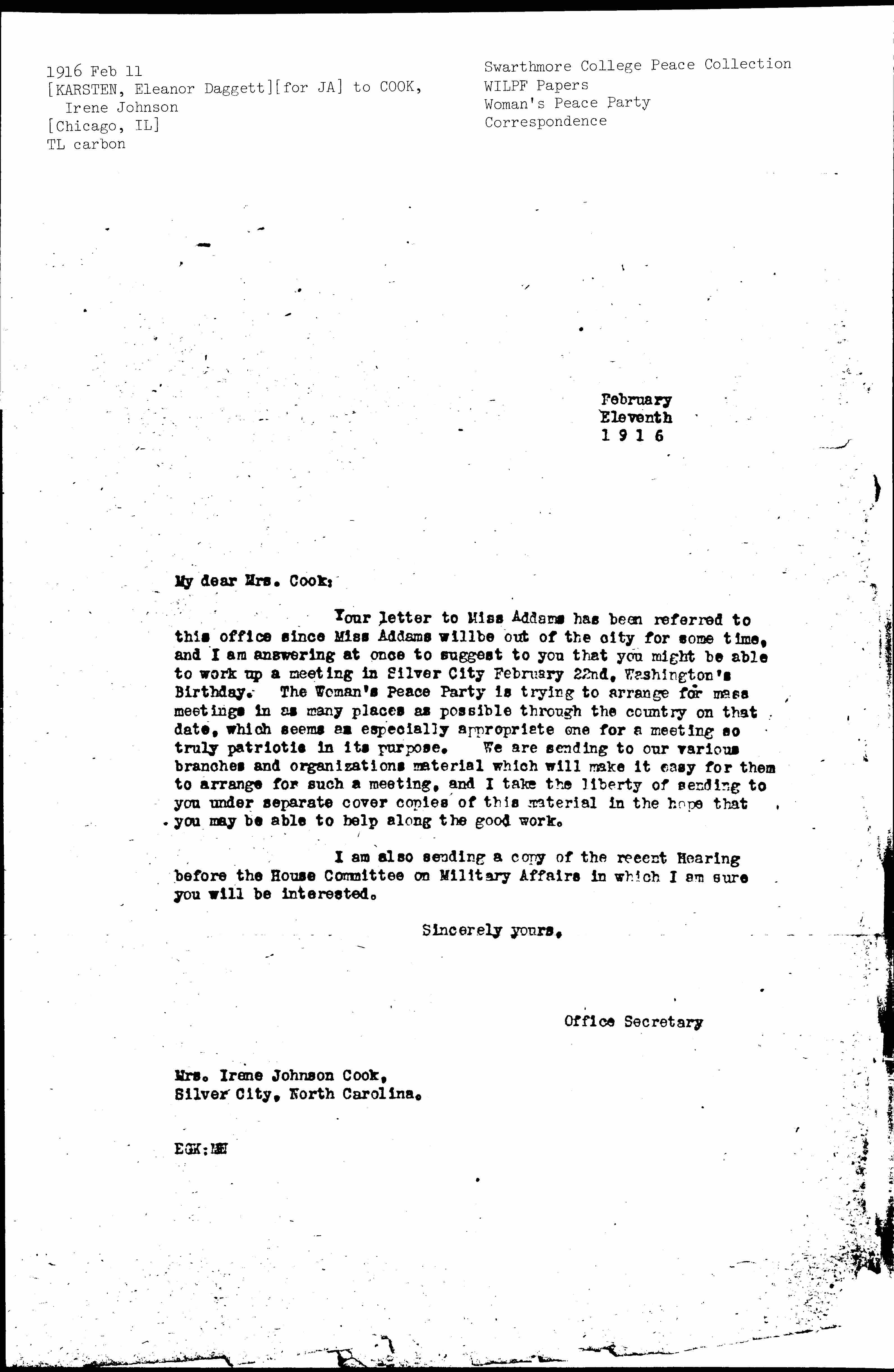 Your letter to Miss Addams has been referred to this office since Miss Addams will be out of the city for some time, and I am answering at once to suggest to you that you might be able to work up a meeting in Silver City February 22nd, Washington's Birthday. The Woman's Peace Party is trying to arrange for mass meetings in as many places as possible through the country on that date, which seems an especially appropriate one for a meeting so truly patriotic in its purpose. We are sending to our various branches and organizations material which will make it easy for them to arrange for such a meeting, and I take the liberty of sending to you under separate cover copies of this material in the hope that you may be able to help along the good work.