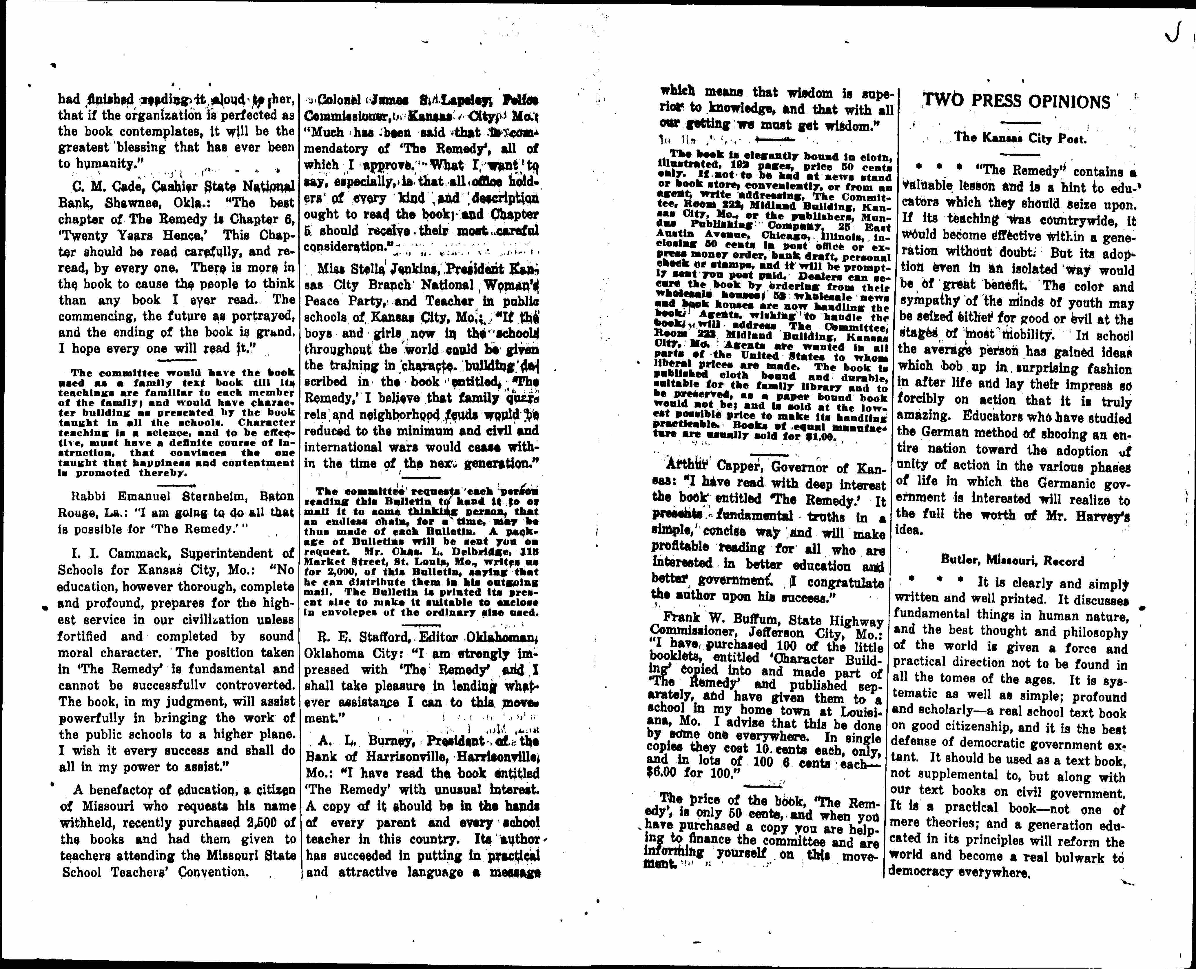 A. L. Burney, President of the Bank of Harrisonville, Harrisonville, Mo.: "I have read the book entitled 'The Remedy' with unusual interest. A copy of it should be in the hands of every parent and every school teacher in this country. Its author has succeeded in putting in practical and attractive language a message [page 4] which means that wisdom is superior to knowledge, and that with all our getting we must get wisdom."