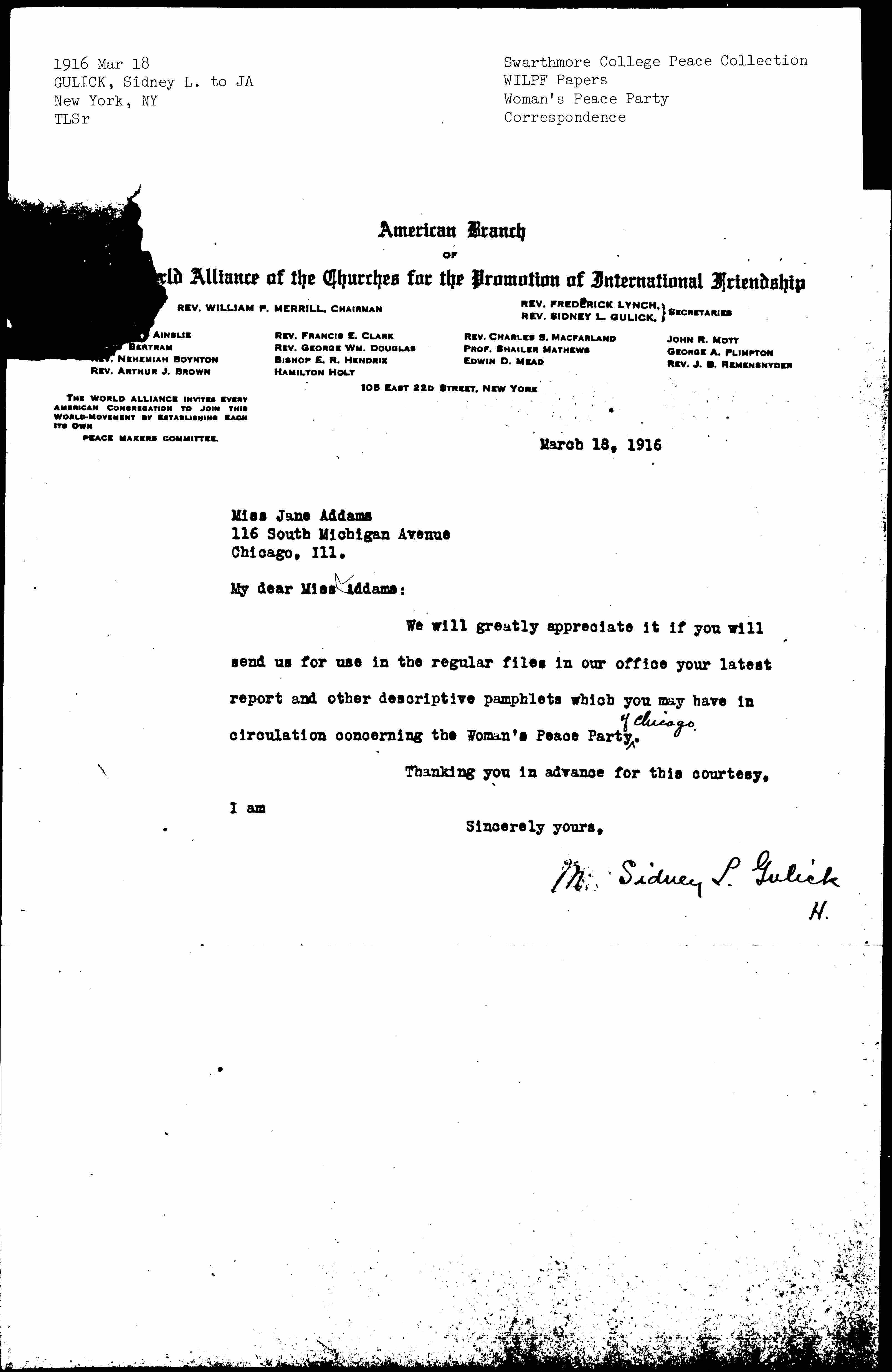 [Mr] Sidney L. Gulick [signed by secretary] H.