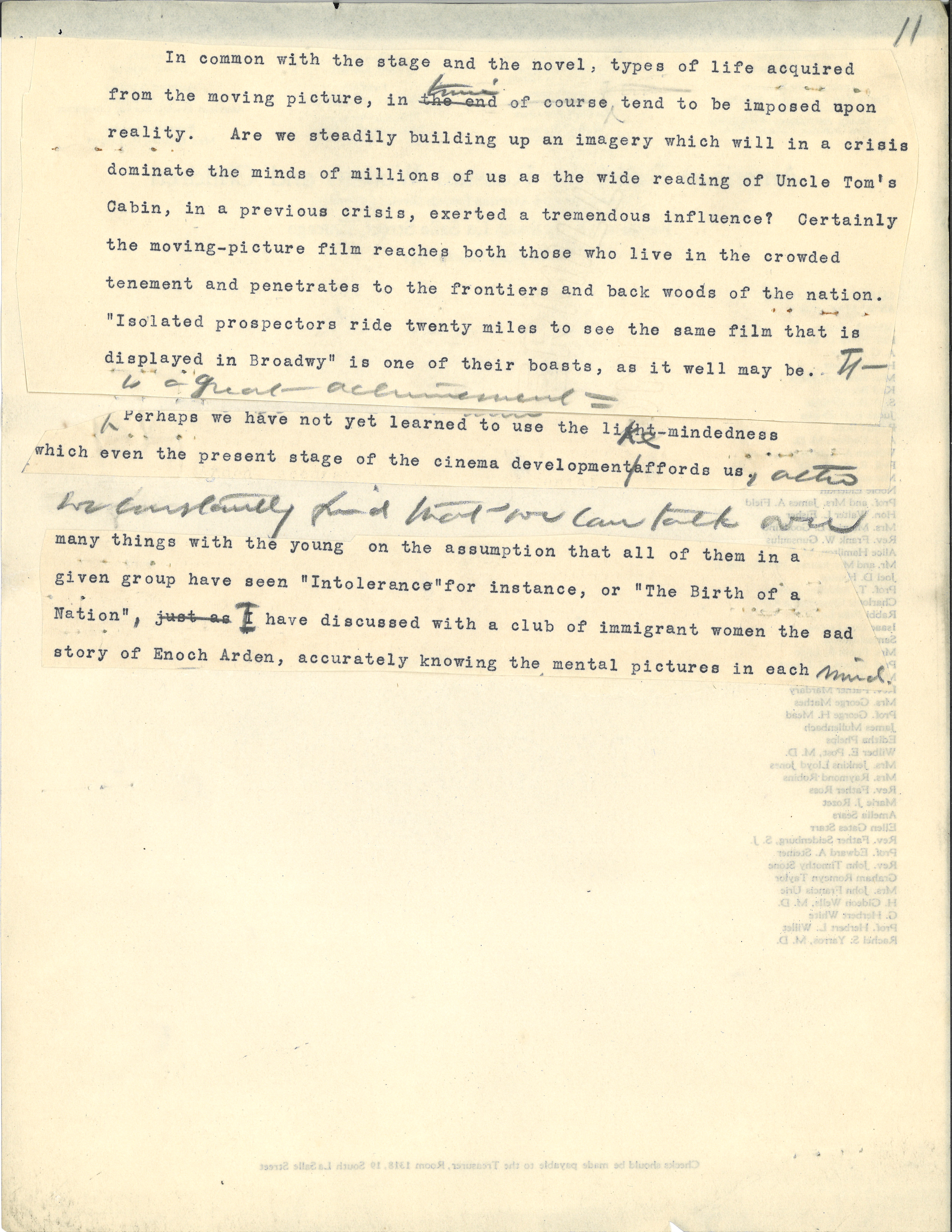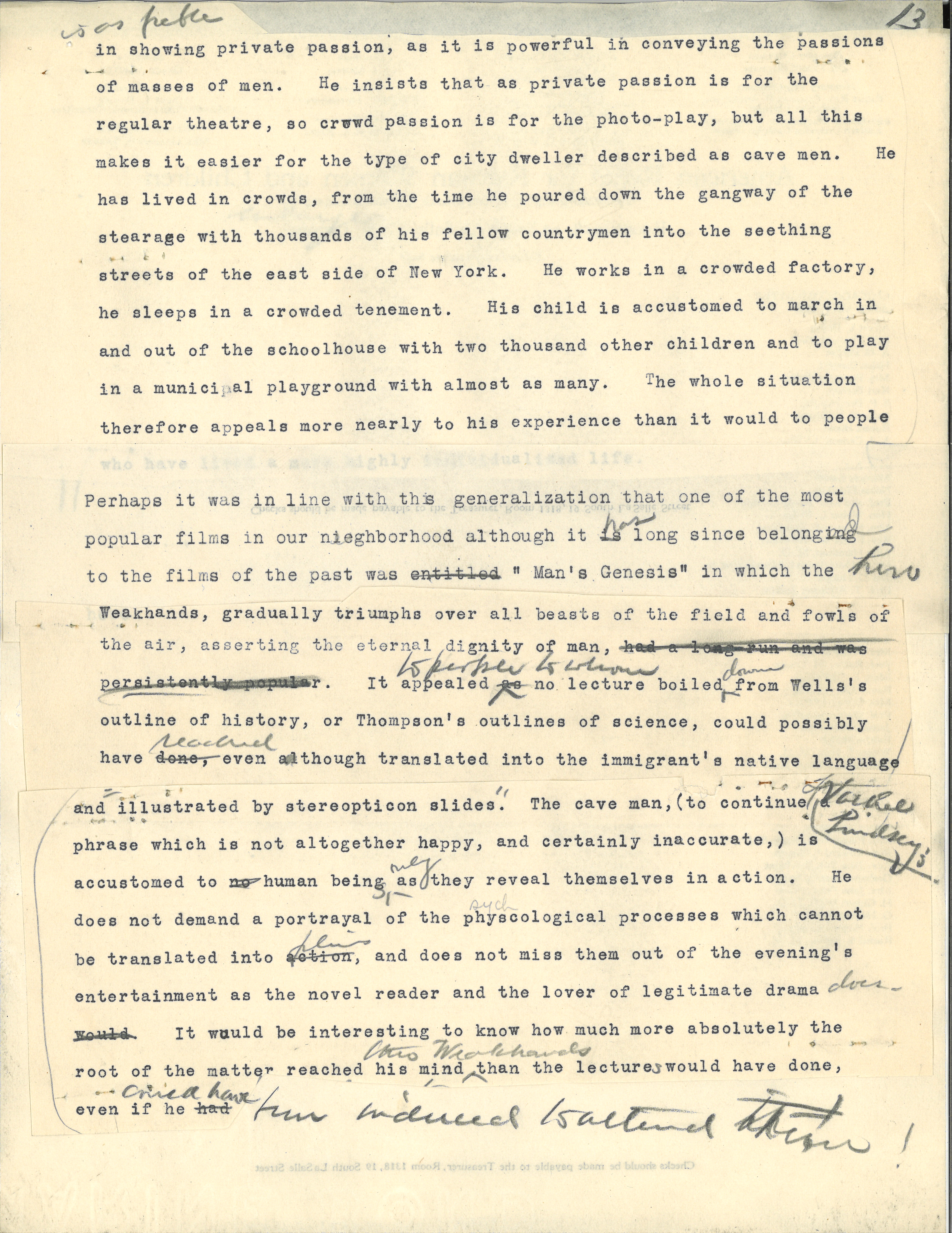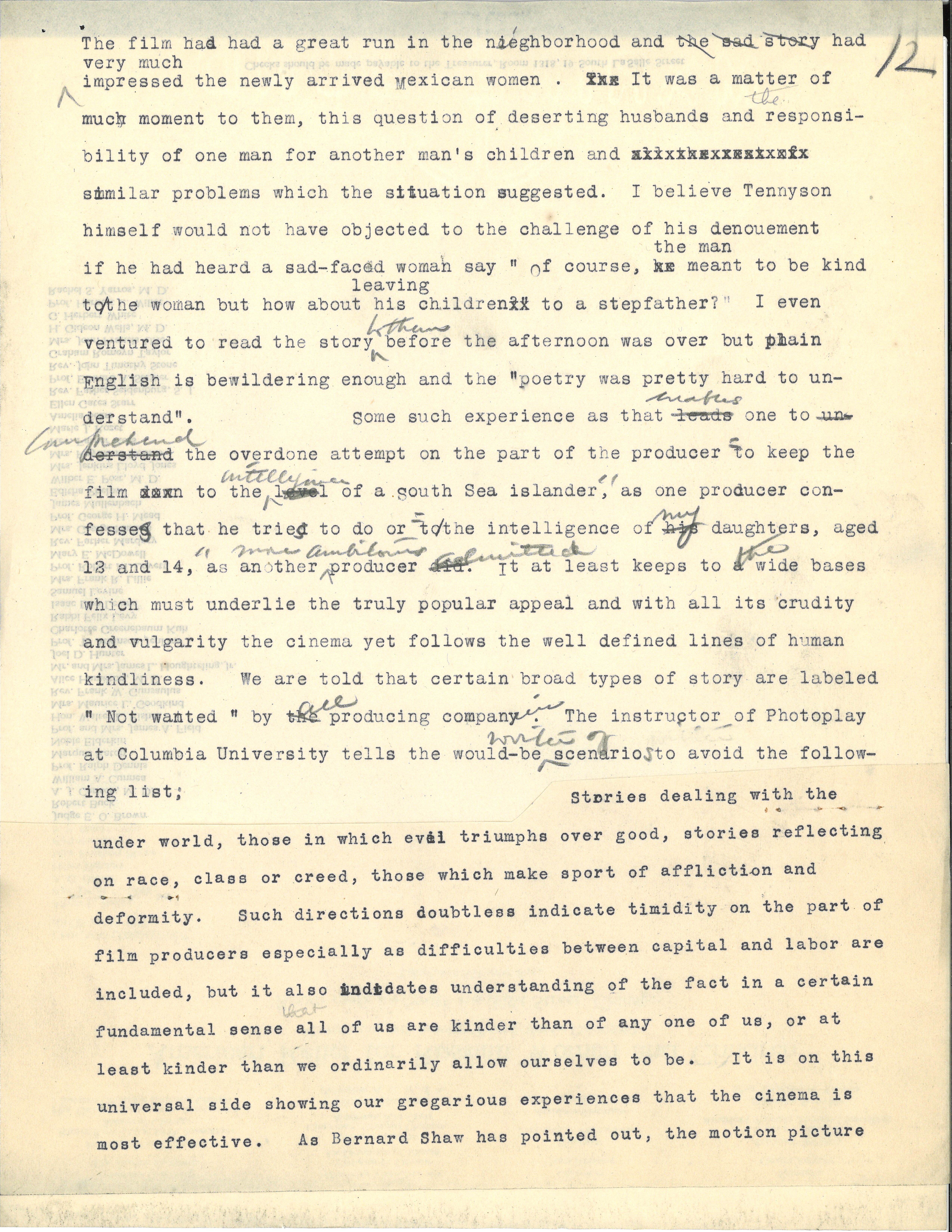 Perhaps we have not yet learned to use the like-mindedness which even the present stage of the cinema development affords us, ↑[although] we certainty find that we can talk over↓ many things with the young on the assumption that all of them in a given group have seen "Intolerance" for instance, or "The Birth of a Nation." just as I have discussed with a club of immigrant women the sad story of Enoch Arden, accurately knowing the mental pictures in each ↑mind.↓ [page 12] The film had a great run in the neighborhood and the sad story had ↑very much↓ impressed the newly arrived Mexican women. The It was a matter of much moment to them, this question of deserting husbands and ↑the↓ responsibility of one man for another man's children and [illegible] similar problems which the situation suggested. I believe Tennyson himself would not have objected to the challenge of his denouement if he had heard a sad-faced woman say "Of course, he ↑the man↓ meant to be kind to the woman but how about ↑leaving↓ his children to a stepfather?" I even ventured to read the story ↑to them↓ before the afternoon was over but plain English is bewildering enough and the "poetry was pretty hard to understand." Some such experience as that leads ↑makes↓ one to understand ↑comprehend↓ the overdone attempt on the part of the producer "to keep the film [illegible] to the ↑intelligence↓ level of a South Sea islander," as one producer confesses that he tries to do or "to the intelligence of his ↑my↓ daughters, aged 12 and 14," as another ↑more ambitious↓ producer did ↑admitted.↓ It at least keeps to a ↑the↓ wide bases which must underlie the truly popular appeal and with all its crudity and vulgarity the cinema yet follows the well defined lines of human kindliness. We are told that certain broad types of story are labeled "Not wanted" by the ↑all↓ producing companies. The instructor of Photoplay at Columbia University tells the would-be ↑writer of↓ scenarios to avoid the following list: Stories dealing with the under world, those in which evil triumphs over good, stories reflecting on race, class or creed, those which make sport of affliction and deformity. Such directions doubtless indicate timidity on the part of film producers especially as difficulties between capital and labor are included, but it also indicates understanding of the fact in a certain fundamental sense ↑that↓ all of us are kinder than any one of us, or at least kinder than we ordinarily allow ourselves to be. It is on this universal side showing our gregarious experiences that the cinema is most effective. As Bernard Shaw has pointed out, the motion picture [page 13] ↑is as feeble↓ in showing private passion, as it is powerful in conveying the passions of masses of men. He insists that as private passion is for the regular [theater], so crowd passion is for the photo-play, but all this makes it easier for the type of city dweller described as cave men. He has lived in crowds, from the time he poured down the gangway of the [steerage] with thousands of his fellow countrymen into the seething streets of the east side of New York. He works in a crowded factory, he sleeps in a crowded tenement. His child is accustomed to march in and out of the schoolhouse with two thousand other children and to play in a municipal playground with almost as many. The whole situation therefore appeals more nearly to his experience than it would to people who have lived a more highly individualized life. Perhaps it was in line with this generalization that one of the most popular films in our neighborhood although it is ↑has↓ long since belonged to the films of the past was entitled "Man's Genesis" in which the ↑hero↓ Weakhands, gradually triumphs over all beasts of the field and fowls of the air, asserting the eternal dignity of man had a long run and was persistently popular. It appealed ↑to people to whom↓ as no lecture boiled ↑down↓ from Wells's outline of history, or [Thomson's] outline of science, could possibly have done ↑reached↓ even though translated into the immigrant's native language and "illustrated by stereopticon slides." The cave man, (to continue ↑Vachel [Lindsay's]↓ phrase which is not altogether happy, and certainly inaccurate), is accustomed to no human beings ↑only↓ as they reveal themselves in action. He does not demand a portrayal of the psychological processes which cannot be translated into action ↑films↓ and does not miss them out of the evening's entertainment as the novel reader and the lover of legitimate drama ↑does↓ would. It would be interesting to know how much more absolutely the root of the matter reached his mind ↑[through] Weakhands↓ than the lectures would have done, even if he had ↑could have been induced to attend them!↓ [page 14]