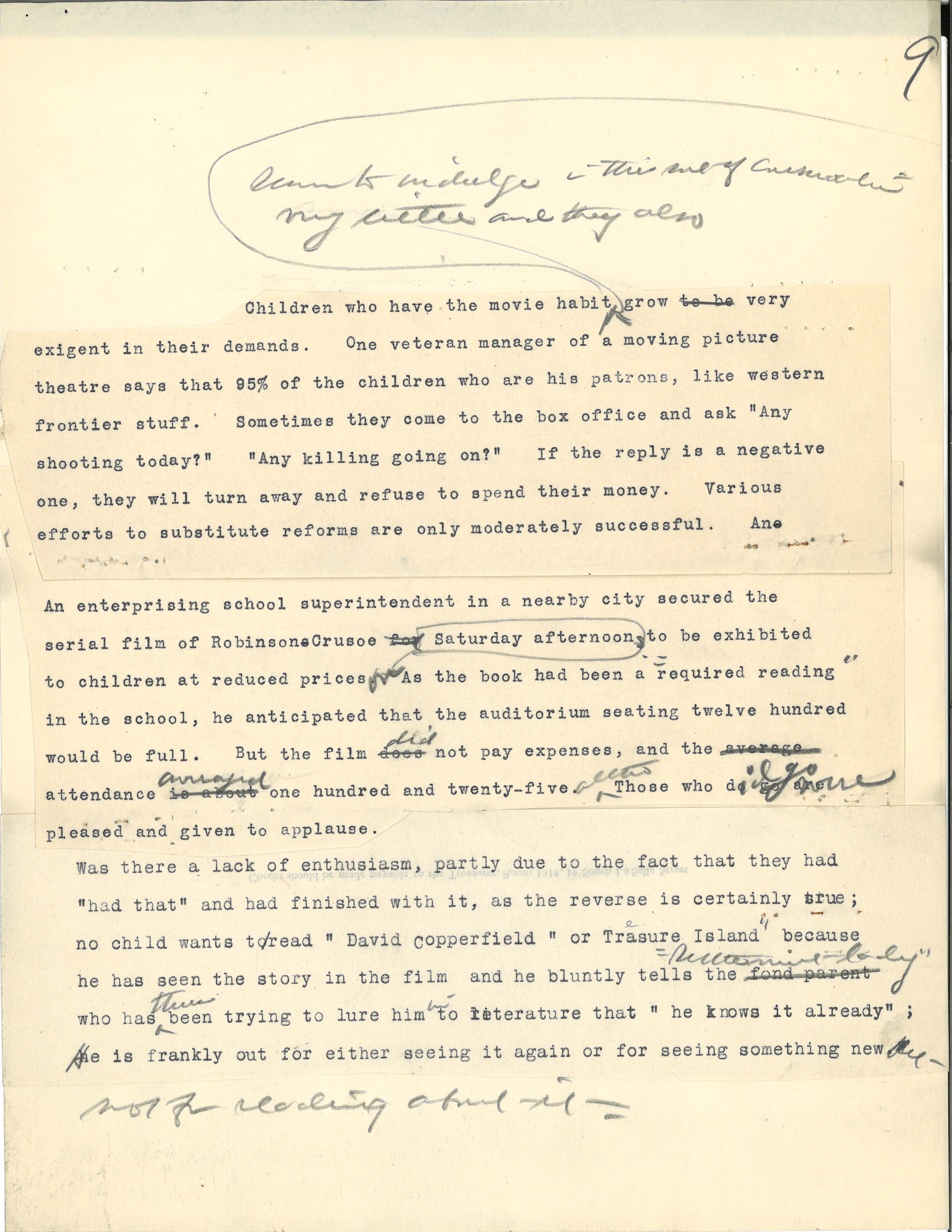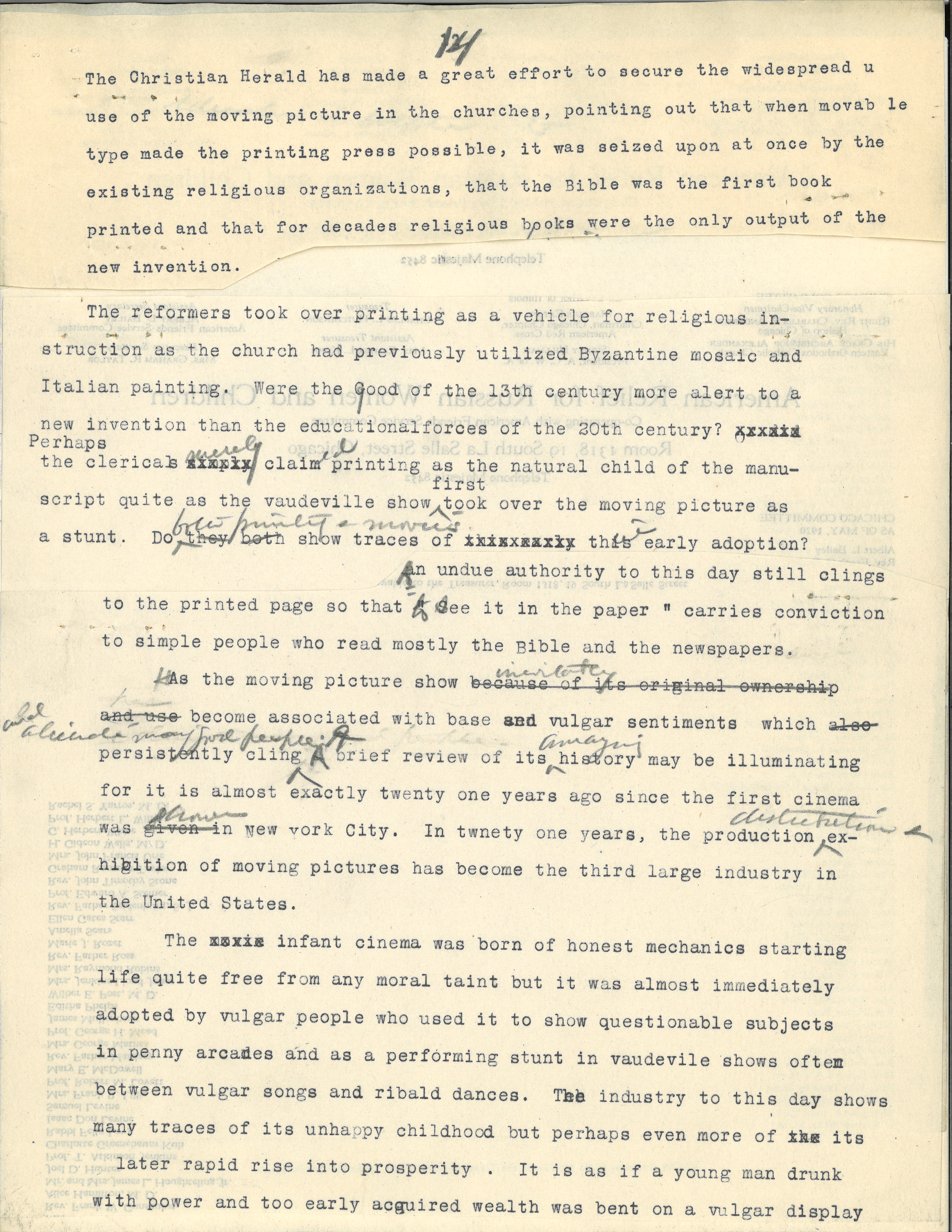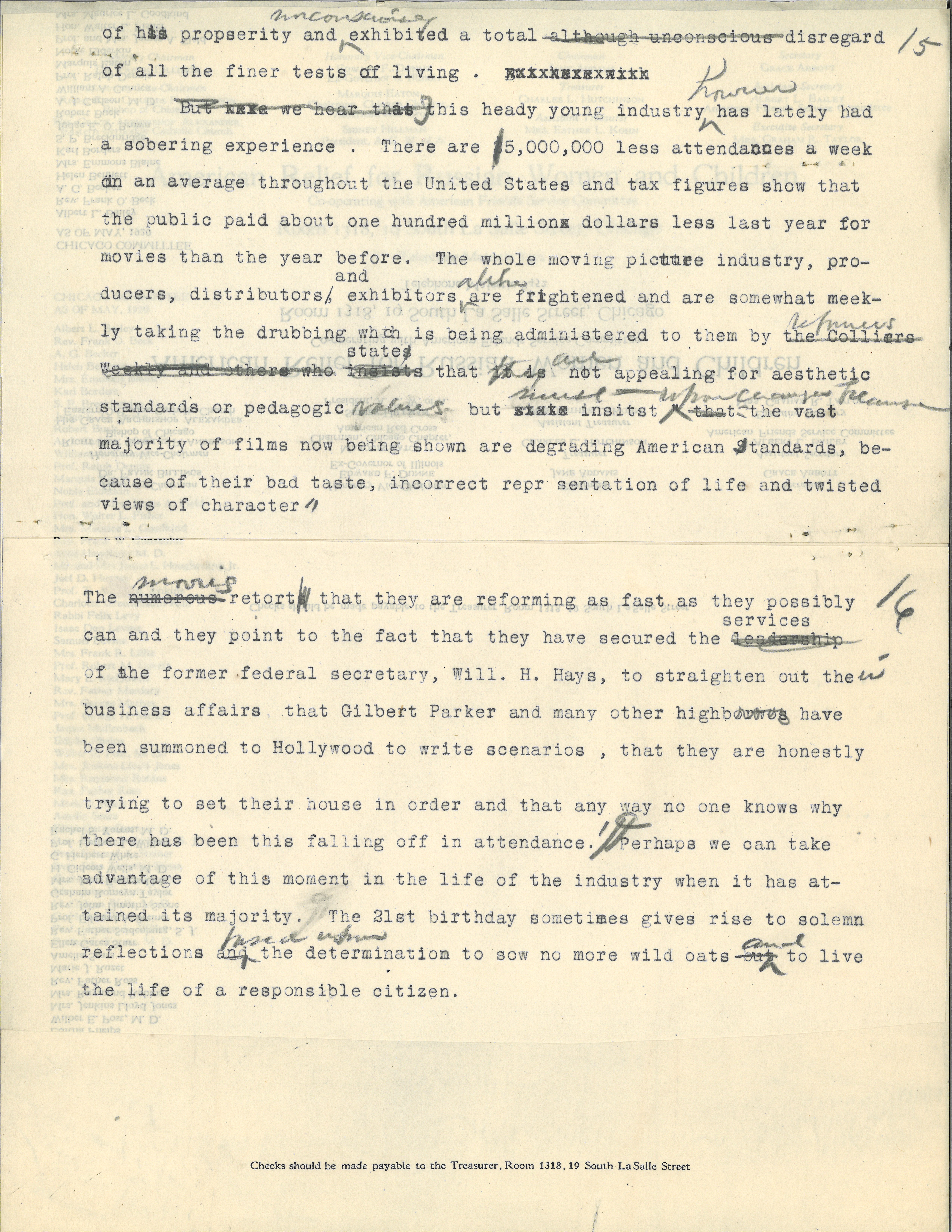 But [illegible] we hear that This heady young industry ↑however↓ has lately had a sobering experience. There are 5,000,000 less attendances a week on an average throughout the United States and tax figures show that the public paid about one hundred million dollars less last year for movies than the year before. The whole moving picture industry, producers, distributors, ↑and↓ exhibitors ↑alike↓ are frightened and are somewhat meekly taking the drubbing which is being administered to them by ↑reformers↓ the Colliers Weekly and others who insists ↑state↓ that [they] ↑are↓ not appealing for aesthetic standards of pedagogic ↑values↓ but [illegible] ↑must↓ [insist] ↑upon changes because↓ that "the vast majority of films now being shown are degrading American standards, because of their bad taste, incorrect representation of life and twisted views of character."
