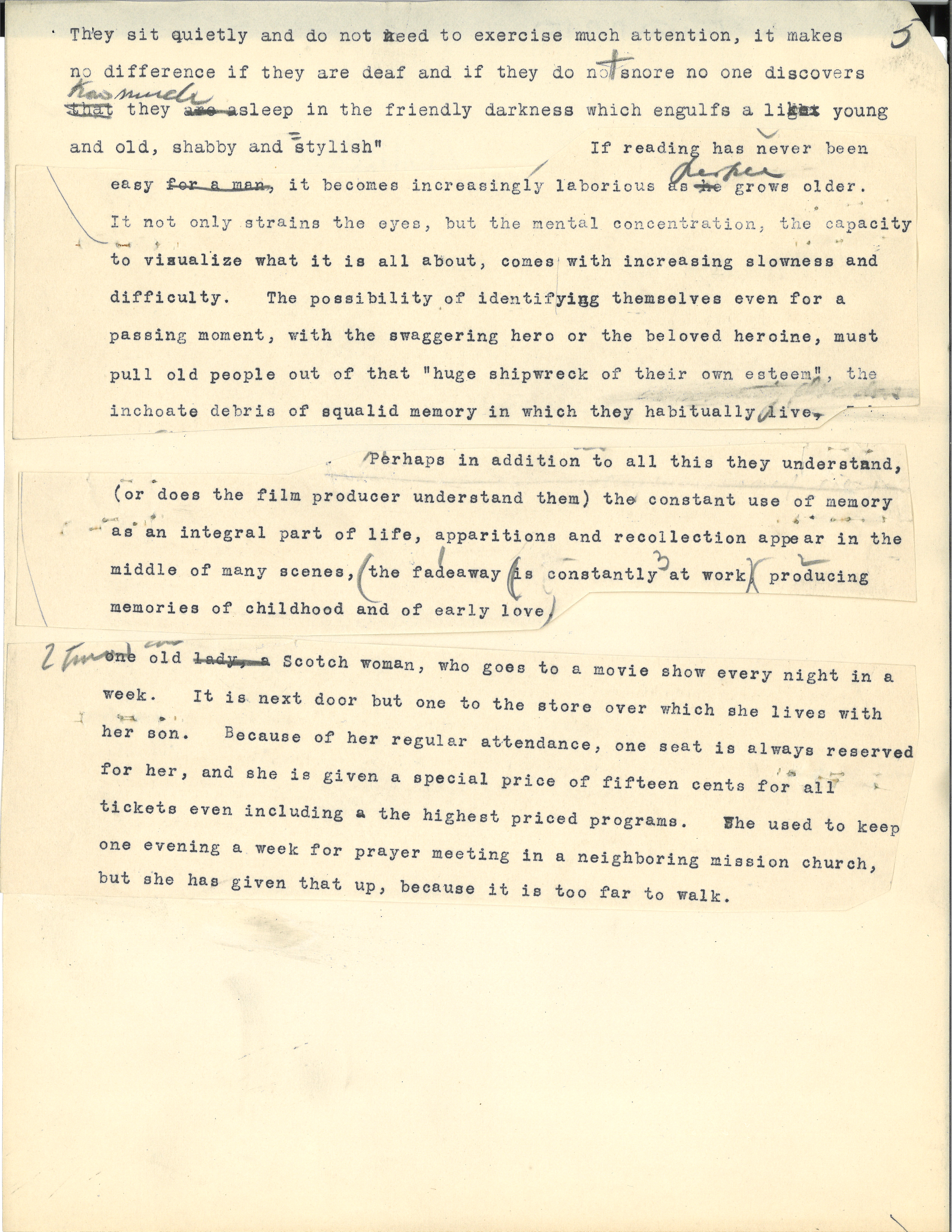 Nevertheless, we should be proud to place to our credit certain achievements of the present cinema in fulfilling a genuine human need; that of story telling, for instance, to the aged. I have been much impressed with the number of old people who attend the moving picture [theaters]. In the first place, the [theater] is near home so they do not need to walk more than a block or two. The appeal is striking enough to break though that vagueness and mistiness which so easily surrounds the faculties of the old and outworn. [page 5] They sit quietly and do not need to exercise much attention; it makes no difference if they are deaf and if they do not snore no one discovers that ↑how much↓ they are [sleep] in the friendly darkness which engulfs [alike] young and old, shabby and "stylish."